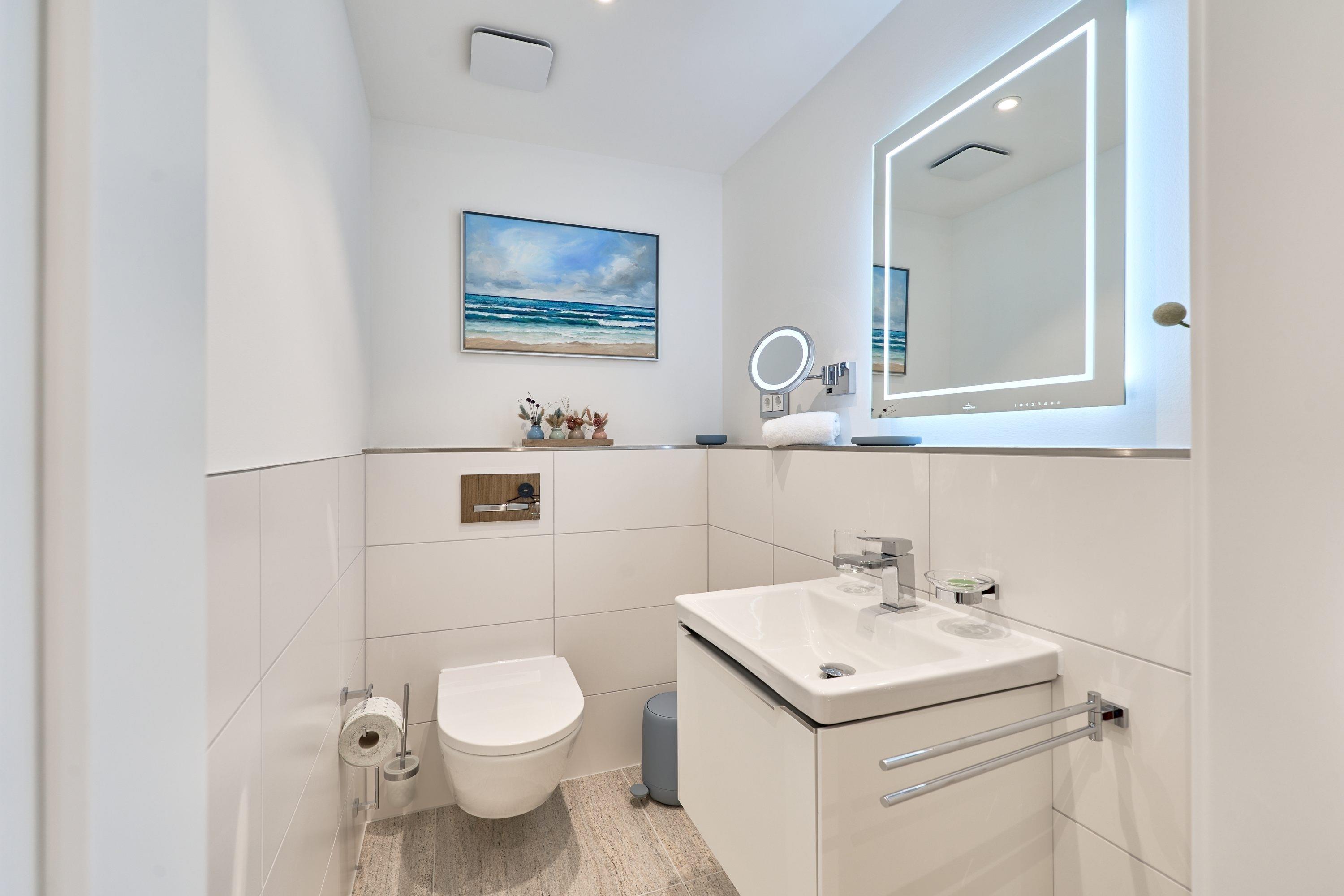 Gäste-WC: Im Gäste-WC von Villeroy [&] Boch stehen Ihnen ein Waschtisch mit Unterschrank und ein beleuchteter Kosmetikspiegel zur Verfügung.