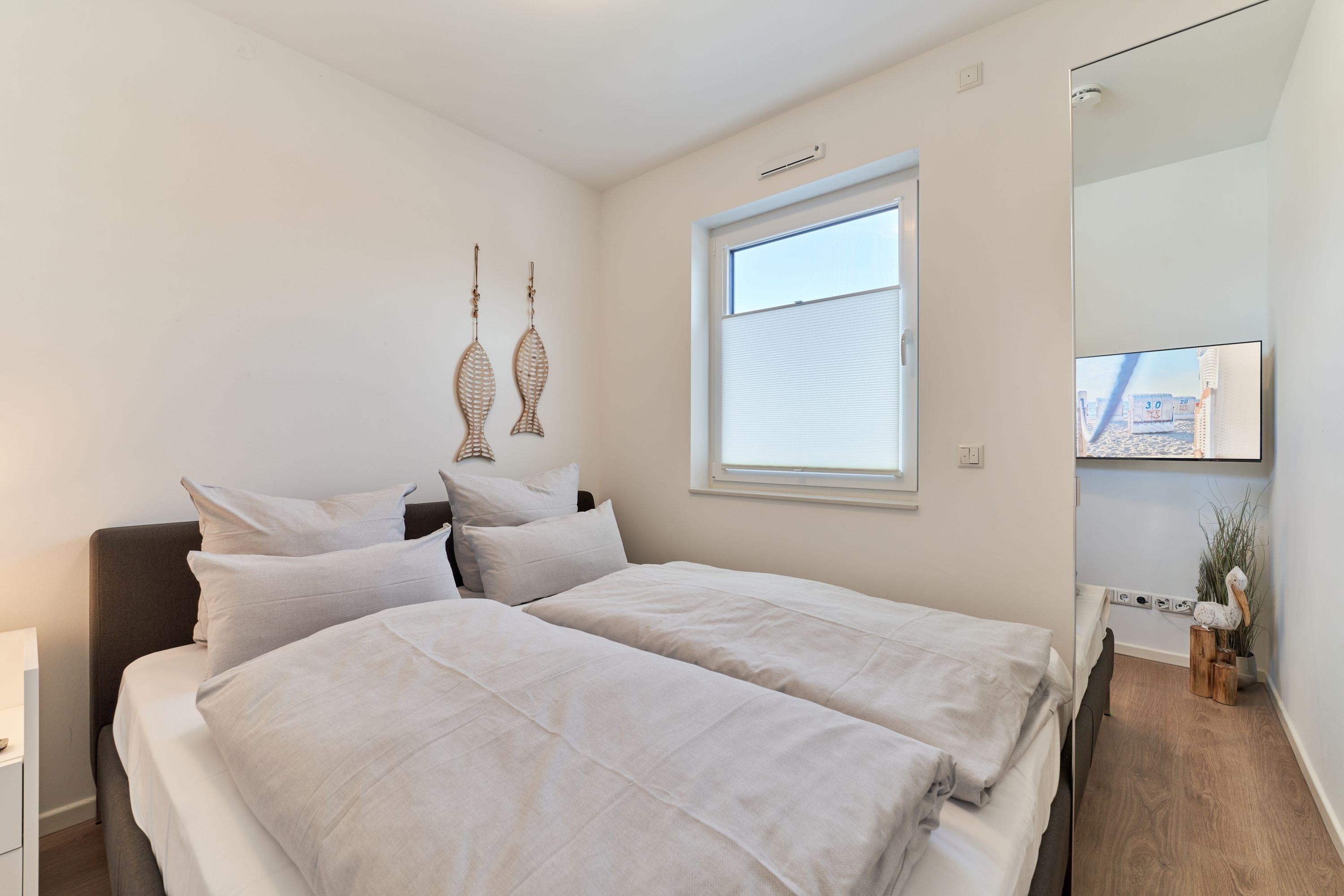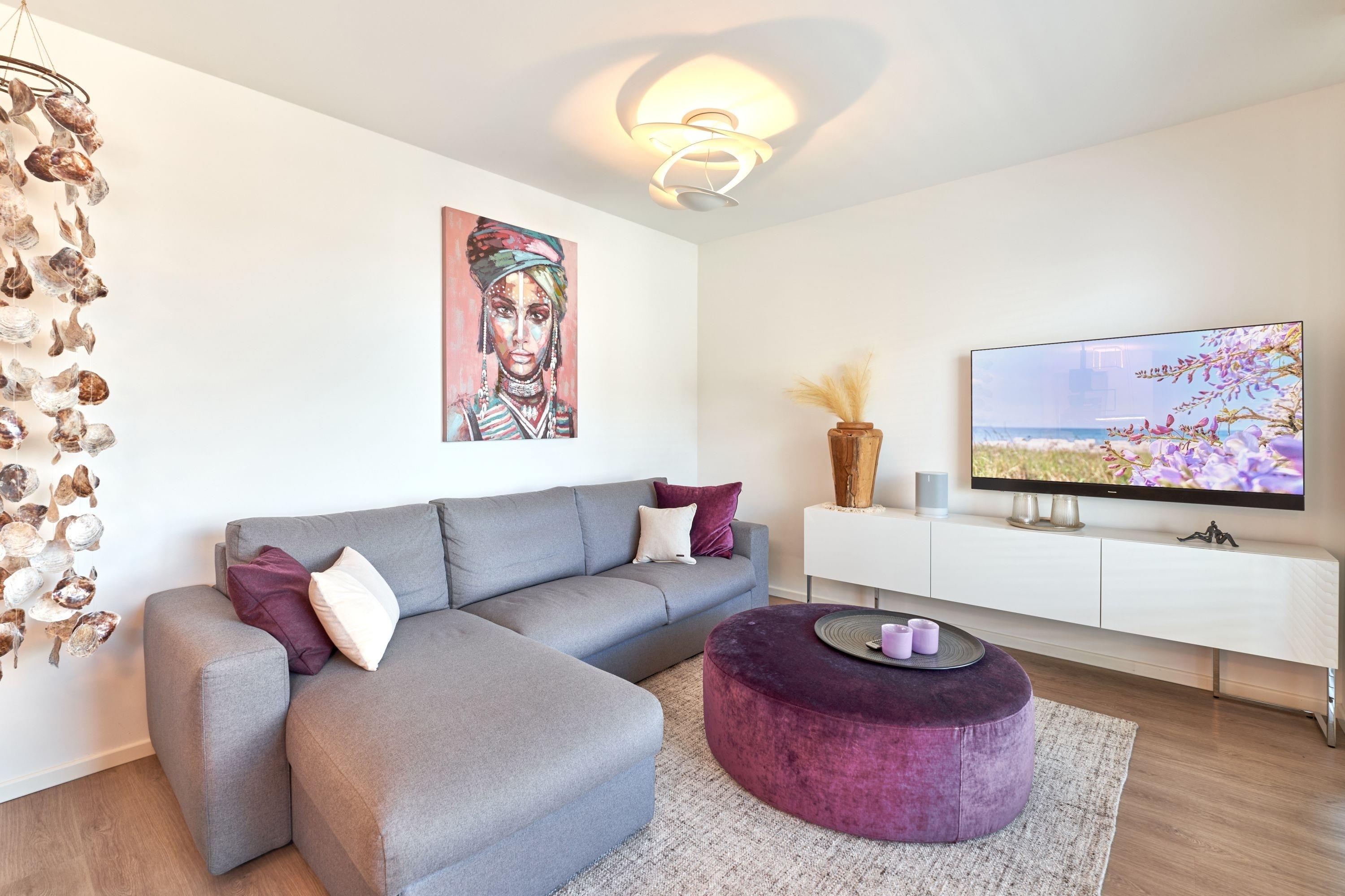 Im Wohnzimmer stehen Ihnen ein OLED-TV-Gerät, ein TechniSat-Digitradio und eine SONOS-Soundbox zur Verfügung. Weiterhin wartet auf Sie ein anspruchsvoller Wohn-Essbereich.[nbsp] Vom Sofa aus haben Sie einen weiteren Teil-Ostseeblick. Großer runder Esstisch, der sich auch für fröhliche Spielabende eignet. Das erste Schlafzimmer ist mit einem sehr bequemen Doppelbett (1,80m x 2,00m), einem OLED-TV-Gerät, einem Kleiderschrank sowie Nachttischen ausgestattet. Im 2. Schlafzimmer stehen ein ebenso hochwertiges Doppelbett (1,80mx2,00m), ein OLED-TV-Gerät und ein kleiner Kleiderschrank für Sie bereit. [nbsp] Das Tageslicht-Duschbad ist mit einem Handtuchheizkörper sowie einer bodengleichen Dusche ausgestattet. Kosmetikspiegel sowie ein Haartrockner sind hier selbstverständlich vorhanden.