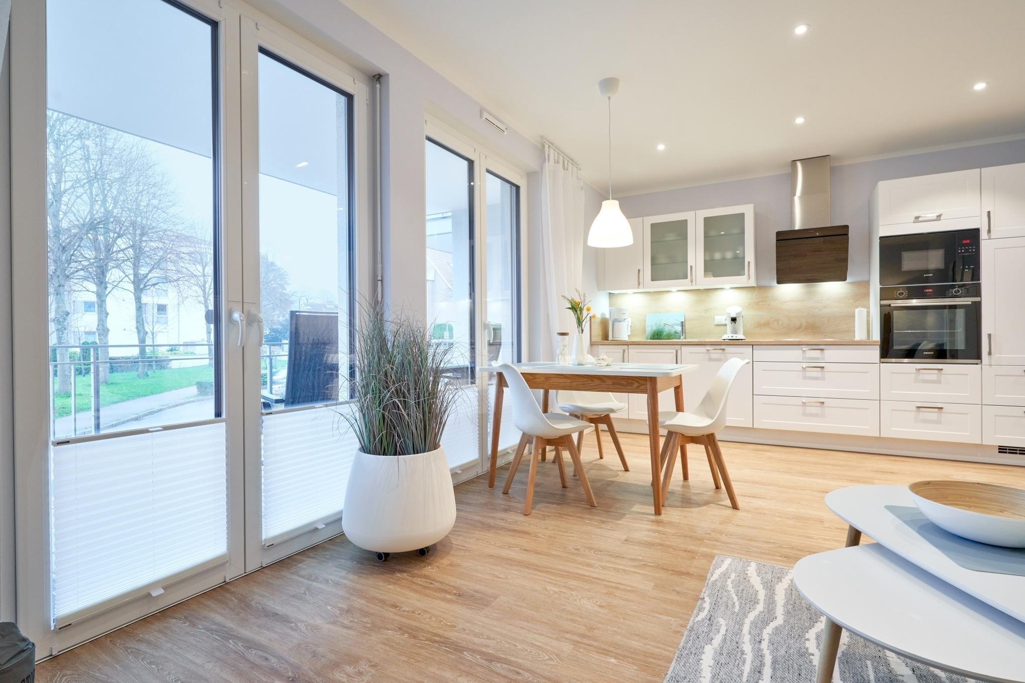 Die 2-Zimmer-Ferienwohnung ist mit bodentiefen Fenstern ausgestattet. An allen Fenstern befinden sich Licht- und Sichtschutz sowie Außenrollläden. Die hochwertige Nobilia-Einbauküche im Wohn-Essbereich ist komplett ausgestattet und lässt keine Wünsche offen; Küchenzeile mit erhöhtem Backofen, Ceran-Kochfeld, Mikrowelle, Geschirrspüler, Kühlschrank mit Gefrierfach, Filterkaffeemaschine mit Thermoskanne, Senseo-Kaffeemaschine, Senseo-Milchaufschäumer, Eierkocher, Mixer, Toaster und Wasserkocher. Der Wohnbereich ist mit einem hochwertigen Sofa, einem Wohnzimmertisch, einem schwenkbaren Smart-TV sowie einem Essbereich ausgestattet. Aus dem Wohnbereich gelangen Sie auf den herrlichen, überdachten Süd-Ost-Balkon. Hier stehen Ihnen Tisch und Stühle zur Verfügung. Das Schlafzimmer ist mit einer hochwertigen Nolte-Bettanlage, Bettengröße 1,80mx2,00m, einzelnen Schlaraffia-Matratzen in H2 und H3 ausgestattet. Kleiderschrank, 2 Nachttische sowie ein Wand-TV. Sind Sie es gewohnt, im Dunkeln zu schlafen? Kein Problem, denn es stehen Ihnen elektrische Außenrollläden zur Verfügung. Das Duschbad in heller Optik mit bodengleicher Dusche / Regendusche, mit separater Handbrause, Handtuchheizkörper, Fön, Kosmetikspiegel, Bad-WLAN-Radio. Die gesamte Wohnung ist mit einer Fußbodenheizung ausgestattet.
