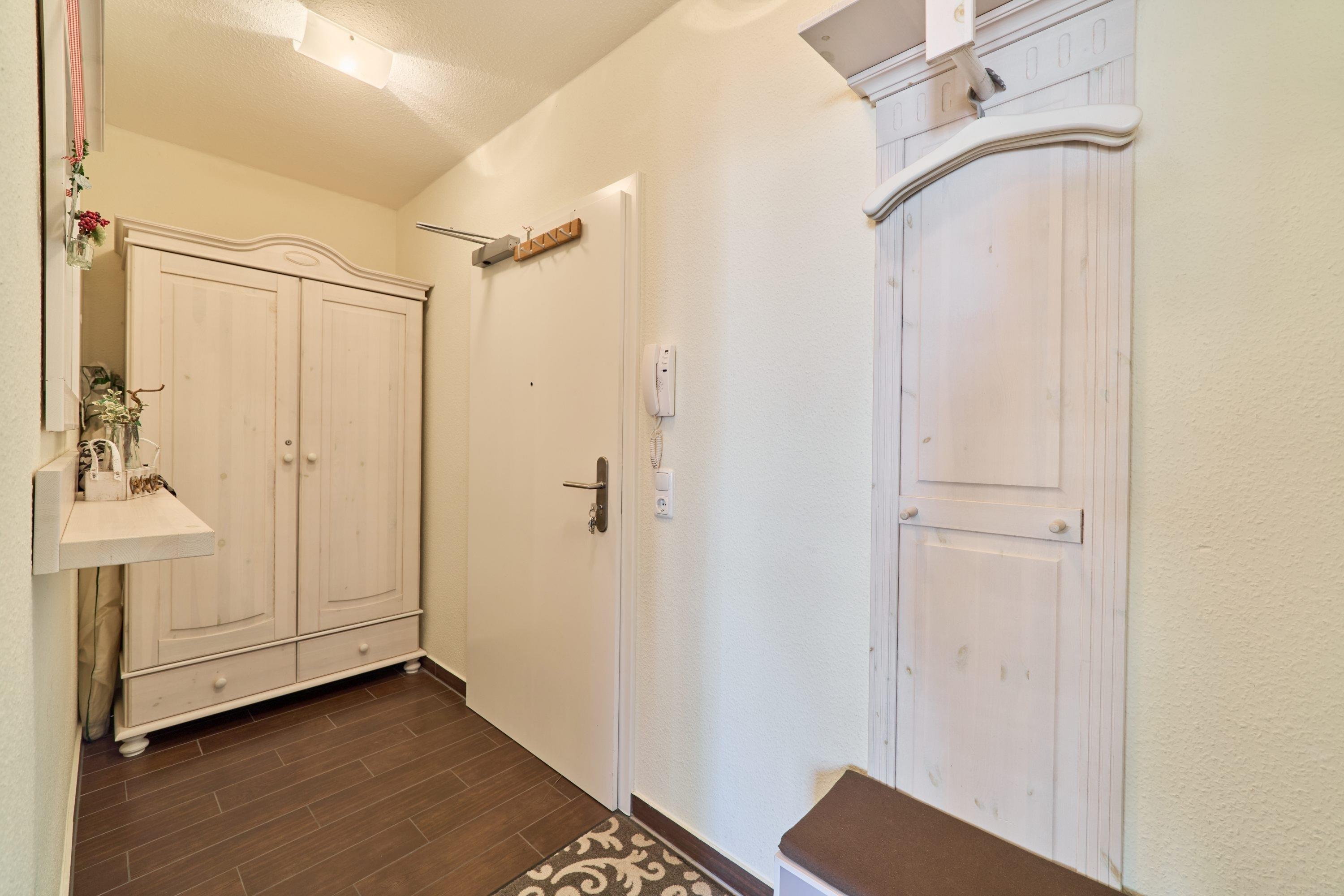 Das Schlafzimmer ist mit einem Doppelbett (1,60x2,00m – verstellbare Lattenroste) und einem TV ausgestattet. Angrenzend befindet sich das halbe Zimmer, welches ebenfalls als Schlafzimmer genutzt werden kann, mit einem großen Kleiderschrank sowie einem Einzelbett der Größe 0,90x2,00m. Das Badezimmer ist mit Fußbodenheizung ausgestattet und verfügt über eine Dusche (hoher Einstieg), einen Handtuchheizkörper sowie über ein Radio, einen Kosmetikspiegel und einen Föhn.