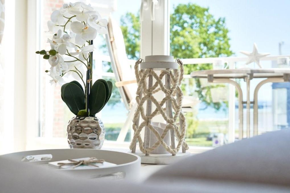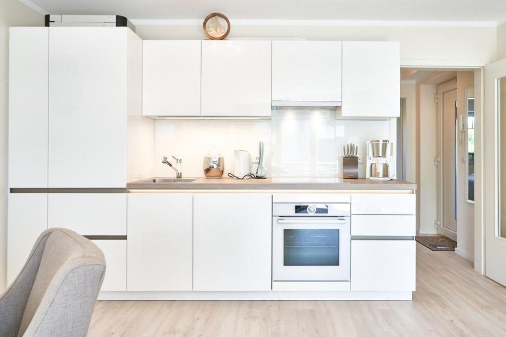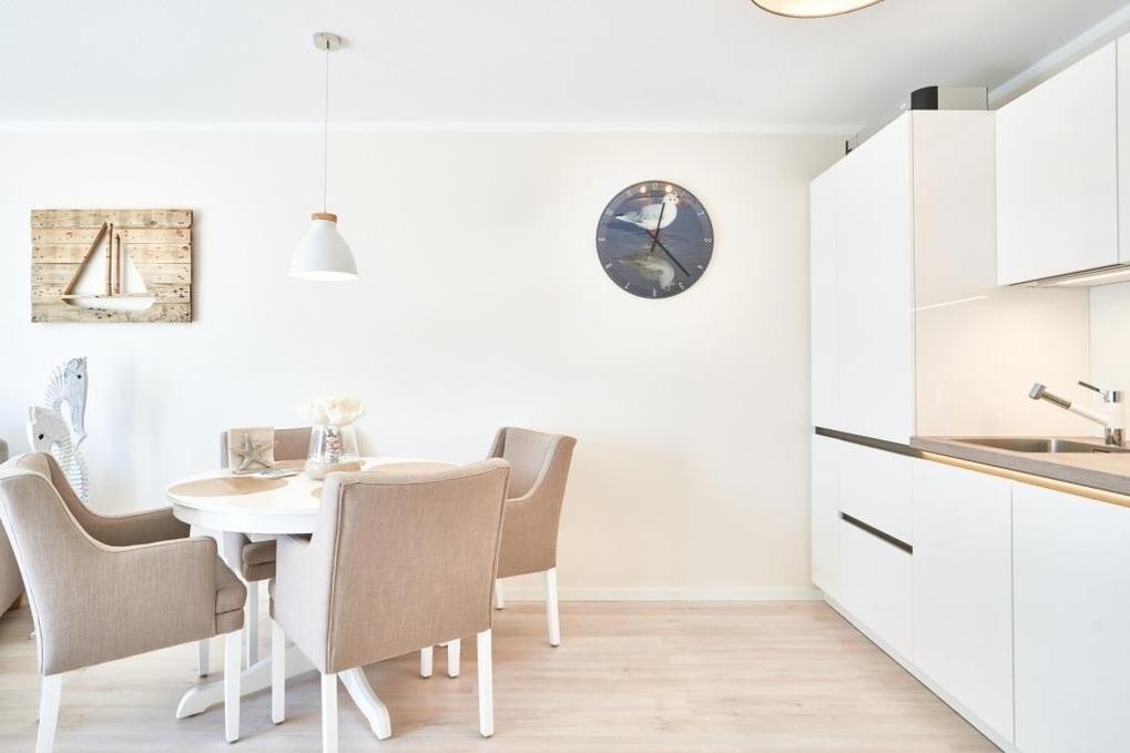 Das Duschbad ist in heller Optik gehalten. Der ansprechende Wohnbereich ist mit einer schönen Küchenzeile, einem Essbereich sowie einem gemütlichen Wohnbereich mit einer Sofaecke (Schlafsofa) ausgestattet. Neben einem Flachbildfernseher steht Ihnen selbstverständlich kostenloses WLAN zur Verfügung. Vom Wohnbereich aus gelangen Sie auf den Balkon. Von hier haben Sie einen schönen Ostseeblick. Die helle Küche lässt keine Wünsche offen. Der Esstisch bietet Ihnen ausreichend Platz für gesellige Stunden.