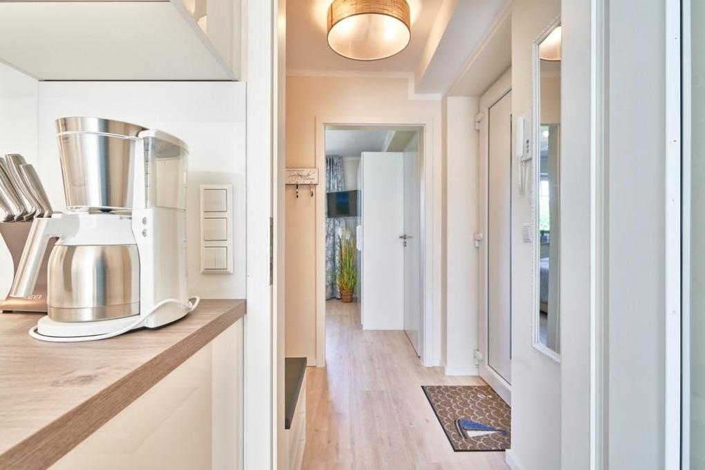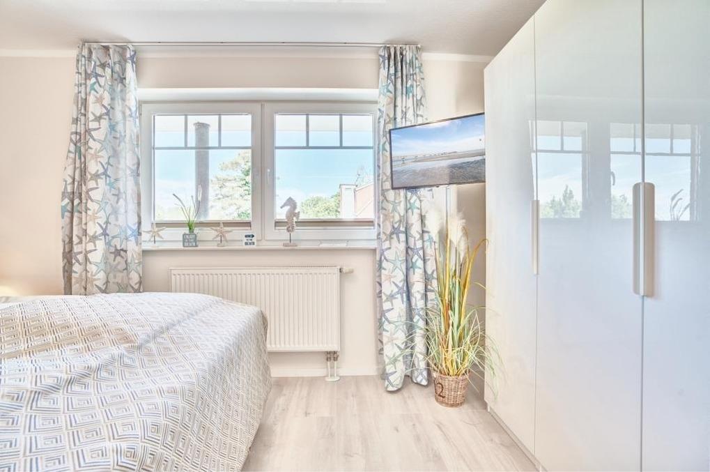 Der Eingangsbereich ist mit einer Garderobe ausgestattet. Das Schlafzimmer hat ein Boxspringbett (180 x 200m), zwei Nachttische sowie einen Kleiderschrank. Verdunkeln lässt sich das Schlafzimmer über ein Verdunklungsrollo sowie einen Verdunklungsvorhang.