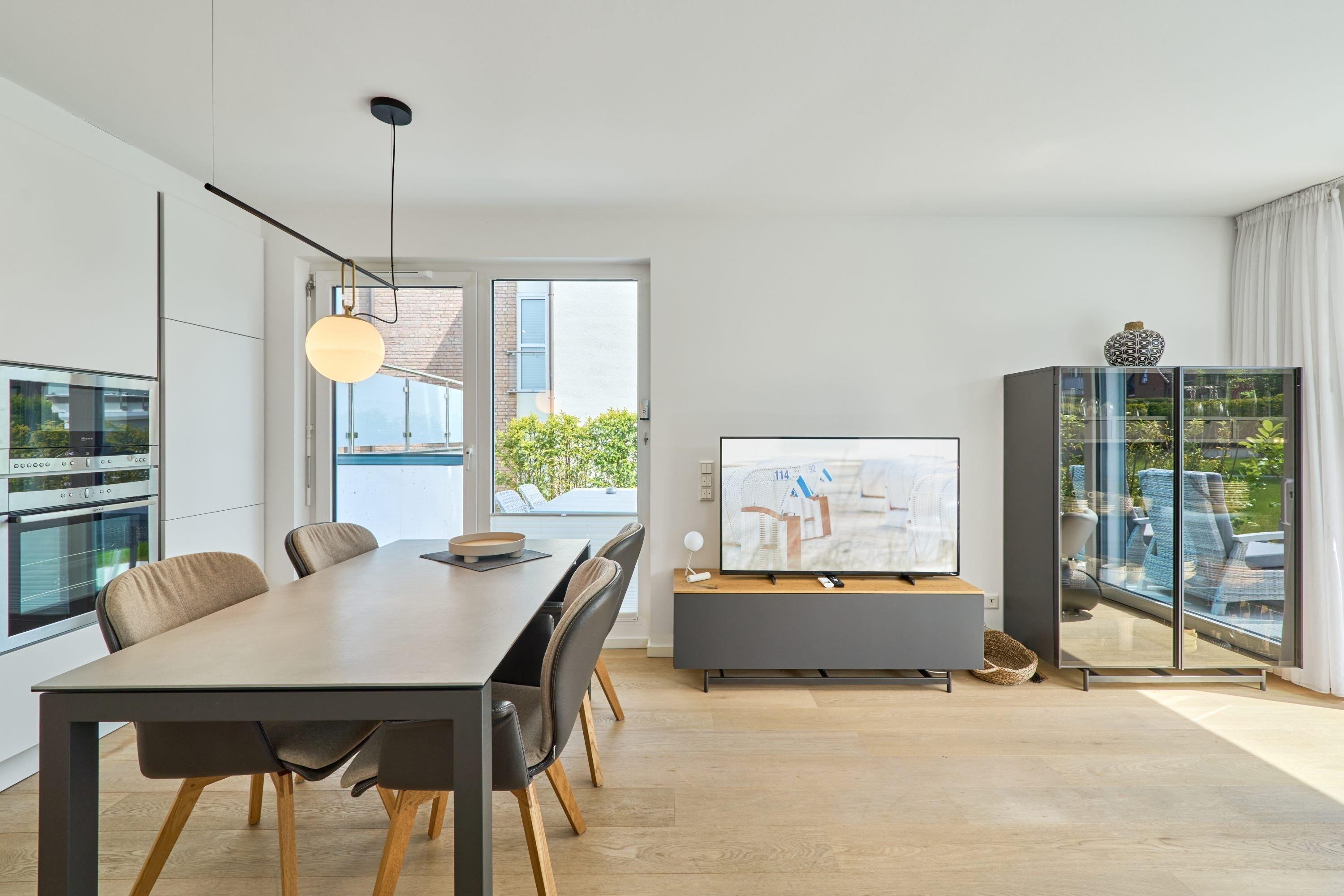 Sehr hochwertig eingerichtete Wohnung mit zwei großen Terrassen. Auf der einen Terrasse stehen Ihnen ein Tisch mit 4 Stühlen zur Verfügung, hier können Sie z. B. Ihr Frühstück genießen, zwei Liegestühle und ein Strandkorb laden Sie zum Faulenzen und Sonnenbaden auf der zweiten Terrasse ein. Der Wohn-Essbereich ist komplett ausgestattet und lässt keine Wünsche offen; Küchenzeile mit Cerankochfeld, Dunstabzug, Geschirrspüler, Filterkaffeemaschine sowie Pad-Kaffeemaschine. Einbauschrank mit einem Backofen, einer Mikrowelle und einem Kühlschrank incl. Gefrierfach. Feiner Essbereich, von hier haben Sie Zugang zur ersten Terrasse, kurze Wege zum "draußen" essen. Der Wohnbereich ist mit einem bequemen Sofa ausgestattet, die Unterhaltungstechnik ist auf dem neuesten Stand: TV sowie Stereoanlage mit Bluetooth. Vom Wohnbereich gelangen Sie auf die zweite Terrasse nach Süden.
