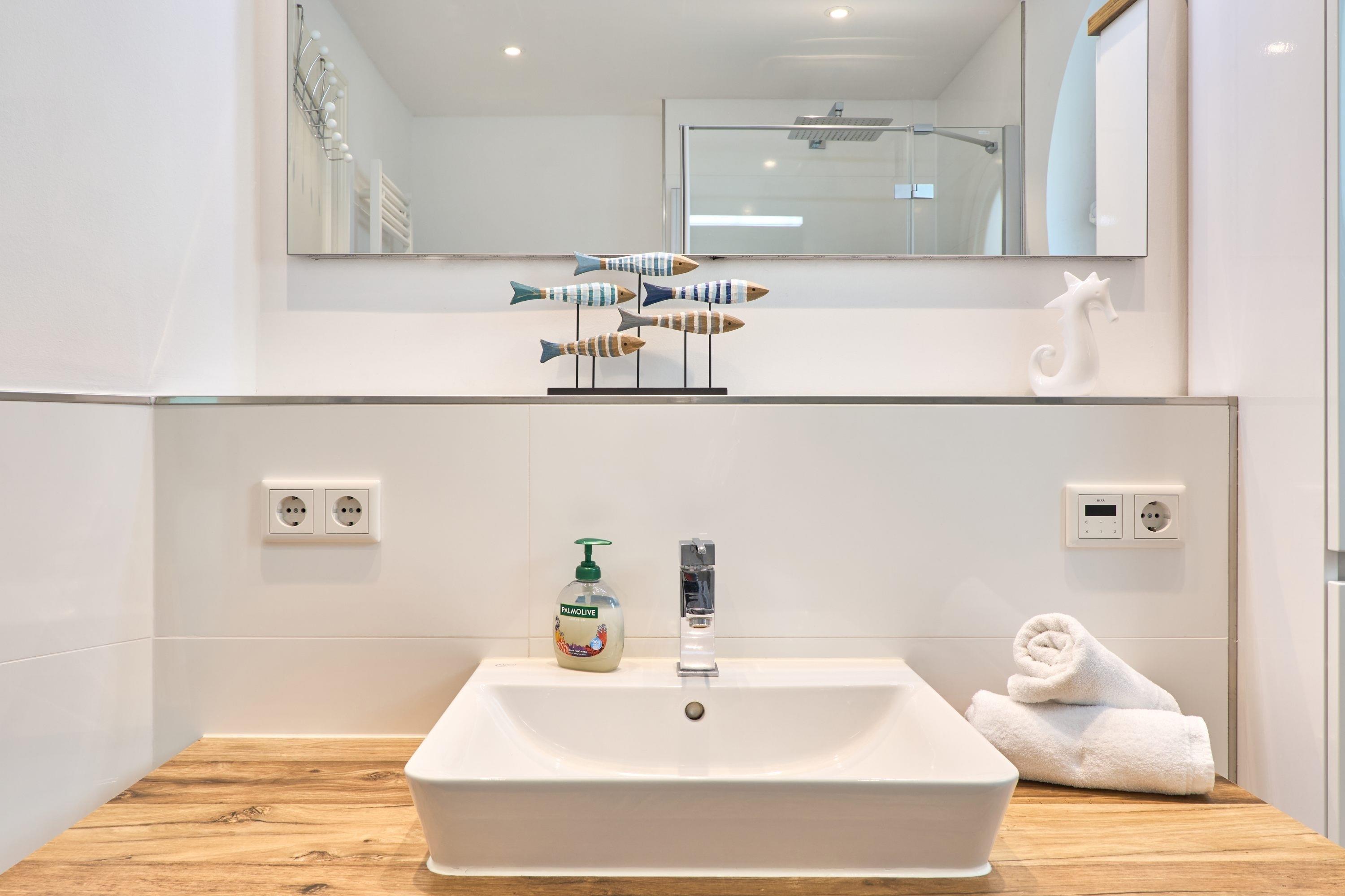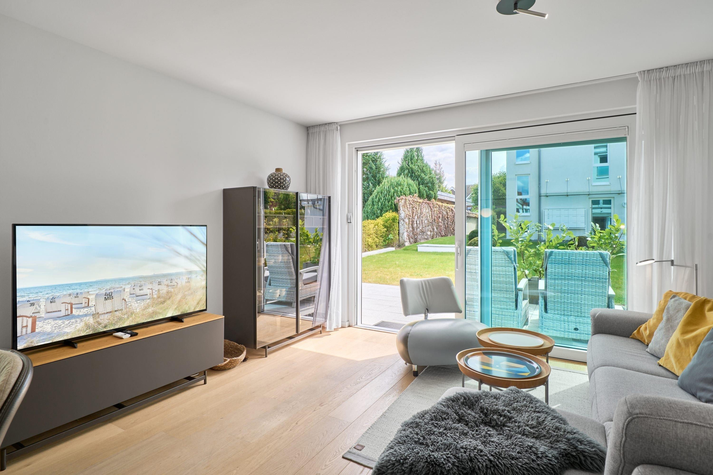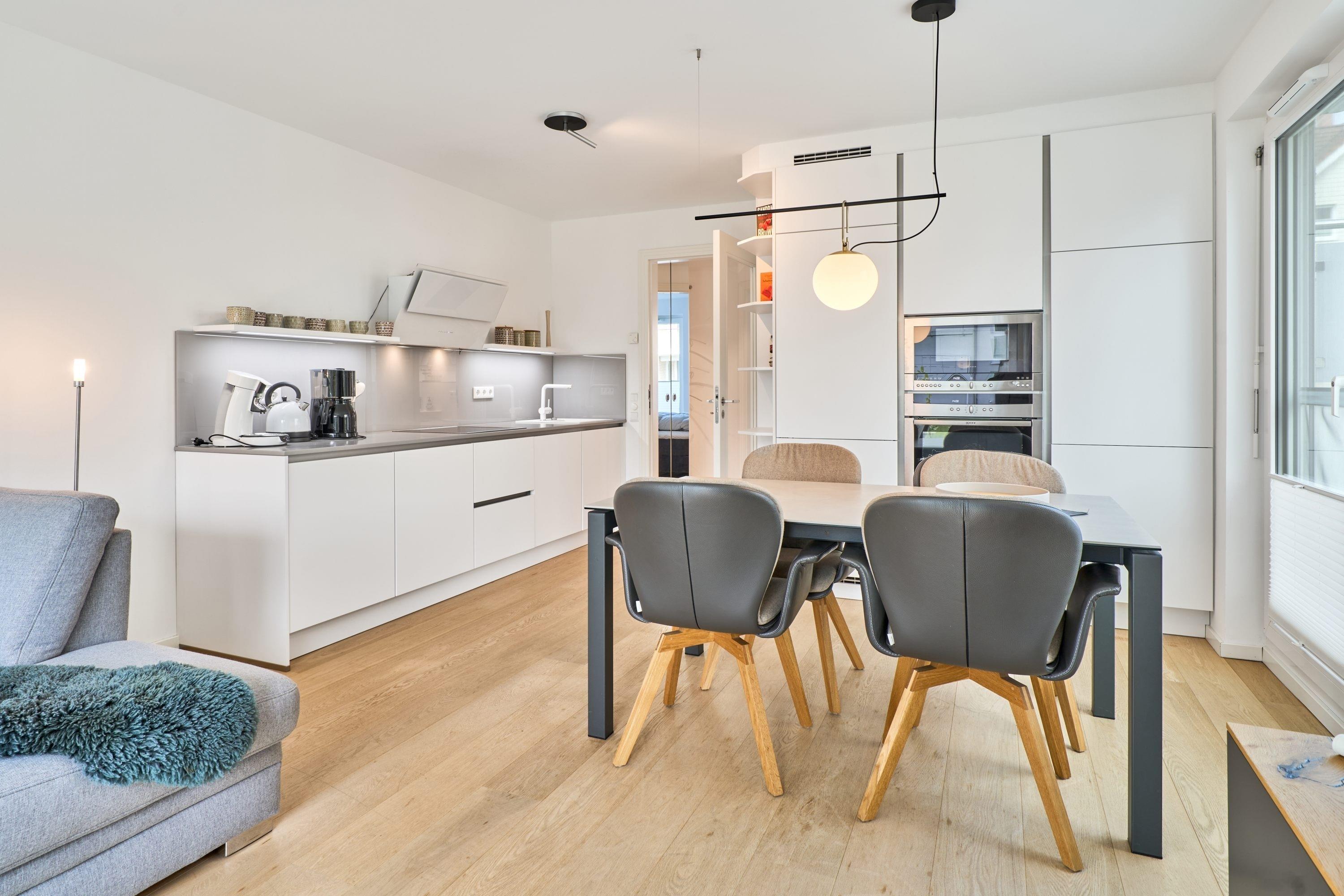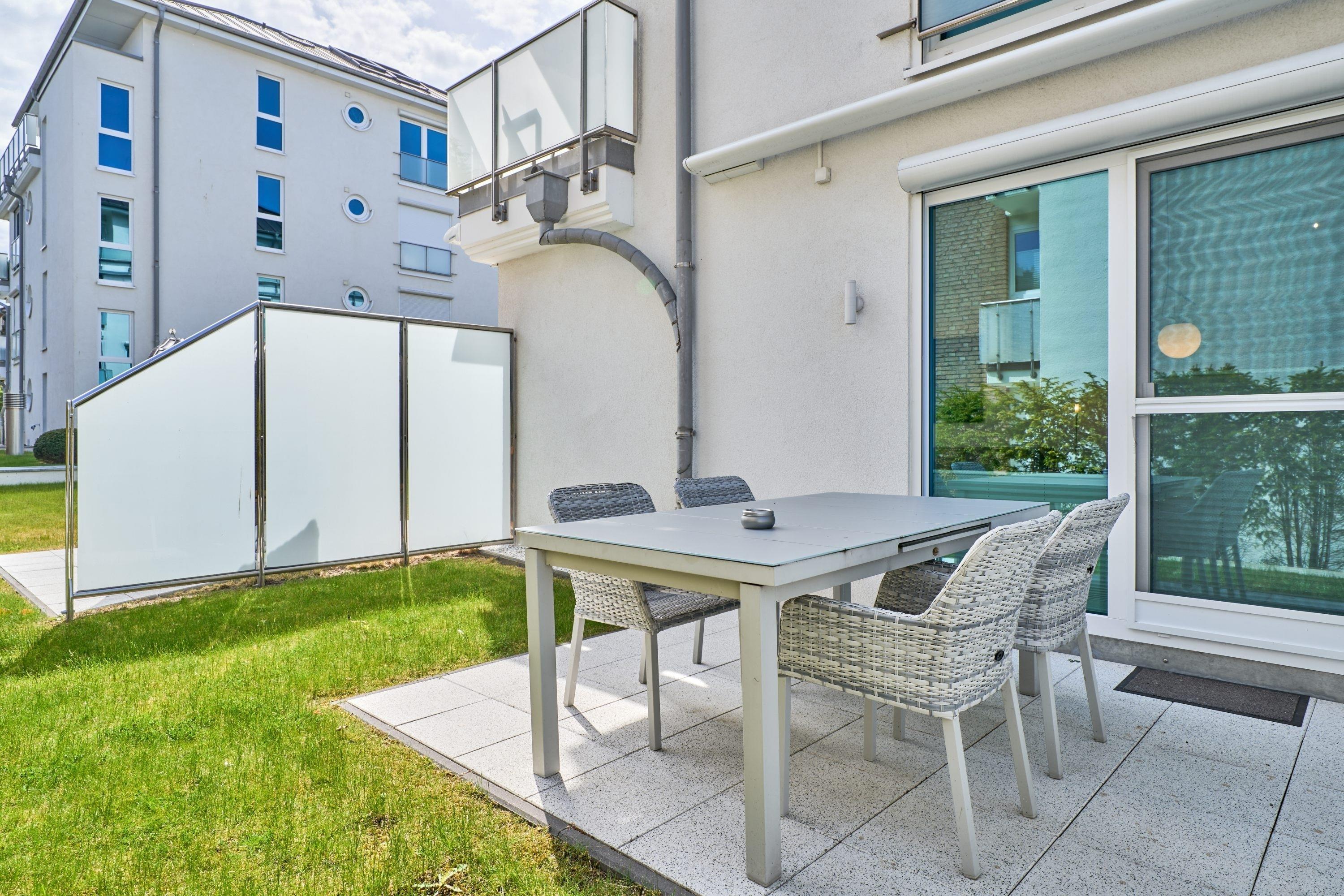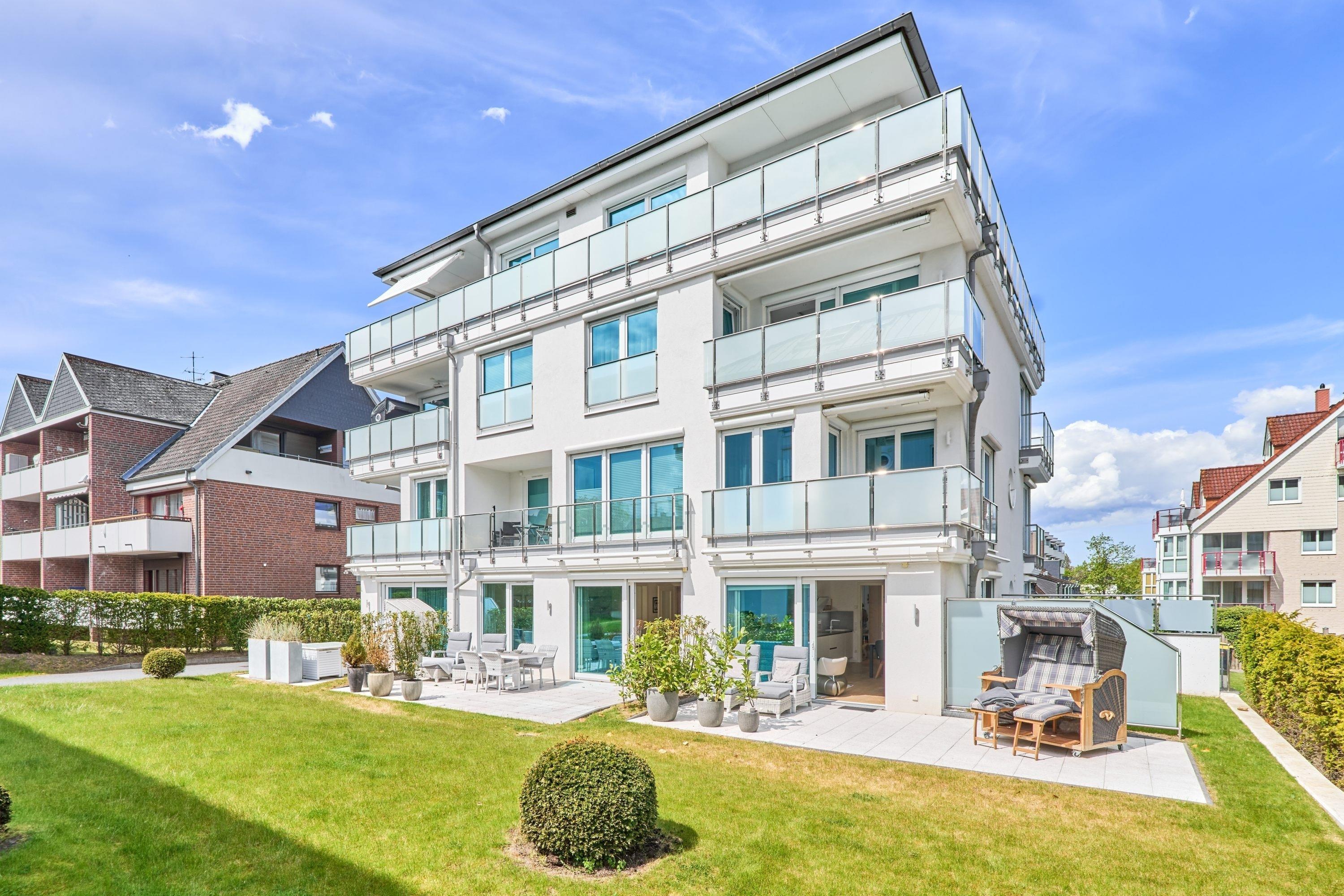 Hochwertige 3-Zimmer Ferienwohnung, ca. 54 m², Außenrollläden, Markise, kostenfreies WLAN, Tiefgaragenstellplatz(Höhe 2.00 m) Fahrradkeller. Strandkorb am nahegelegenen Strand (saisonbedingt 15.05. - 15.09.) inklusiv.