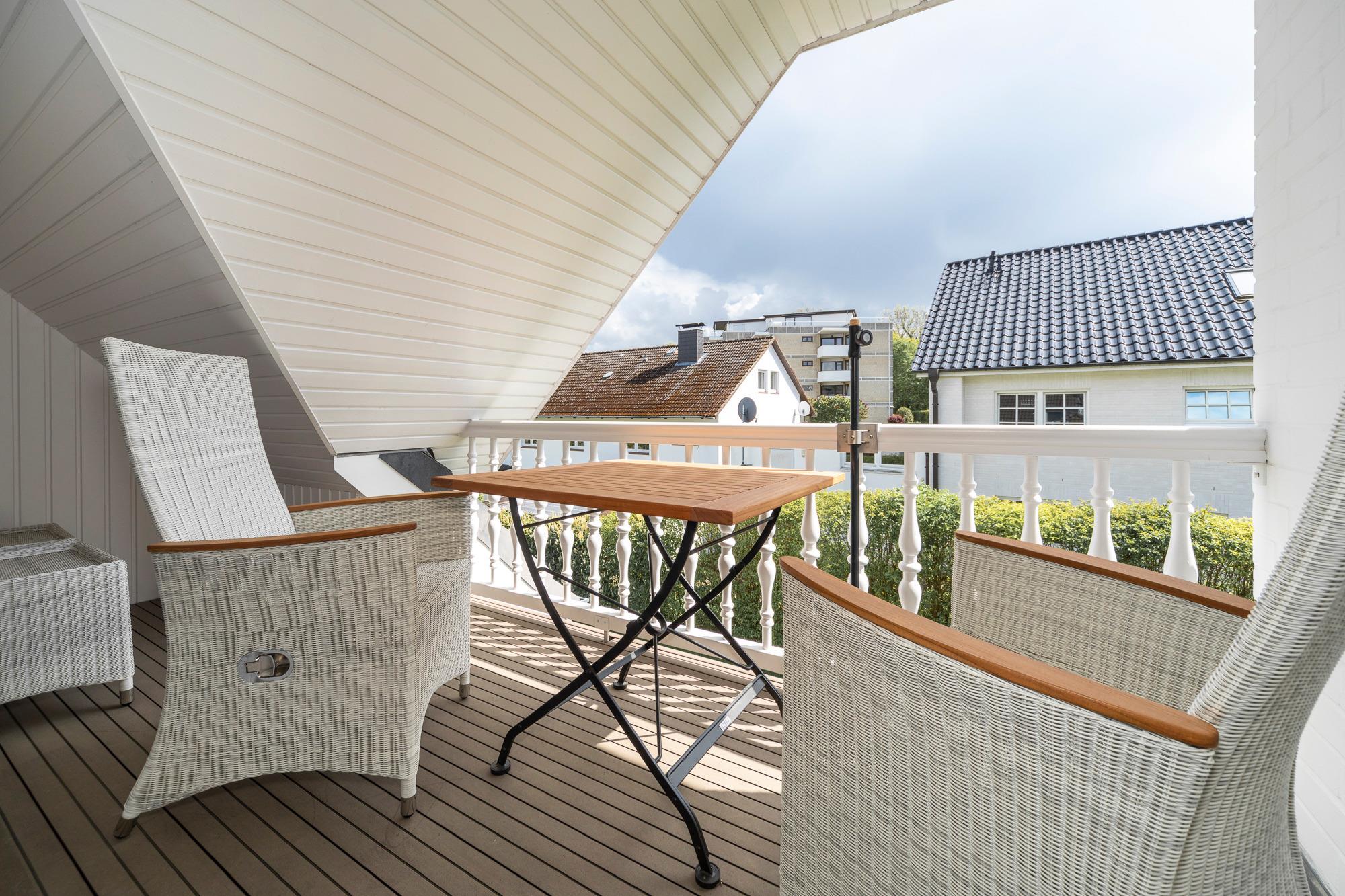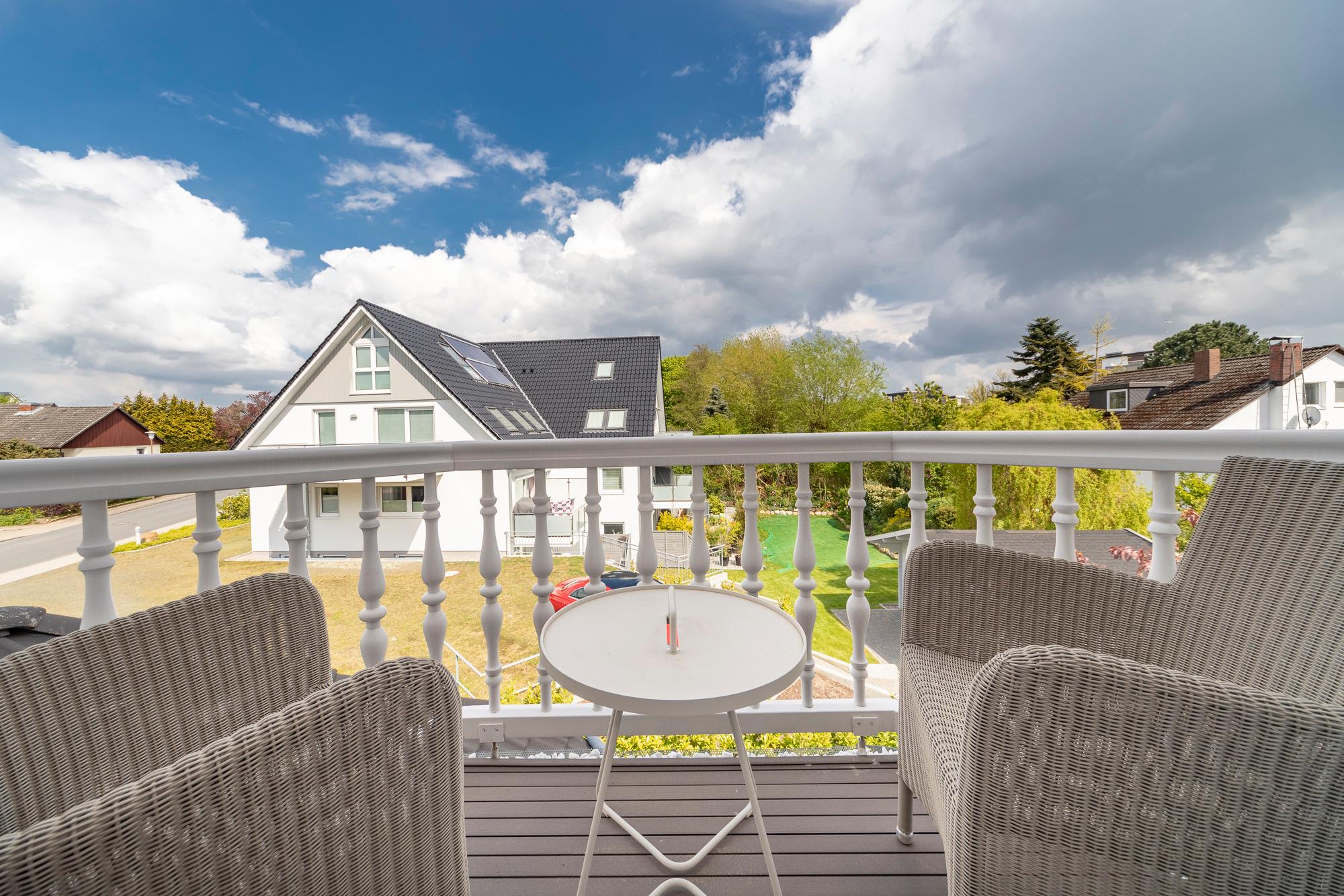 Moderne Ferienwohnung mit zwei Balkonen, Strandkorb und Fahrradgarage in Scharbeutz, ideal für ruhigen Ostseeurlaub.
