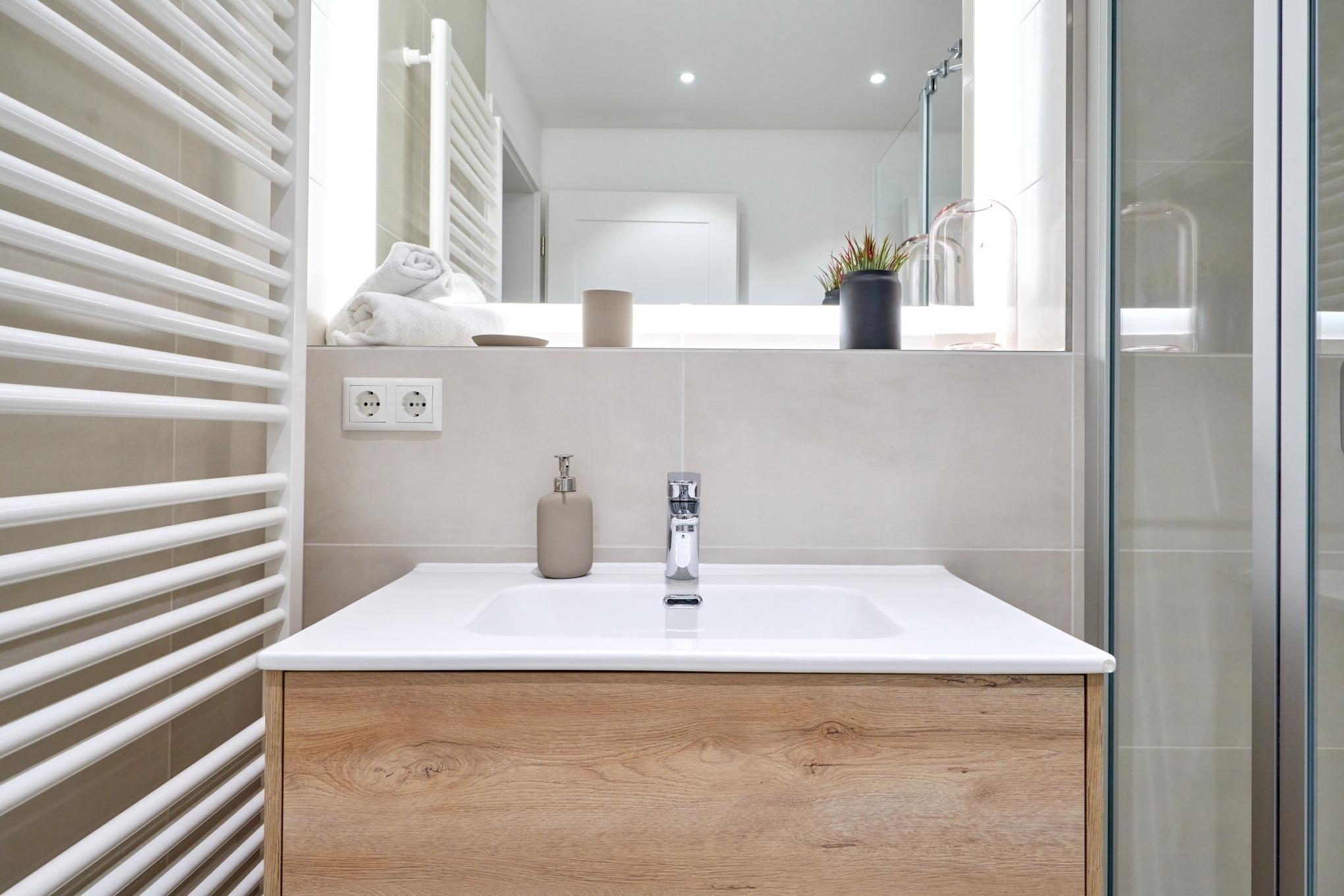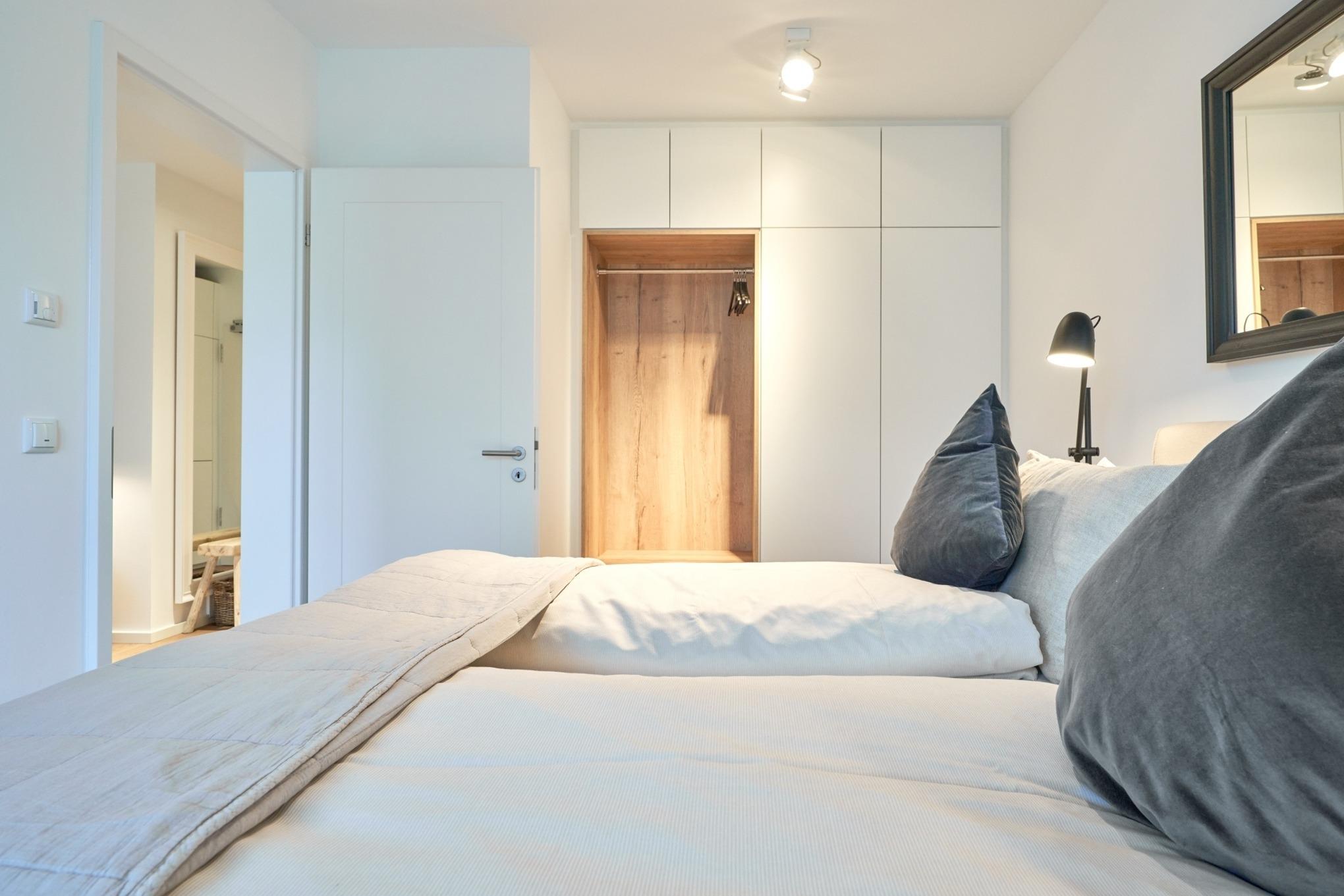 Das Schlafzimmer ist mit einem Boxspringbett (1,80mx2,00m) ausgestattet und verfügt über einen Einbauschrank mit Garderobe, 2 Nachttische sowie einen Wand-TV[nbsp] (43 Zoll). Das Duschbad mit bodengleicher Dusche und Handtuchheizkörper, Fön, Kosmetikspiegel. Die ganze Wohnung ist mit einer Fußbodenheizung sowie mit einem Sicht- bzw. Lichtschutz an allen Fenstern und zusätzlichen elektrischen Rollläden ausgestattet.