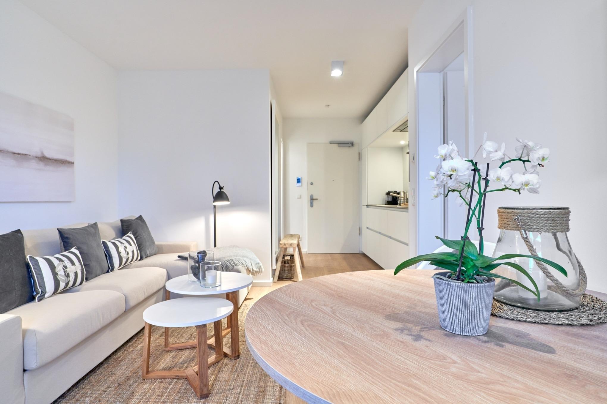 Lichtdurchflutet durch die bodentiefen Fenster, die mit einem Licht- und Sichtschutz versehen sind. Außenrollläden in beiden Zimmern. Hochwertige Einbauküche von Next125 mit Induktionsherd, Backofen inkl. Mikrowelle, Kühlschrank mit Gefrierfach, Geschirrspüler, Toaster, Wasserkocher, Nespresso-Kaffeemaschine mit Milchaufschäumer, Mixer, div. Backutensilien. Kleiner Essbereich. Der Wohnbereich ist mit einem bequemen Sofa mit Recamière, einem Wohnzimmertisch und einem schwenkbaren Wand-TV (43 Zoll) mit Internet-/Streaming-Funktion für Netflix, Sky und mehr ausgestattet, sofern die Gäste über einen Privatzugang verfügen. [nbsp] Internetradio mit Streaming-Funktion für Spotify. [nbsp] Aus dem Wohnbereich gelangen Sie auf den kleinen Sonnenbalkon nach Süden. Hier stehen Tisch und zwei Stühle zur Verfügung.