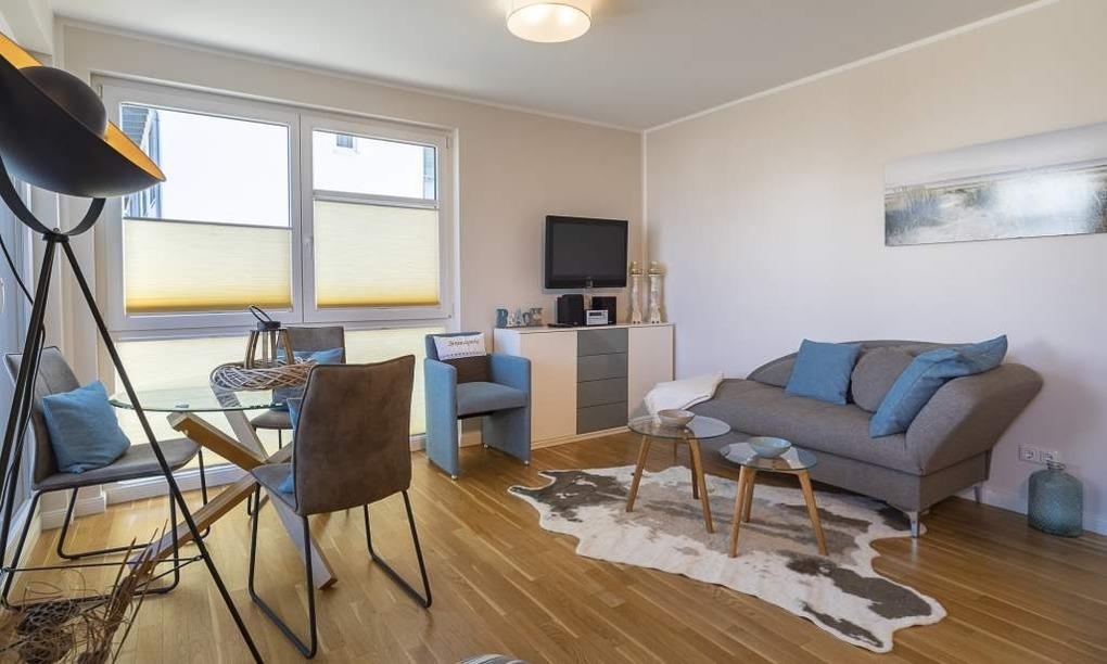Helle 2-Zimmer-Ferienwohnung, ca. 51 m², Balkon, Duschbad, Gäste-WC, Tiefgaragenstellplatz (Durchfahrtshöhe 1,98 m) und Fahrstuhl