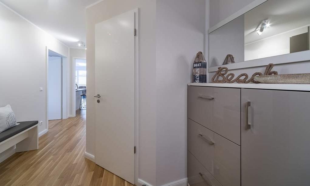 Im Schlafzimmer sorgt ein bequemes Doppelbett (1,80 x 2,00m) mit Qualitätsmatratzen für einen erholsamen Schlaf. Die Urlaubsgarderobe findet Platz im geräumigen Kleiderschrank. Für den zusätzlichen Komfort steht Ihnen auch hier ein stylischer Flachbildfernseher zur Verfügung. Alle Räume sind mit warmem Echtholzparkett und Fußbodenheizung ausgestattet. Bodentiefe Fenster garantieren viel Tageslicht und eine gute Aussicht. Das Badezimmer verfügt über eine bodentiefe Dusche und einen großen Spiegel. Neben der Fußbodenheizung ist hier ein zusätzlicher Handtuchheizkörper angebracht. Weiteres Highlight – eine zusätzliche Gäste-Toilette.
