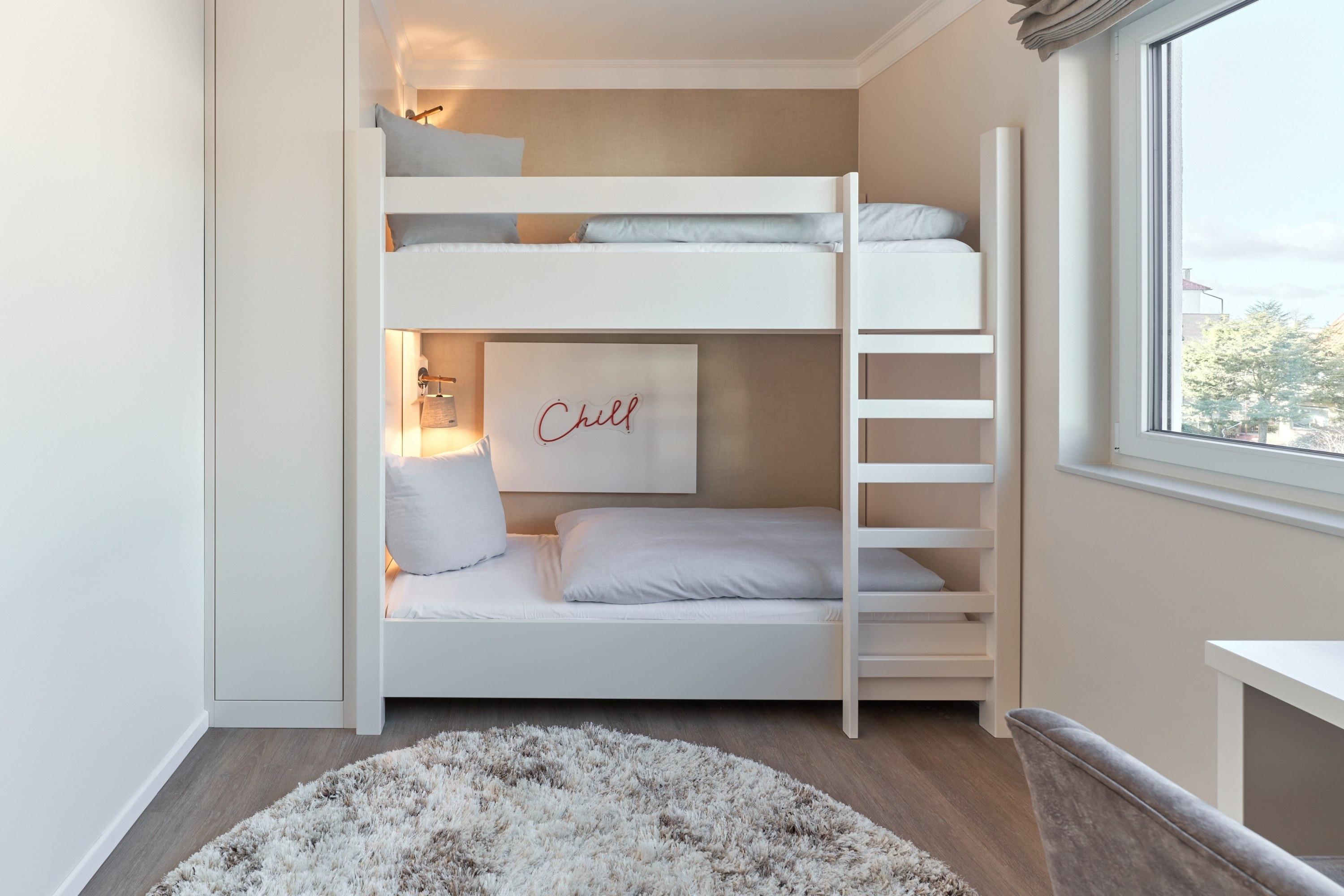 Diese ca. 68m² große Design-Ferienwohnung zeichnet sich durch eine moderne, stylische und exklusive Inneneinrichtung (Markenhersteller und individuelle Tischlereinbauten) aus, die bis ins Detail aufeinander abgestimmt ist. Die Küche ist in heller Optik und mit hochwertigen Einbaugeräten ausgestattet. Neben einer Kaffeemaschine steht Ihnen auch eine Nespresso-Maschine zur Verfügung.[nbsp] Freuen Sie sich auf diese feine Wohlfühlwohnung. Im Wohnzimmer stehen Ihnen ein[nbsp] Entertainment-Smart-TV in 55" und eine Soundbar zur Verfügung. Das Soundbar-System kann ebenfalls per Bluetooth mit einem Smartphone / Tablet angesteuert werden. Somit können Sie auch Ihre eigene Musik abspielen oder Ihren Lieblingsradiosender hören. Weiterhin wartet auf Sie ein anspruchsvoller Wohn-Essbereich. Das erste Schlafzimmer ist mit einem sehr bequemen Doppelbett (1,80 x 2,00m), einem Smart-TV (43"), einer hochwertigen Sideboard-Kommode sowie einer Lamellenwand für Kleider und Hemden ausgestattet. Im 2. Schlafzimmer stehen ein hochwertiges Etagenbett (0,90 x 2,00m), angrenzend ein Einbauschrank sowie ein Schreibtisch, angefertigt in hochwertiger Tischlerarbeit, sowie ein TV (43") für Sie bereit. In allen Räumen befinden sich Außenrollläden. Das Duschbad ist mit einem Handtuchheizkörper und einer bodengleichen Dusche ausgestattet. Kosmetikspiegel sowie ein Haartrockner sind selbstverständlich vorhanden.