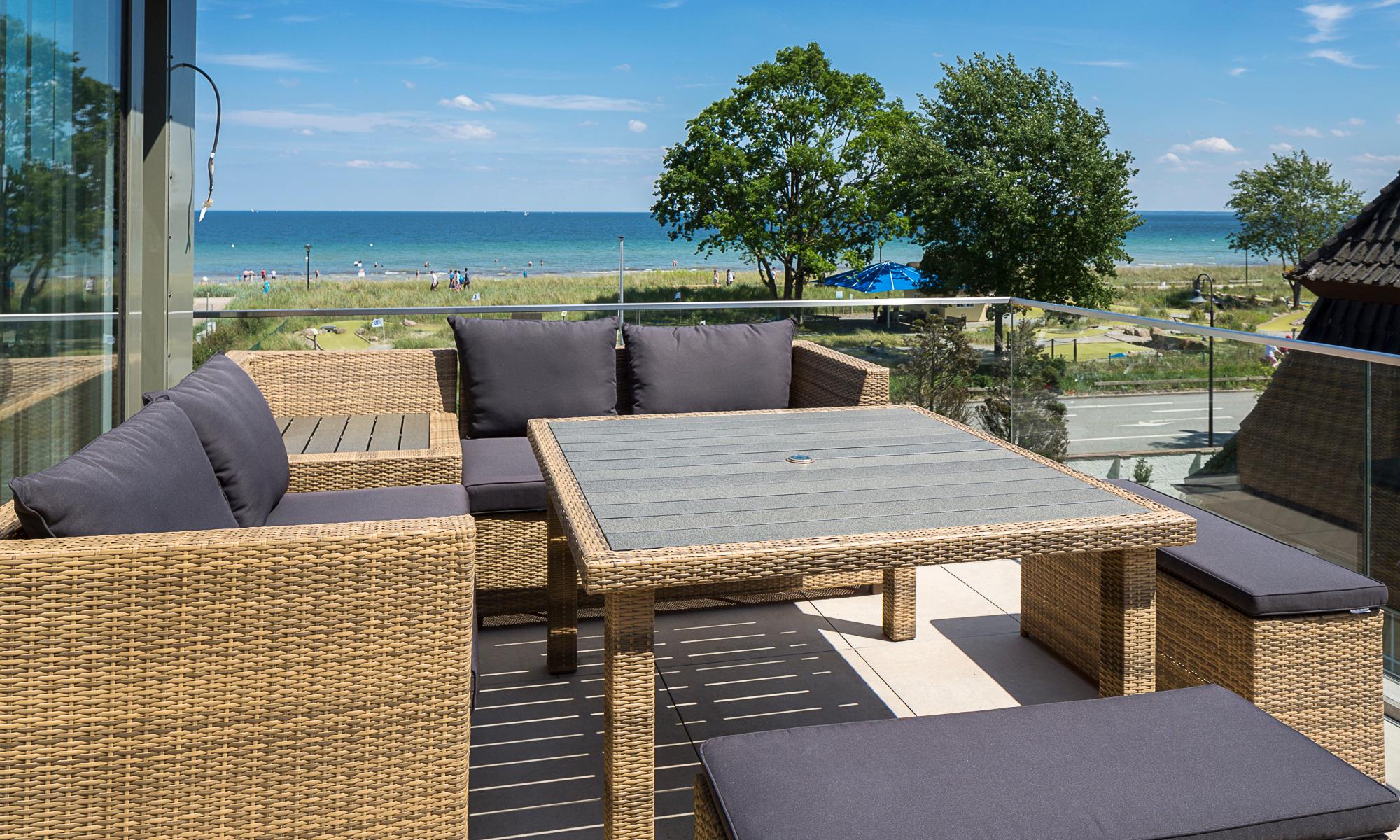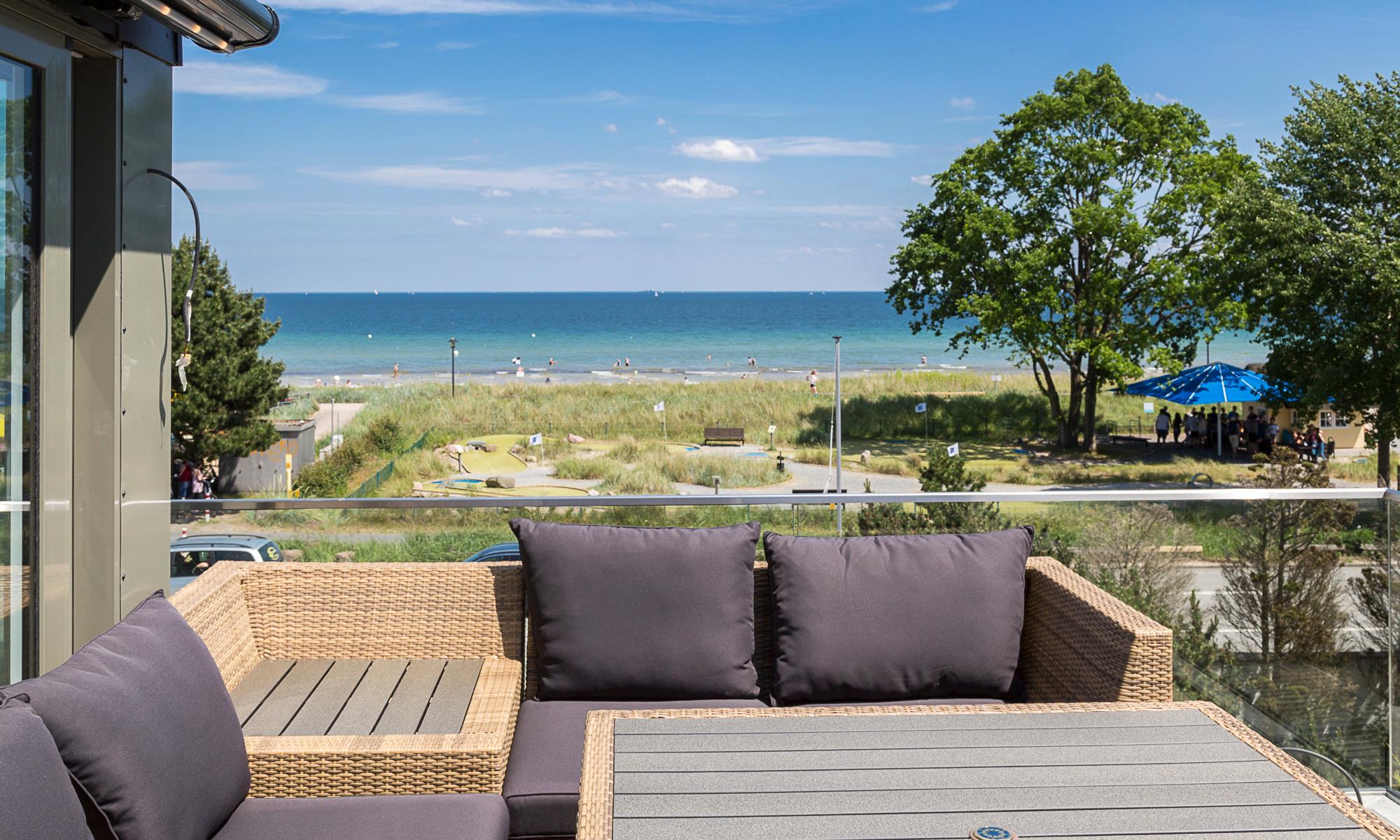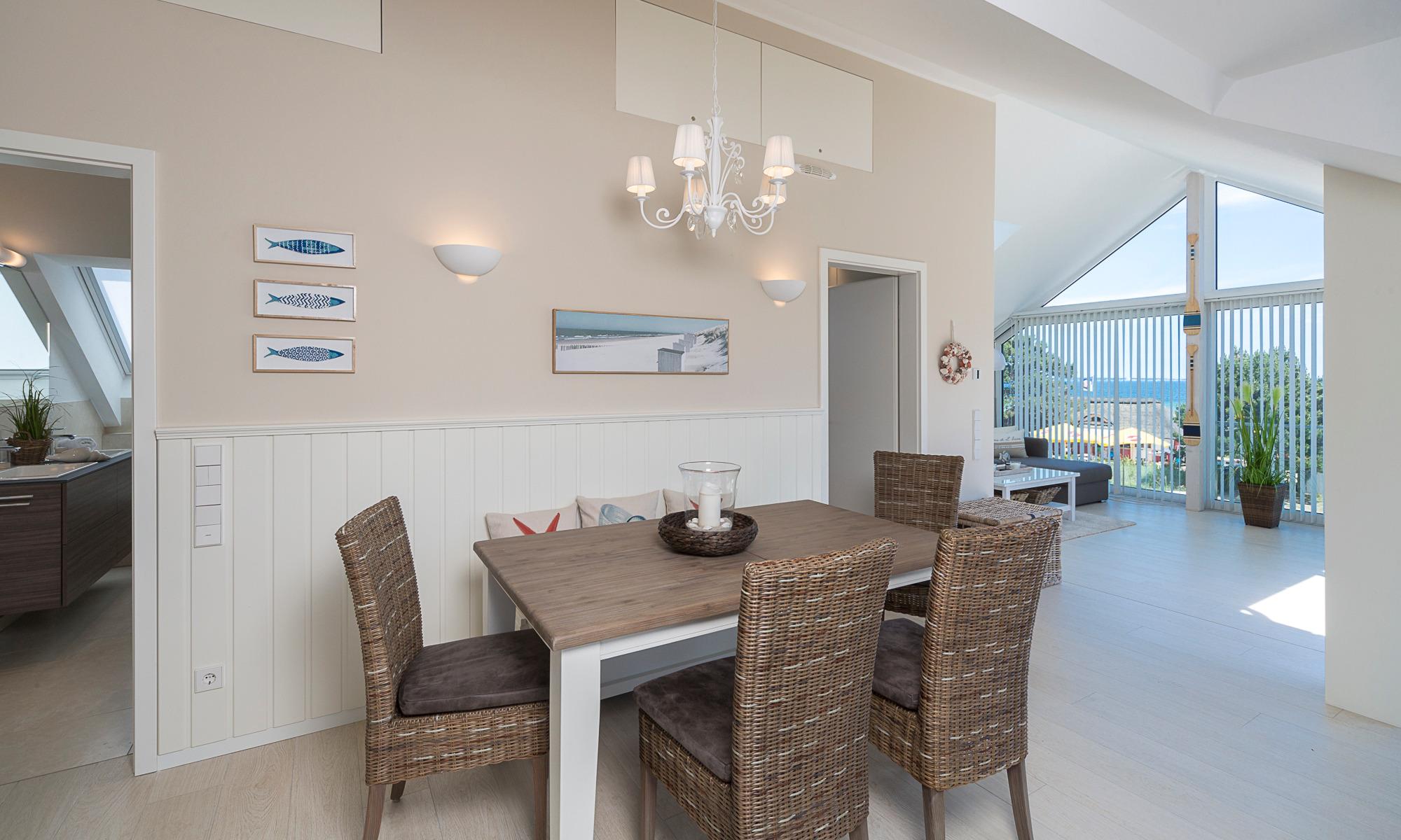 Es erwartet Sie schon beim Betreten der Wohnung der herrliche Blick auf die Ostsee. Der Wohnbereich dieser Traumwohnung ist durch die bodentiefen Fenster und großen Dachfenster absolut hell und lichtdurchflutet, selbstverständlich ist bei Bedarf ein Sichtschutz vorhanden. Der moderne Wohnbereich bietet Ihnen einen gemütlichen Essbereich (auch von hier genießen Sie die großartige Sicht auf die Ostsee), mit ausreichend Platz für 5 Personen. Hier können Sie bequem essen sowie gesellige Stunden verbringen. Die moderne Küche ist komplett ausgestattet und lässt keine Wünsche offen.