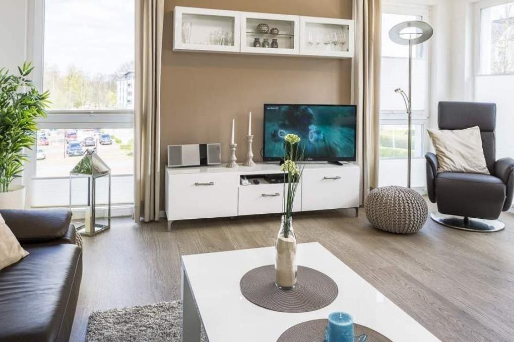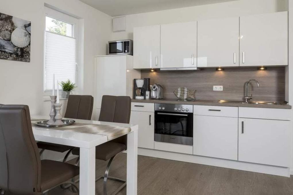 Diese Ferienwohnung bietet Ihnen einen gemütlichen Wohn-Essbereich mit einer Couch und einem schönen Esstisch. Die Couch lässt sich mit nur wenigen Handgriffen in eine bequeme Schlafcouch umfunktionieren. Neben dem Flachbildfernseher und dem BluRay-Player steht Ihnen eine Kompaktanlage Sony CMT-X3 [nbsp] zur Verfügung. Kostenloses WLAN ist selbstverständlich. Die überdachte Loggia ist mit Tisch und Stühlen ausgestattet. Die moderne Küche lässt keine Wünsche offen. Neben einer Kaffeemaschine steht zusätzlich eine Kaffeekapselmaschine von Tchibo für Sie bereit. Das Schlafzimmer ist mit einem geräumigen Schrank, einem bequemen Bett (2,00 x 1,80m, getrennte Matratzen) und einem Flachbildfernseher ausgestattet. Das helle Tageslichtbad verfügt über eine bodentiefe Dusche und einen großen Spiegel. Hier steht auch eine Waschmaschine zur Verfügung. Neben der Fußbodenheizung ist hier ein zusätzlicher Handtuchheizkörper angebracht.
