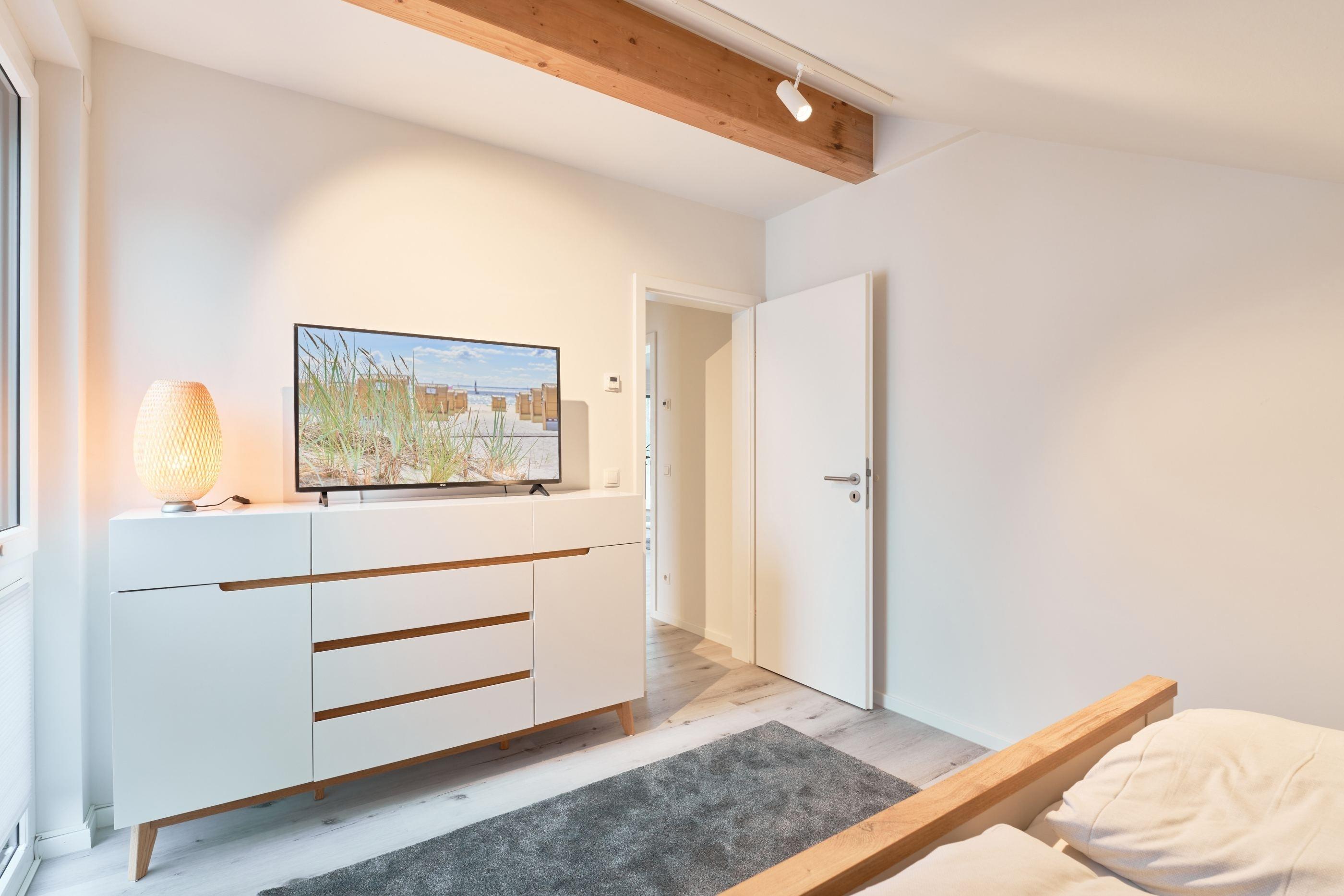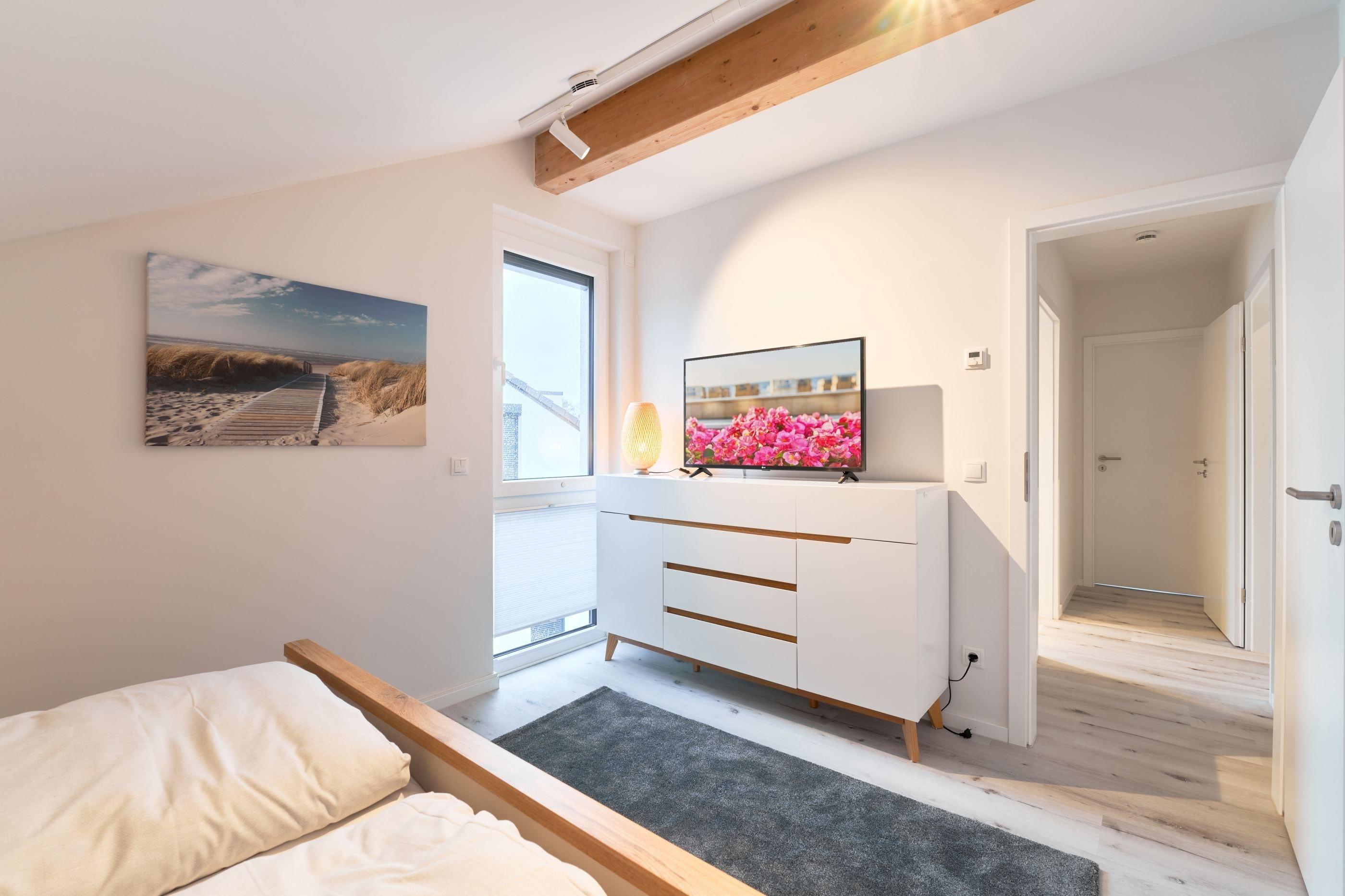 Das zweite Schlafzimmer hat ebenfalls ein Doppelbett mit Einzelmatratzen und verstellbarem Kopf- und Fußteil. Ein Smart-TV ist auch hier vorhanden. Das zweite Tageslichtbad ist mit einer bodengleichen Dusche ausgestattet.