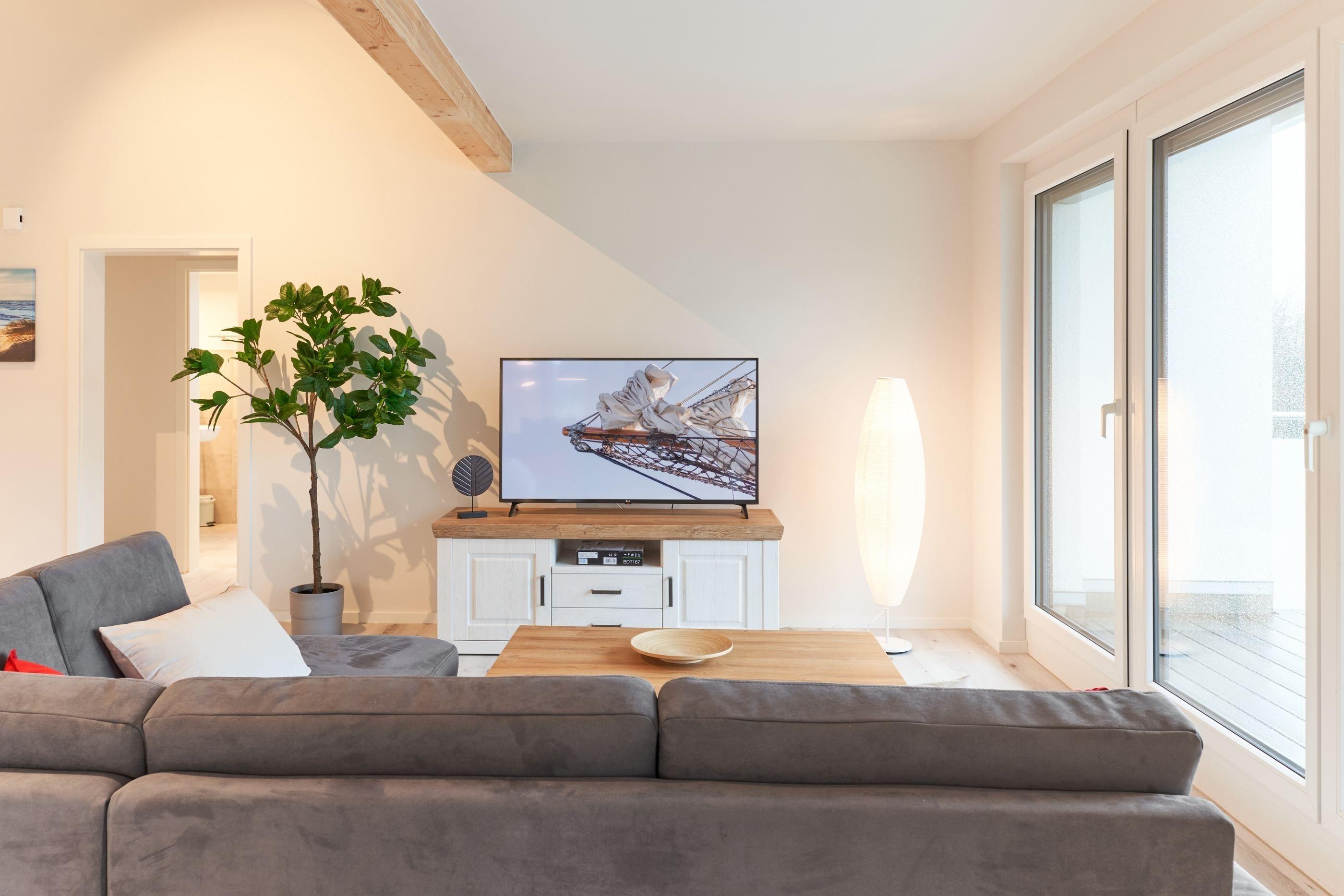 Helles, großes Wohnzimmer mit einer Einbauküche, einem Essbereich mit Tisch und 6 Stühlen. Der Wohnbereich ist mit einem gemütlichen Sofa und einem Smart-TV ausgestattet. Vom Wohnzimmer aus gelangen Sie in das erste Schlafzimmer mit einem Doppelbett mit verstellbarem Kopf- und Fußteil, 2 Nachttischen, Kleiderschrank und einem Smart-TV. Angrenzend das Duschbad mit separatem WC.