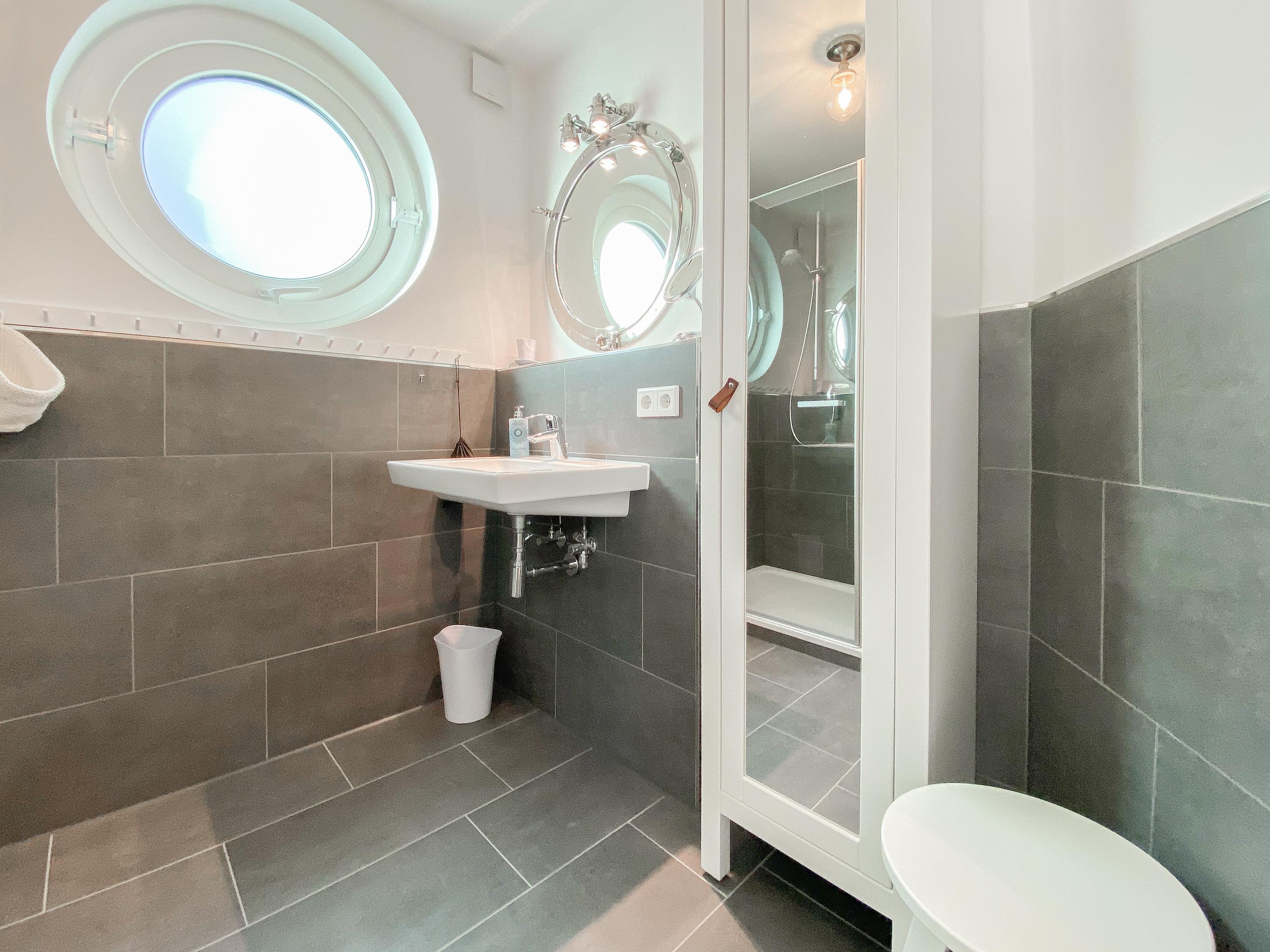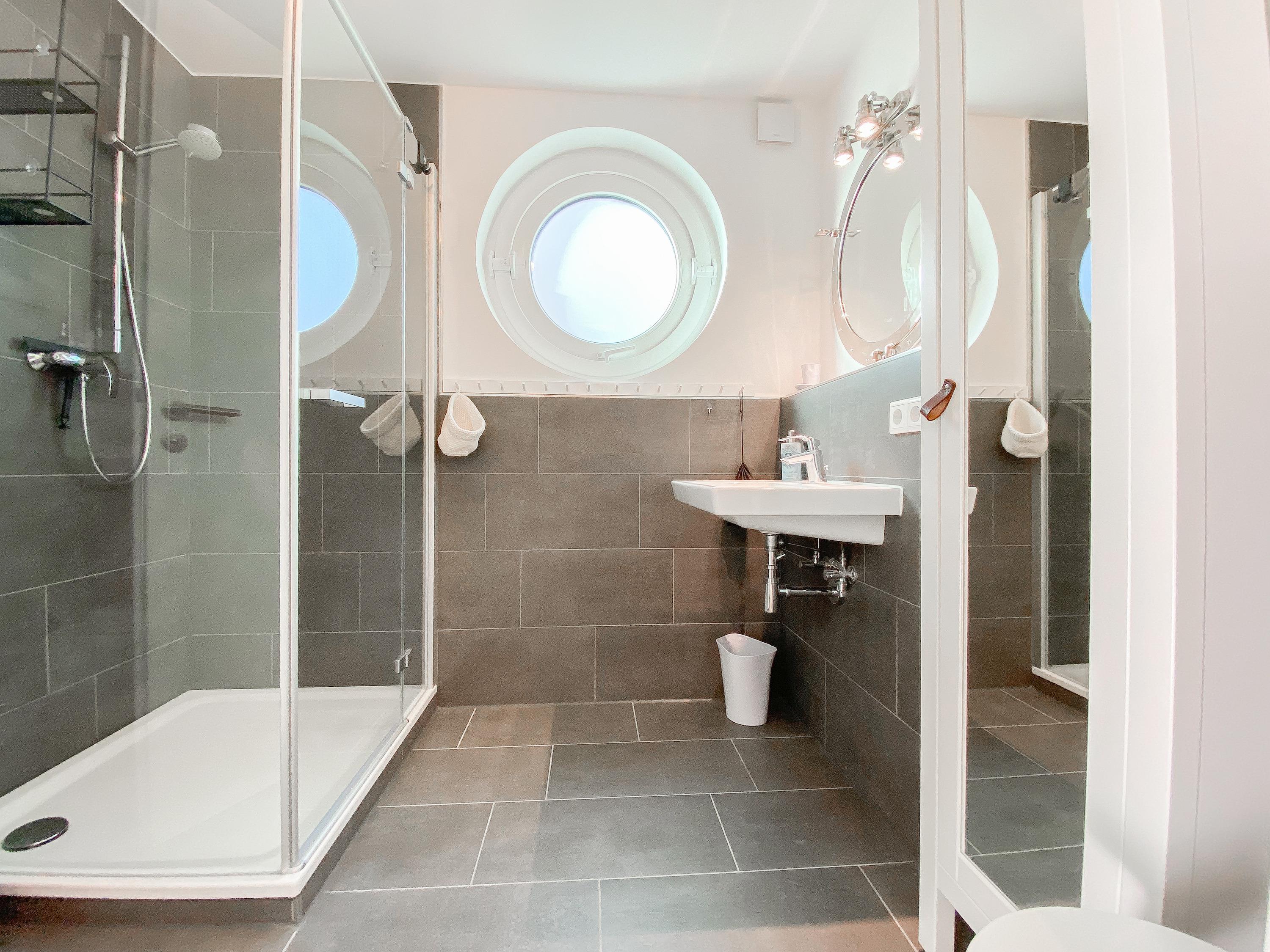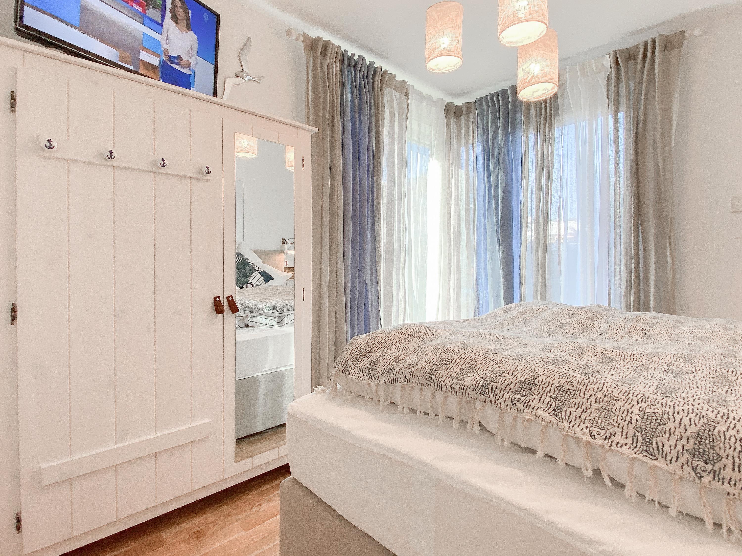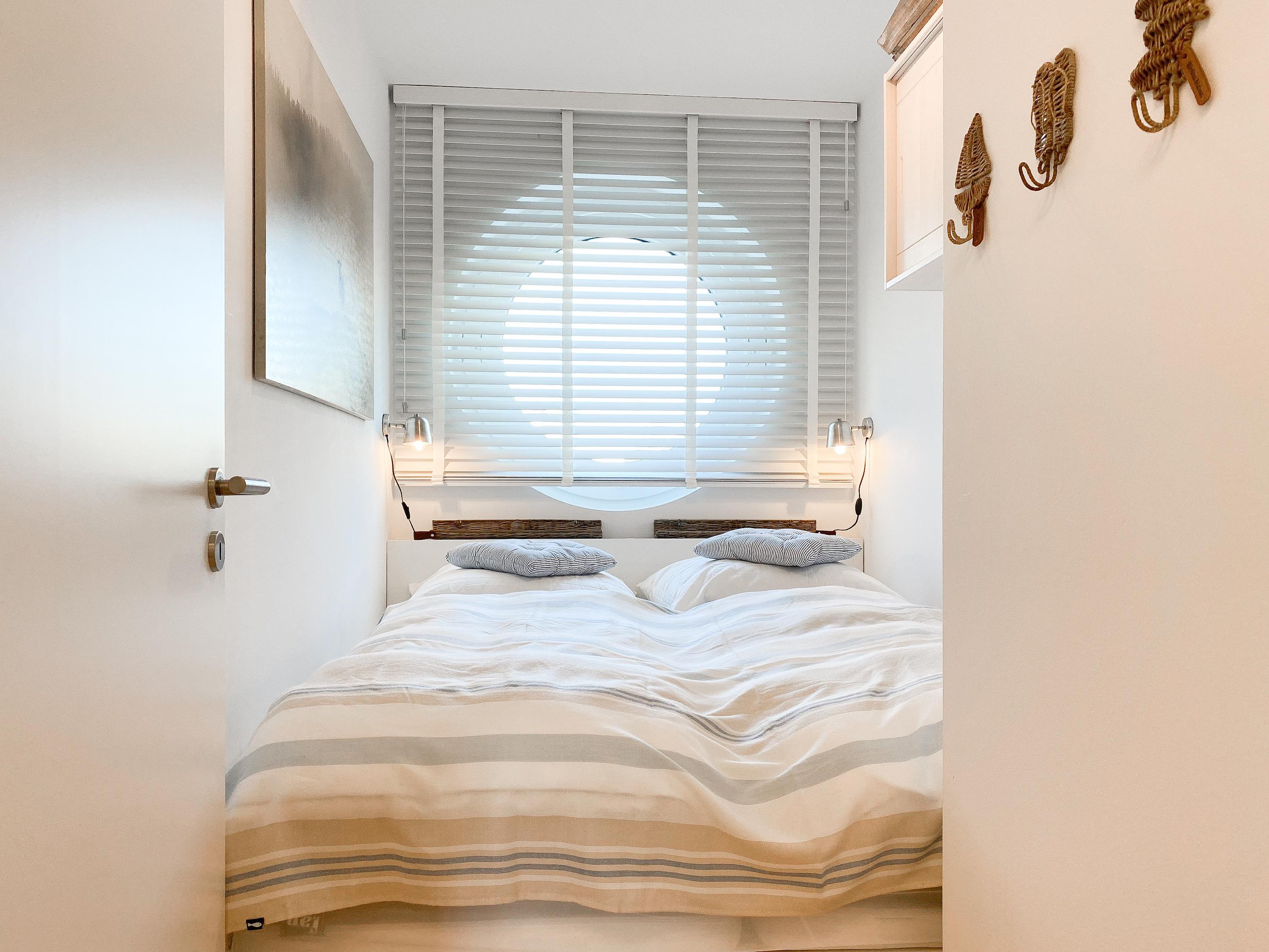 Das "Kajütchen" ist mit 2 separaten Schlafzimmern bestens für 3-4 Personen geeignet, um einen entspannten Ostseeurlaub zu verleben. Die hochwertige Inneneinrichtung mit vielen liebevollen Details im Beachstyle laden zum Wohlfühlen in Strandnähe ein. Es erwartet Sie ein lichtdurchfluteter Wohnbereich mit einem Kuschelsofa, TV, Radio und WLAN, ein gemütlicher Essbereich für 4 Personen und eine moderne Designküche in bester Ausstattung. Der Strandkorb und die Essgruppe auf der Sonnenterrasse garantieren entspannte Stunden an der frischen Seeluft. Eine elektrische Markise sorgt für entsprechende Beschattung. Das Hauptschlafzimmer ist mit einem komfortablen Boxspringbett (180x200), einem Kleiderschrank und TV ausgestattet. Das kleine Schlafzimmer verfügt über ein Doppelbett (160x200) mit zusätzlichem Stauraum im Fußteil; bitte beachten Sie, dass das Bett nur über das Fußende zu erreichen ist. Das Bullaugenfenster ist mit Verdunkelungslamellen versehen. Alle weiteren bodentiefen Fensterflächen sind mit elektrischen Außenjalousien ausgestattet. Das Duschbad ist hochwertig und modern. Ein Bullauge und ein Handtuchwärmer sorgen für zusätzlichen Komfort.