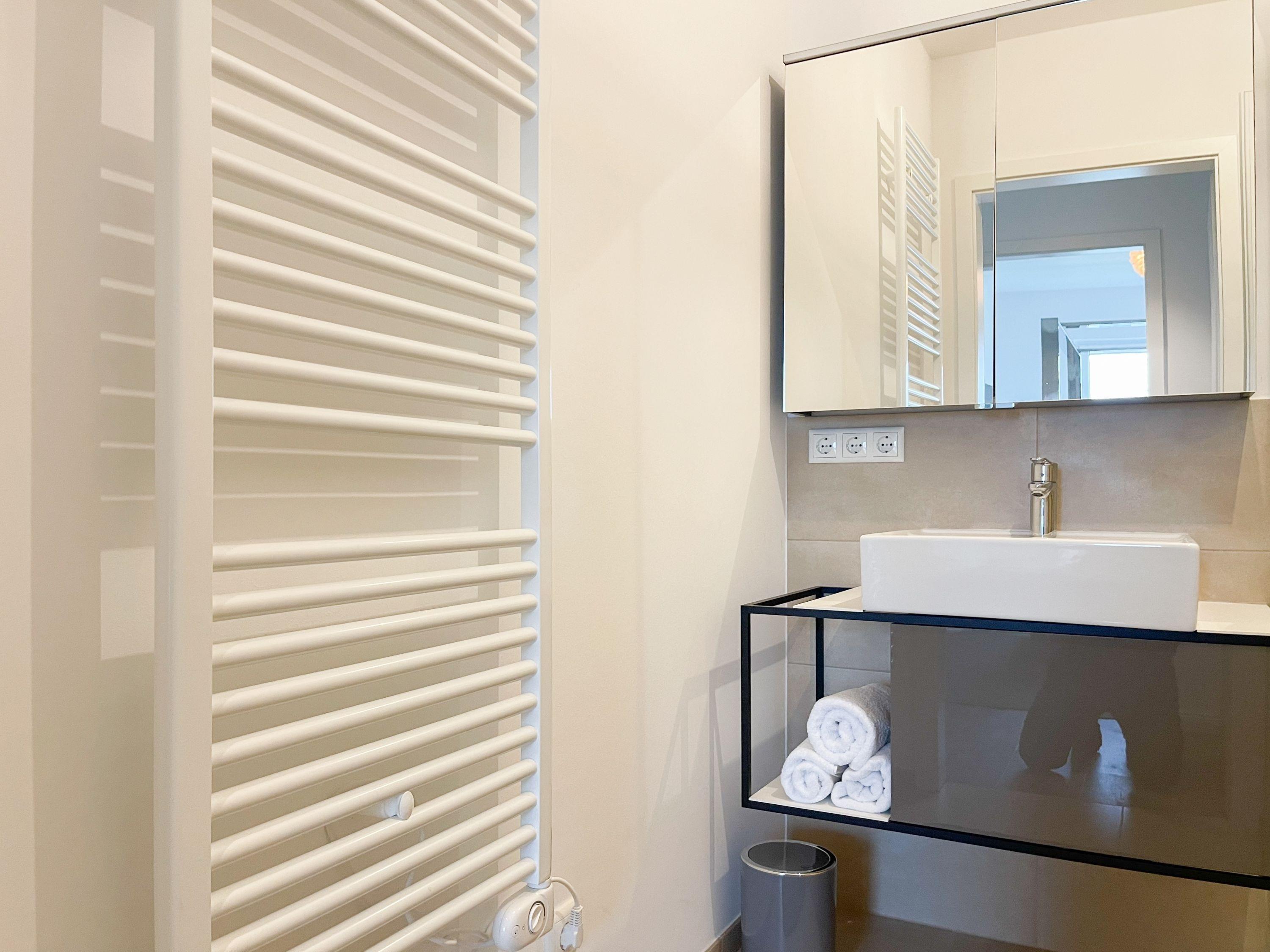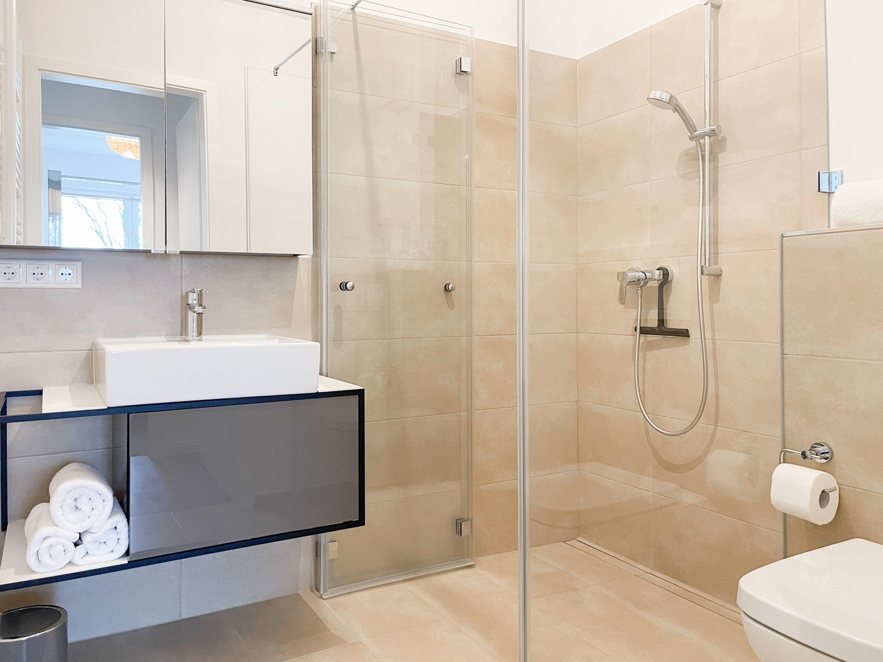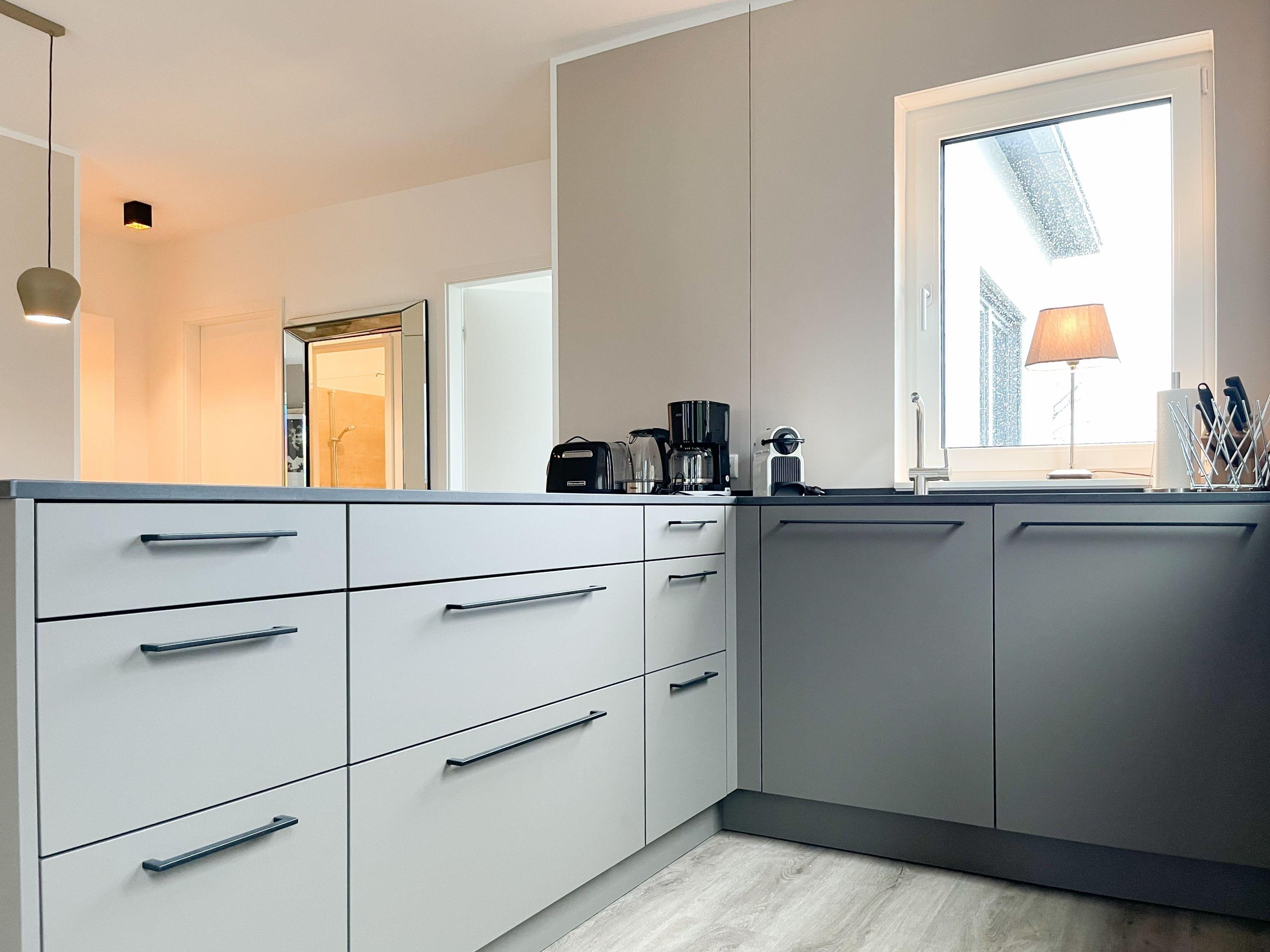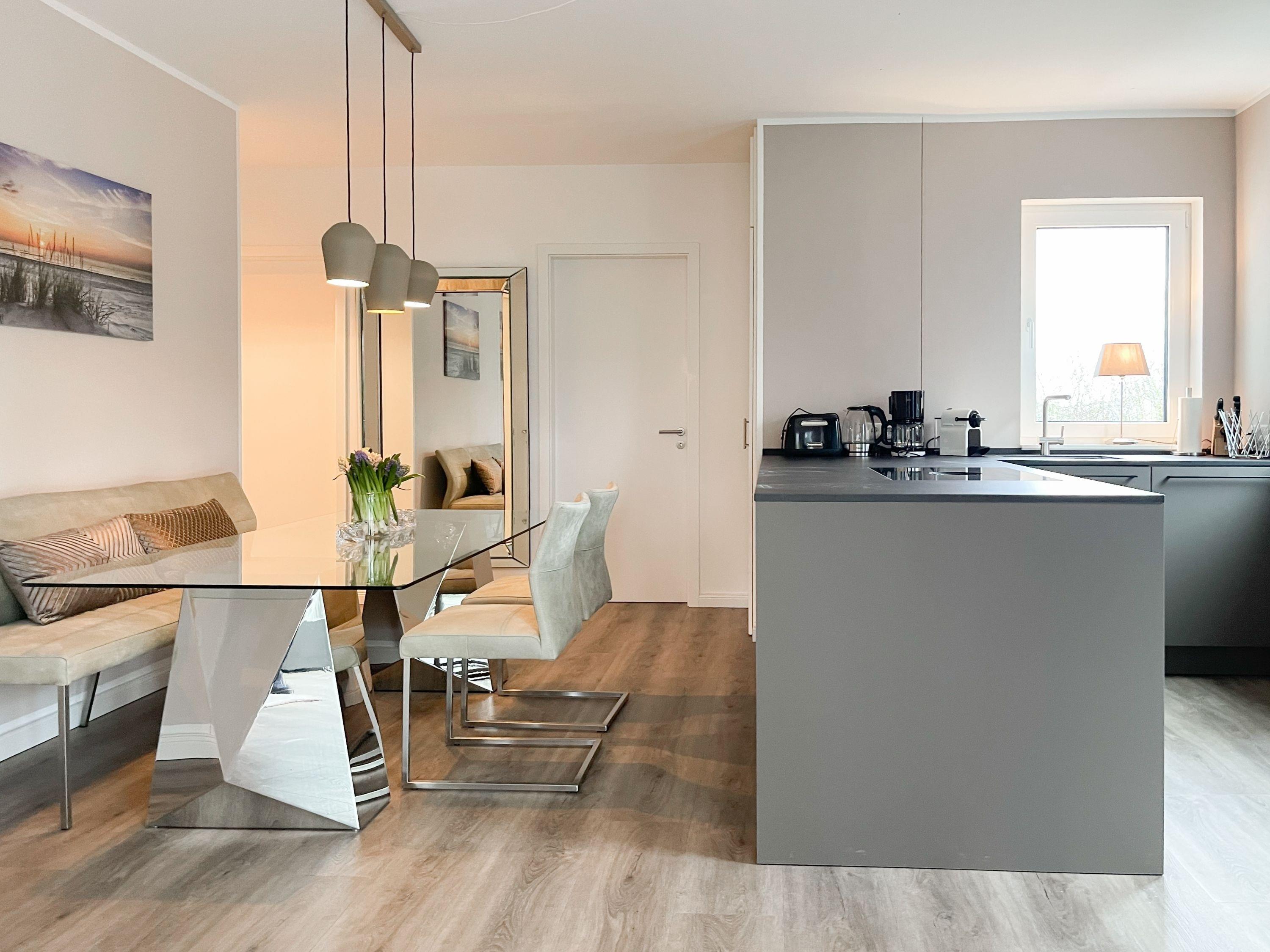 Es erwartet Sie eine äußerst hochwertig ausgestattete und geschmackvoll eingerichtete Ferienwohnung, die mit 2 separaten Schlafzimmern ausreichend Raum für 4 Personen bietet, um einen entspannten Urlaub in einem herrlichen Ambiente zu verleben. Fußbodenheizung, elektrische Außenjalousien und bodentiefe Fensterelemente, die für ein offenes Raumgefühl sorgen, gewährleisten einen hohen Wohnstandard. Mittelpunkt der Ferienwohnung bildet die Siematic Design Küche mit Kochinsel in bester Ausstattung, die zum gemeinsamen Kochen einlädt und der anschließende Essbereich im Hampton Style. Der behagliche Wohnbereich, eingerichtet mit Sofa und TV, bietet Blick und Zugang auf die großzügig angelegte Südostterrasse mit Gartenmöbeln und Sonnenliegen, um den Tag bei einem Glas Wein mit Ostseeblick ausklingen zu lassen. Beide Schlafzimmer bieten einen herrlichen Ausblick bis auf[nbsp] das Meer und sind mit hochwertigem Teppichboden, Doppelbetten (180x200)[nbsp] und einem Kleiderschrank ausgestattet. Eines der Schlafzimmer ist zusätzlich mit einem TV ausgestattet. Im Flur des Eingangsbereichs befindet sich ein weiterer Einbauschrank zum Unterbringen von Jacken Mänteln. Das Bad ist sehr hochwertig und modern, ausgestattet mit einer XXL Walk In Dusche. Waschmaschine und Trockner befinden sich in einem Einbauschrank. WLAN steht selbstverständlich zur kostenlosen Nutzung zur Verfügung.