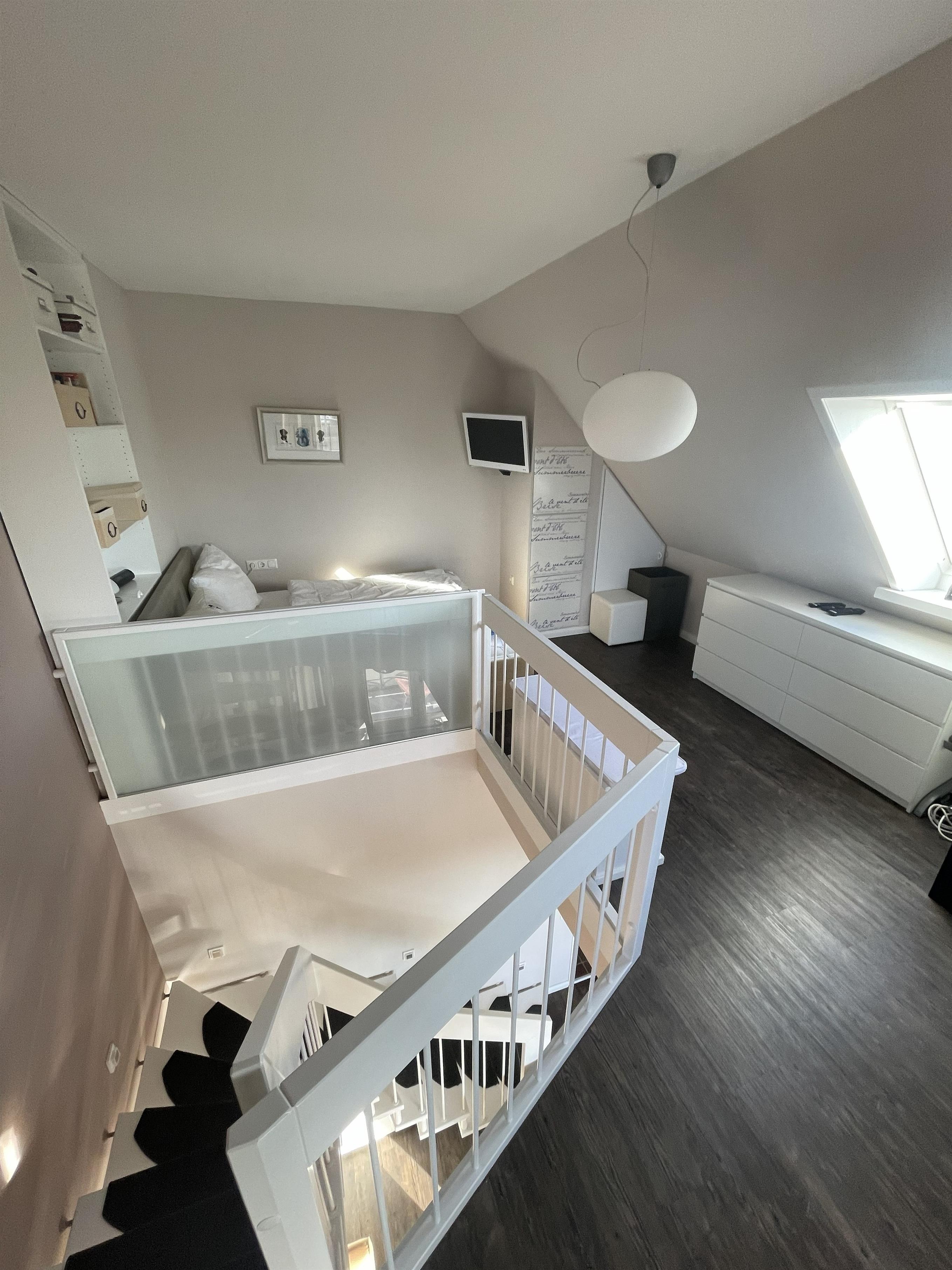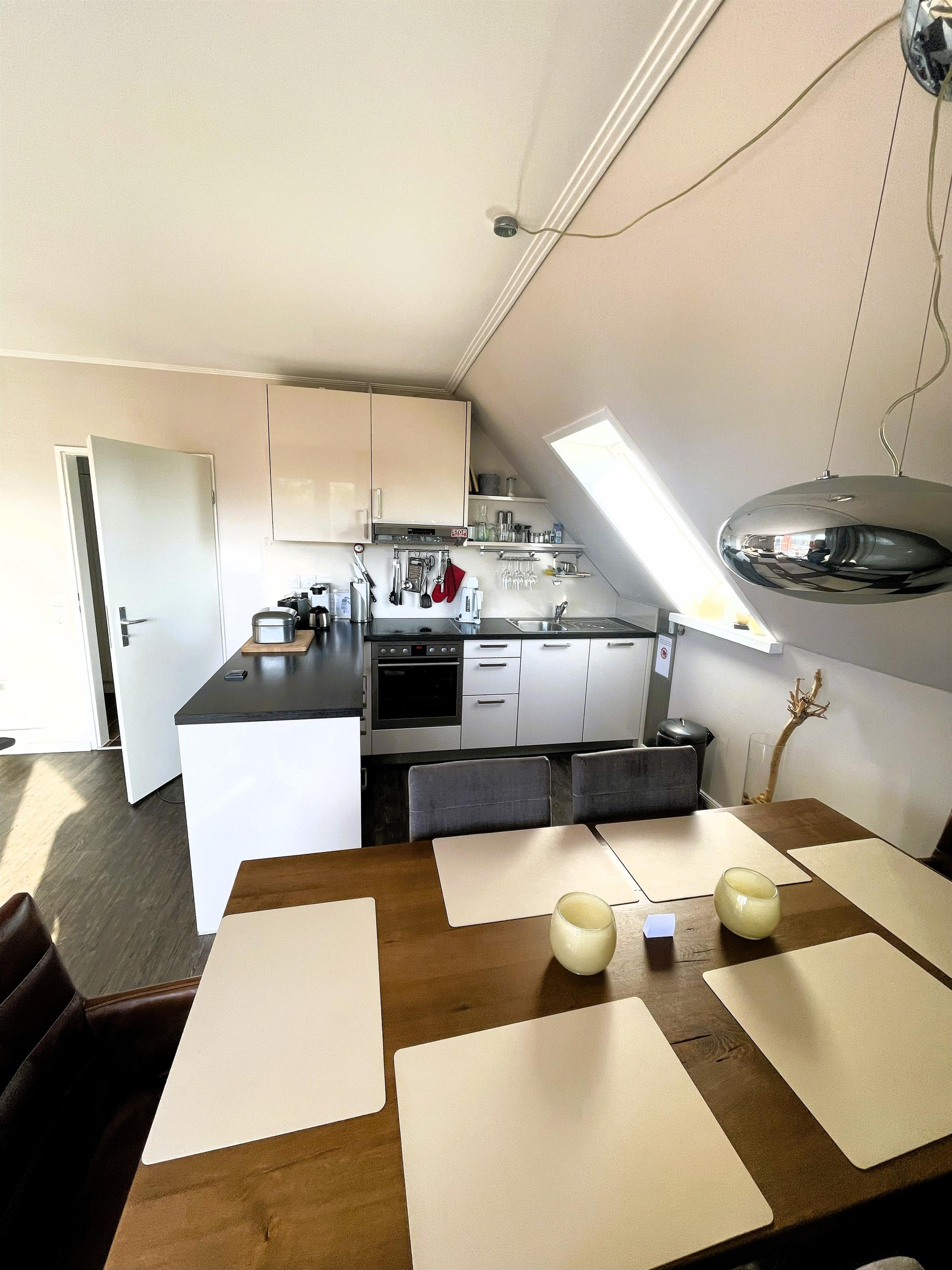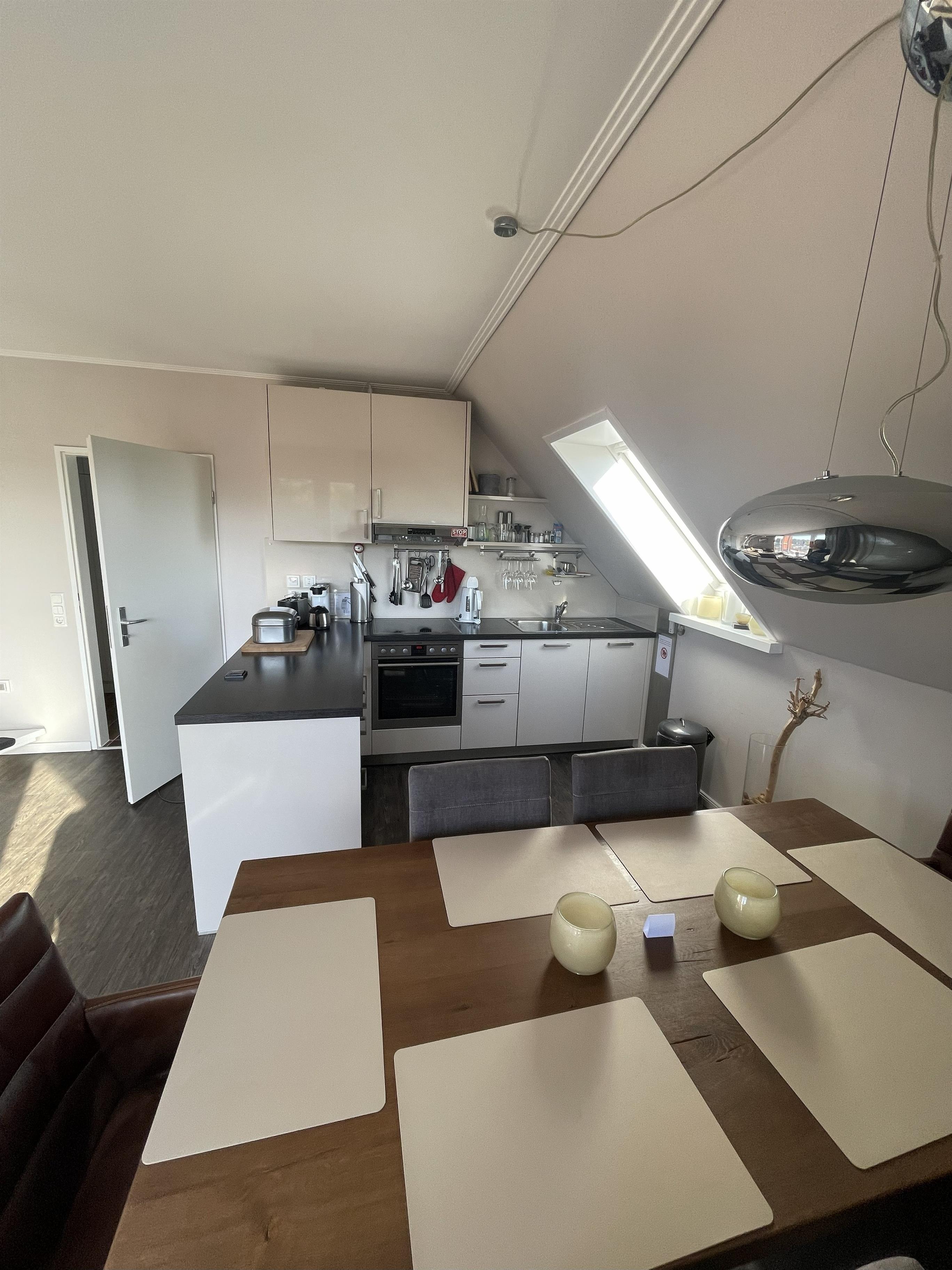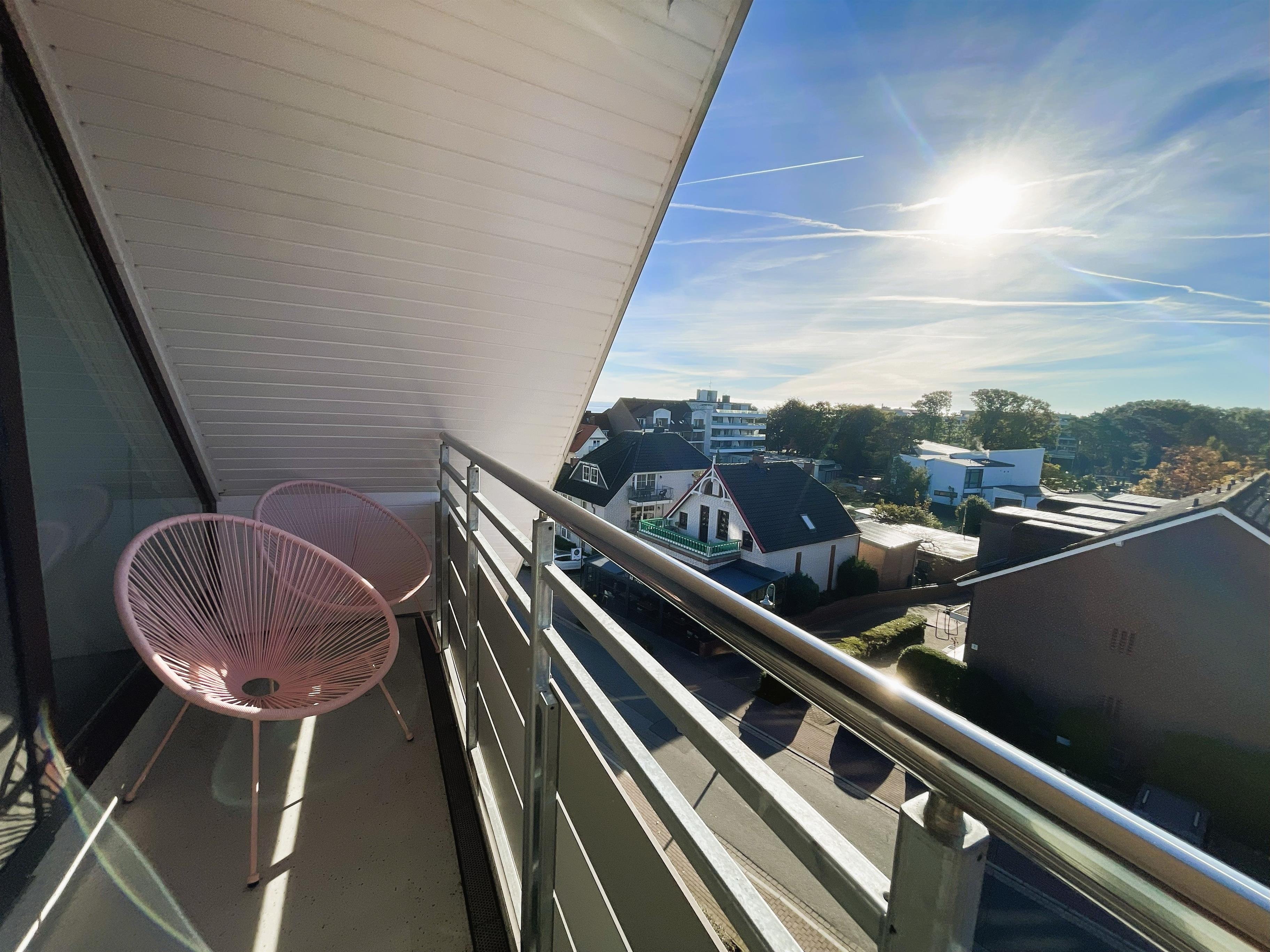 Wohnen mit Stil – dem Meer so nahIn der dritten Etage betreten Sie einen hellen Flur, der direkt in den modernen Wohn-Essbereich mit angeschlossener Pantryküche führt. Warme Farben, natürliche Materialien und liebevolle Details schaffen ein Ambiente, in dem man sofort zur Ruhe kommt. Das komfortable Sofa und der gemütliche Schwingsessel laden zum Entspannen ein – beim Fernsehen mit TV und DVD Player, beim Lesen oder beim Blick in den Scharbeutzer Kurpark.Vom Wohnbereich aus gelangen Sie auf den Süd-Balkon mit leichtem Meerblick – der perfekte Ort für genussvolle Stunden im Freien. Hier befindet sich eine elegante Essecke für vier Personen – ideal für ein gemütliches Frühstück in der Morgensonne oder ein entspanntes Abendessen mit Blick über Scharbeutz. Genießen Sie die frische Ostseeluft und das besondere Licht der Lübecker Bucht.Moderne Loungesessel laden anschließend dazu ein, den Tag bei einem Glas Wein und dem sanften Klang der Wellen stilvoll ausklingen zu lassen.Auf dem zweiten Balkon auf der oberen Etage erwarten Sie weitere komfortable Loungesessel – perfekt, um Sonne zu tanken, zu lesen oder einfach den Moment zu genießen.Komfort und AusstattungDer elegante Essbereich mit gemütlichen Freischwinger-Stühlen bietet genügend Raum für gemeinsame Mahlzeiten. In der modernen Pantryküche finden Sie alles was das Herz begehrt: Cerankochfeld, Backofen, Geschirrspüler, Kaffeemaschine, Wasserkocher, Toaster und einen exklusiven Weinkühlschrank – ideal für Genießer.Über die stilvolle Wendeltreppe gelangen Sie in den offen gestalteten Schlaf- und Relaxbereich. Hier erwartet Sie ein gemütliches Daybed zum Entspannen, lesen oder für Filmabende auf dem großen Flachbildfernseher mit Soundsystem. Wer aktiv bleiben möchte, nutzt das bereitliegende Hantelset. Das komfortable Doppelbett (1,60 x 2,00 m) – Einstieg nur über das Fußende möglich – sorgt für erholsamen Schlaf, während sich das Daybed zu einem Doppelbed für zwei Kinder verwandeln lässt – ideal für den Familienurlaub an der Ostsee.Wohlfühlbad und ExtrasDas Badezimmer in der unteren Etage ist hell und modern gestaltet, mit Dusche, Waschbecken, Spiegelschrank und großen Dachfenster. Ein Föhn steht selbstverständlich auch zur Verfügung.Zur weiteren Ausstattung gehören kostenfreies WLAN, Kinderreisebett, Hochstuhl, eine elektrische Markise auf dem unteren Balkon sowie ein reservierter Parkplatz direkt am Haus. Die Wohnung ist Nichtraucher-freundlich, Haustiere sind nicht gestattet. Im Haus stehen Waschmaschine und Trockner (gegen Gebühr) zur Verfügung. Im Erdgeschoss lädt ein Gemeinschaftsraum mit Tischtennisplatte und Tischkicker zu geselligen Stunden ein – perfekt für Familien und Freunde.