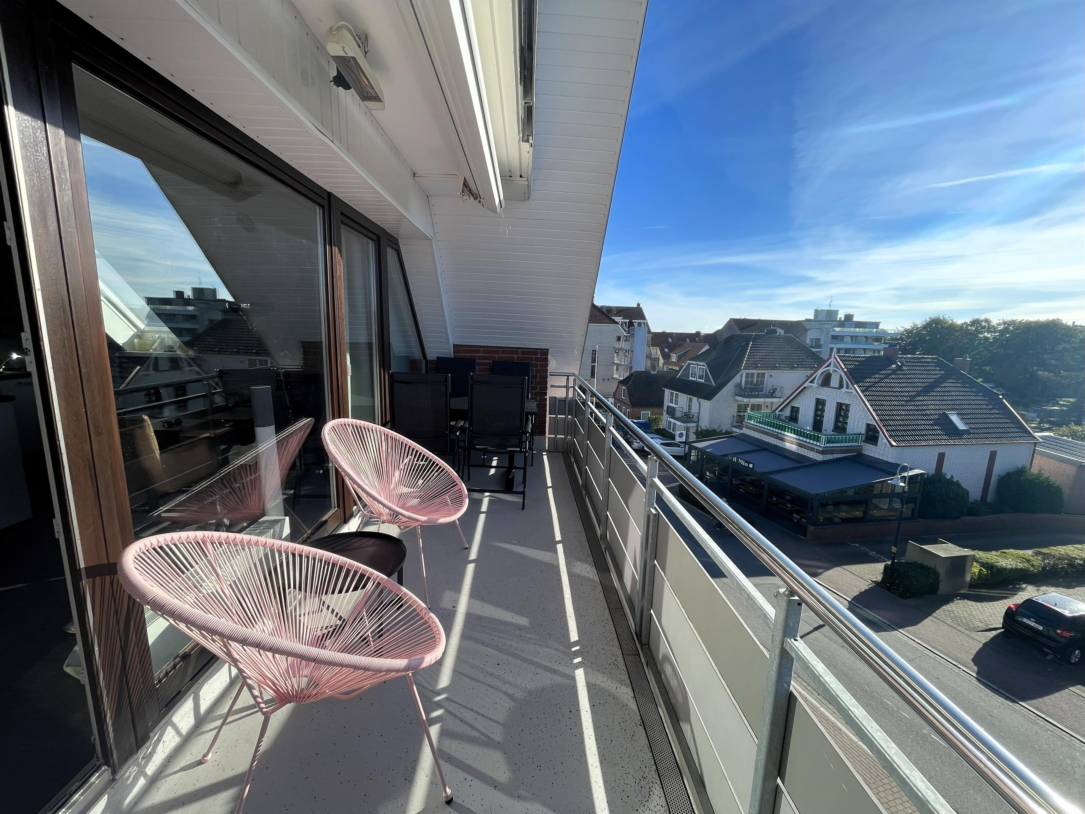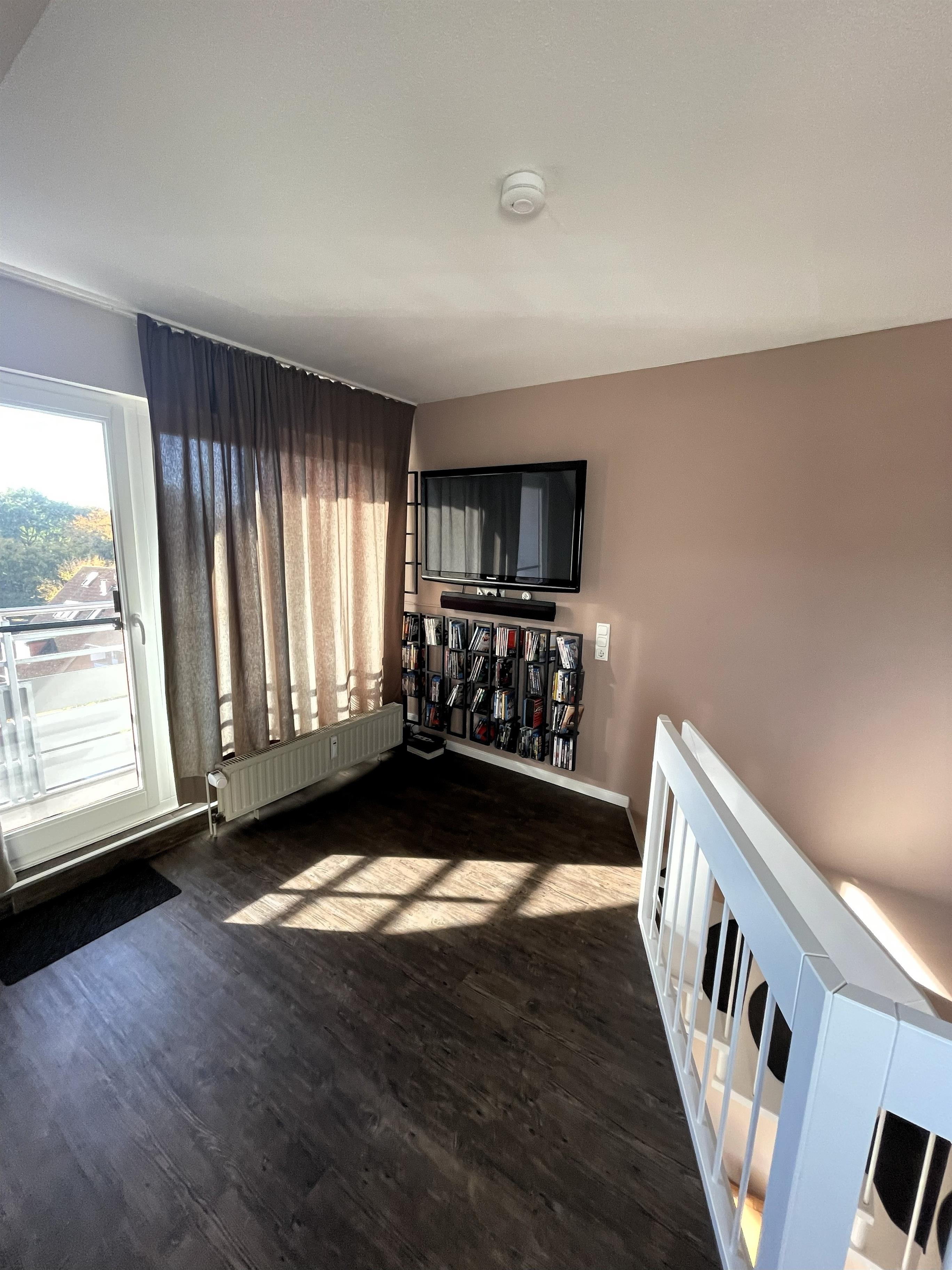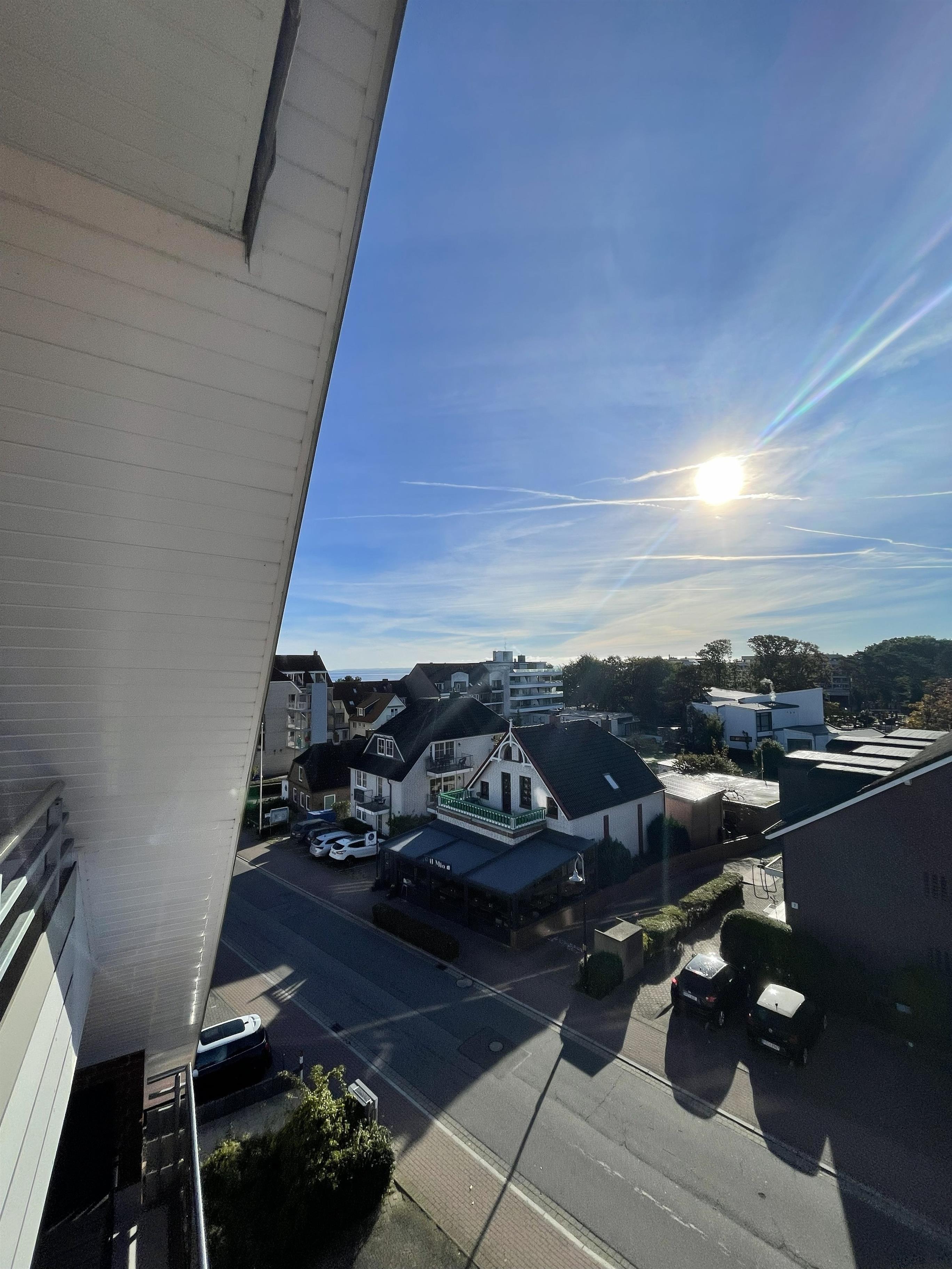Wohnen mit Stil – dem Meer so nahIn der dritten Etage betreten Sie einen hellen Flur, der direkt in den modernen Wohn-Essbereich mit angeschlossener Pantryküche führt. Warme Farben, natürliche Materialien und liebevolle Details schaffen ein Ambiente, in dem man sofort zur Ruhe kommt. Das komfortable Sofa und der gemütliche Schwingsessel laden zum Entspannen ein – beim Fernsehen mit TV und DVD Player, beim Lesen oder beim Blick in den Scharbeutzer Kurpark.Vom Wohnbereich aus gelangen Sie auf den Süd-Balkon mit leichtem Meerblick – der perfekte Ort für genussvolle Stunden im Freien. Hier befindet sich eine elegante Essecke für vier Personen – ideal für ein gemütliches Frühstück in der Morgensonne oder ein entspanntes Abendessen mit Blick über Scharbeutz. Genießen Sie die frische Ostseeluft und das besondere Licht der Lübecker Bucht.Moderne Loungesessel laden anschließend dazu ein, den Tag bei einem Glas Wein und dem sanften Klang der Wellen stilvoll ausklingen zu lassen.Auf dem zweiten Balkon auf der oberen Etage erwarten Sie weitere komfortable Loungesessel – perfekt, um Sonne zu tanken, zu lesen oder einfach den Moment zu genießen.Komfort und AusstattungDer elegante Essbereich mit gemütlichen Freischwinger-Stühlen bietet genügend Raum für gemeinsame Mahlzeiten. In der modernen Pantryküche finden Sie alles was das Herz begehrt: Cerankochfeld, Backofen, Geschirrspüler, Kaffeemaschine, Wasserkocher, Toaster und einen exklusiven Weinkühlschrank – ideal für Genießer.Über die stilvolle Wendeltreppe gelangen Sie in den offen gestalteten Schlaf- und Relaxbereich. Hier erwartet Sie ein gemütliches Daybed zum Entspannen, lesen oder für Filmabende auf dem großen Flachbildfernseher mit Soundsystem. Wer aktiv bleiben möchte, nutzt das bereitliegende Hantelset. Das komfortable Doppelbett (1,60 x 2,00 m) – Einstieg nur über das Fußende möglich – sorgt für erholsamen Schlaf, während sich das Daybed zu einem Doppelbed für zwei Kinder verwandeln lässt – ideal für den Familienurlaub an der Ostsee.Wohlfühlbad und ExtrasDas Badezimmer in der unteren Etage ist hell und modern gestaltet, mit Dusche, Waschbecken, Spiegelschrank und großen Dachfenster. Ein Föhn steht selbstverständlich auch zur Verfügung.Zur weiteren Ausstattung gehören kostenfreies WLAN, Kinderreisebett, Hochstuhl, eine elektrische Markise auf dem unteren Balkon sowie ein reservierter Parkplatz direkt am Haus. Die Wohnung ist Nichtraucher-freundlich, Haustiere sind nicht gestattet. Im Haus stehen Waschmaschine und Trockner (gegen Gebühr) zur Verfügung. Im Erdgeschoss lädt ein Gemeinschaftsraum mit Tischtennisplatte und Tischkicker zu geselligen Stunden ein – perfekt für Familien und Freunde.