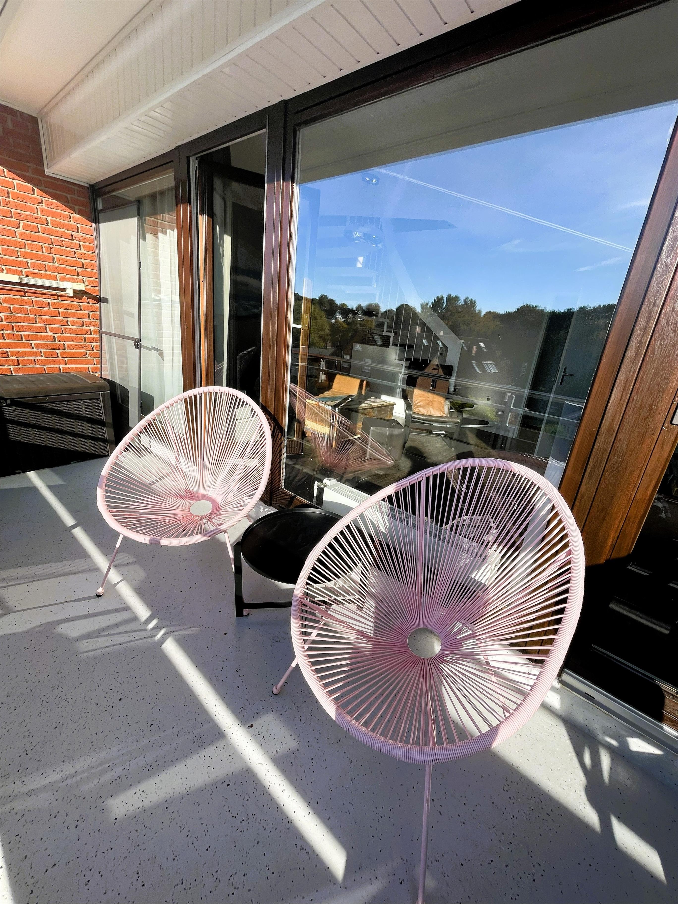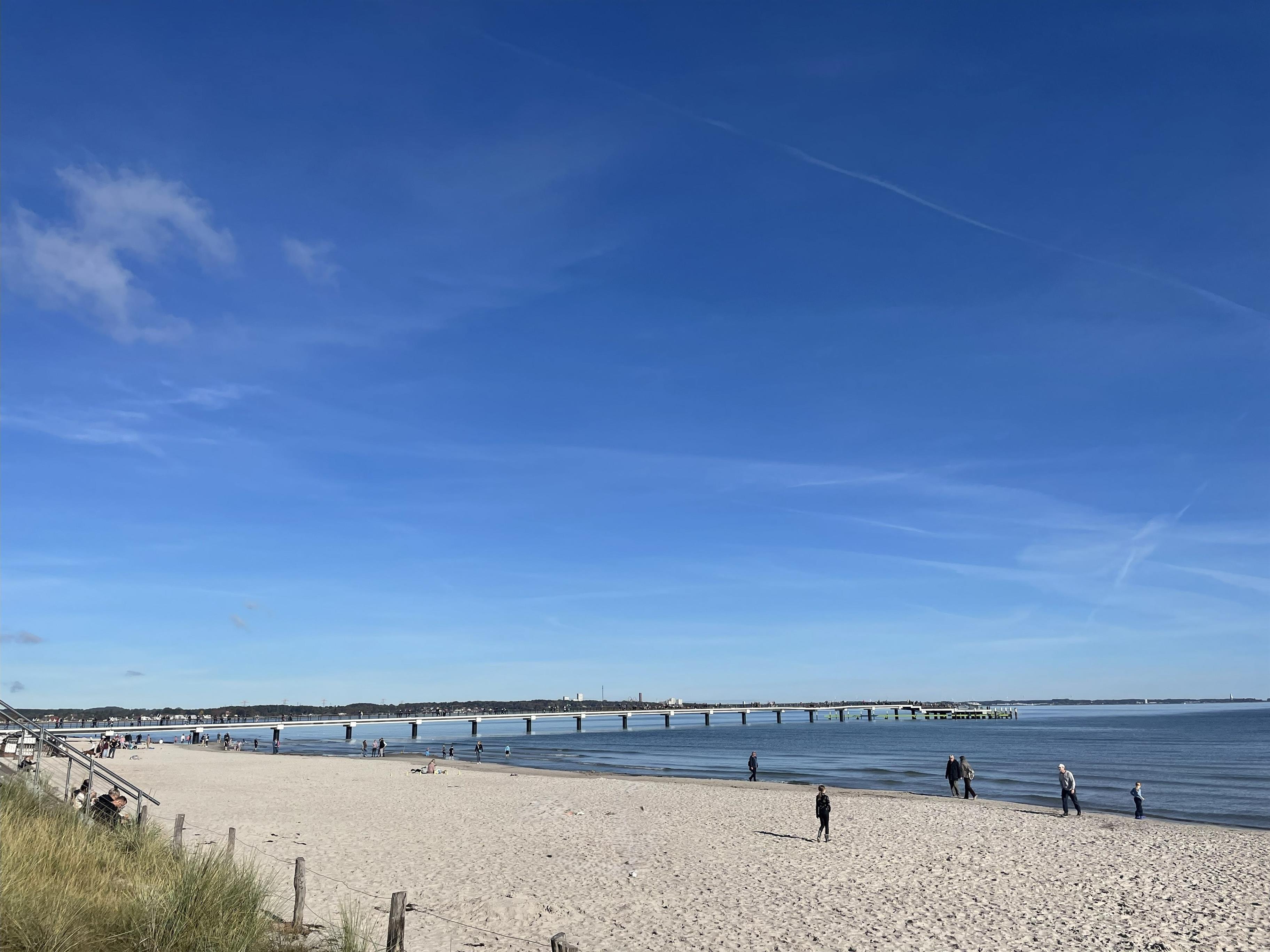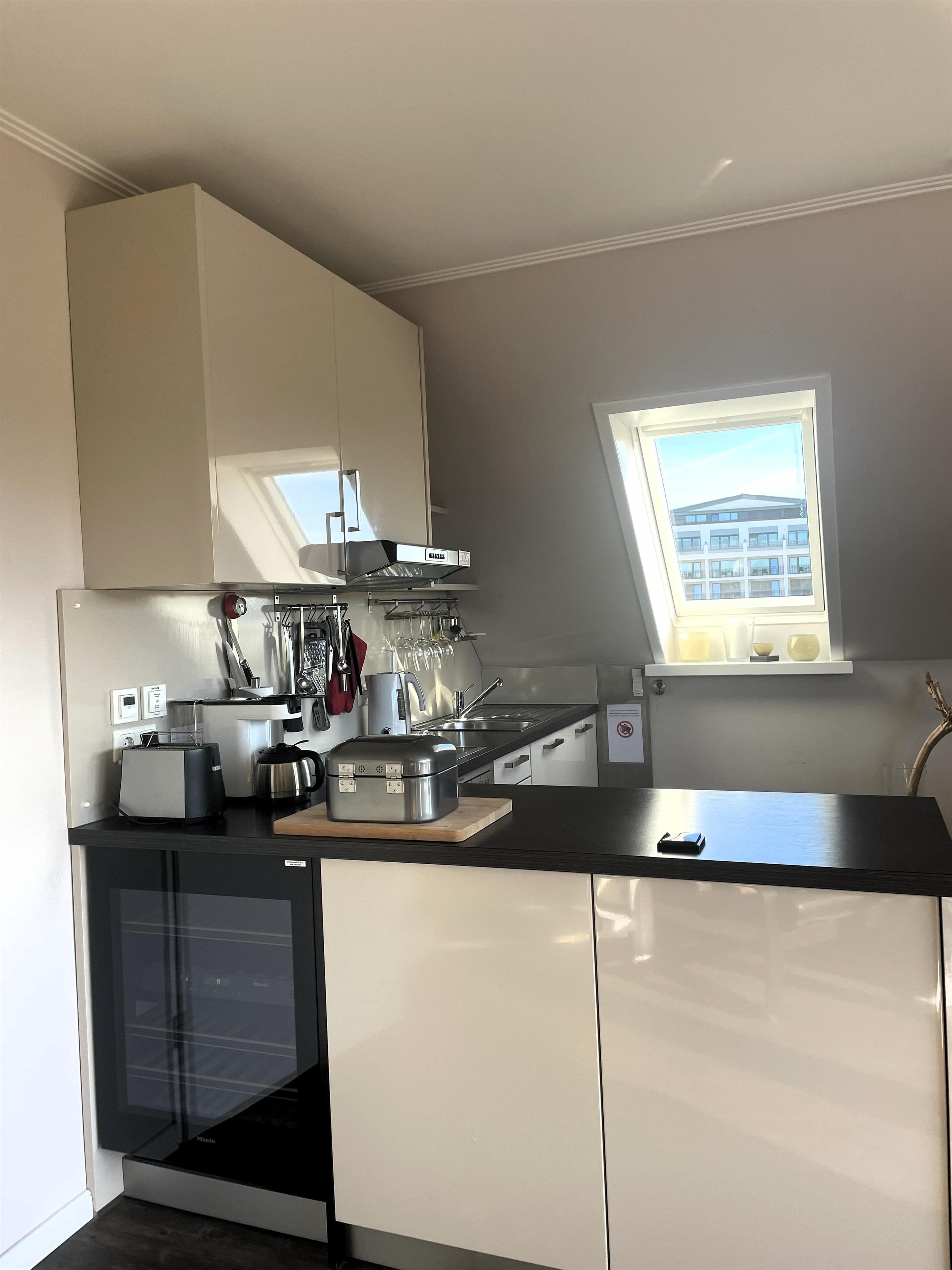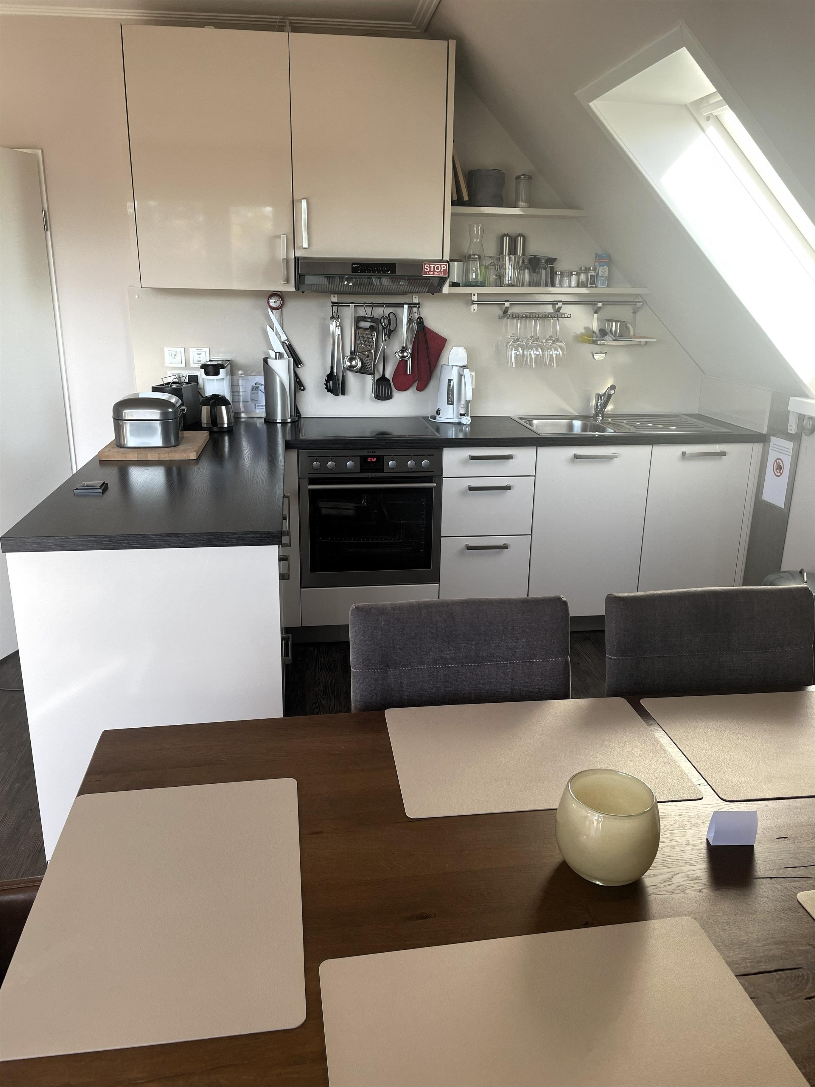 Wohnen mit Stil – dem Meer so nahIn der dritten Etage betreten Sie einen hellen Flur, der direkt in den modernen Wohn-Essbereich mit angeschlossener Pantryküche führt. Warme Farben, natürliche Materialien und liebevolle Details schaffen ein Ambiente, in dem man sofort zur Ruhe kommt. Das komfortable Sofa und der gemütliche Schwingsessel laden zum Entspannen ein – beim Fernsehen mit TV und DVD Player, beim Lesen oder beim Blick in den Scharbeutzer Kurpark.Vom Wohnbereich aus gelangen Sie auf den Süd-Balkon mit leichtem Meerblick – der perfekte Ort für genussvolle Stunden im Freien. Hier befindet sich eine elegante Essecke für vier Personen – ideal für ein gemütliches Frühstück in der Morgensonne oder ein entspanntes Abendessen mit Blick über Scharbeutz. Genießen Sie die frische Ostseeluft und das besondere Licht der Lübecker Bucht.Moderne Loungesessel laden anschließend dazu ein, den Tag bei einem Glas Wein und dem sanften Klang der Wellen stilvoll ausklingen zu lassen.Auf dem zweiten Balkon auf der oberen Etage erwarten Sie weitere komfortable Loungesessel – perfekt, um Sonne zu tanken, zu lesen oder einfach den Moment zu genießen.Komfort und AusstattungDer elegante Essbereich mit gemütlichen Freischwinger-Stühlen bietet genügend Raum für gemeinsame Mahlzeiten. In der modernen Pantryküche finden Sie alles was das Herz begehrt: Cerankochfeld, Backofen, Geschirrspüler, Kaffeemaschine, Wasserkocher, Toaster und einen exklusiven Weinkühlschrank – ideal für Genießer.Über die stilvolle Wendeltreppe gelangen Sie in den offen gestalteten Schlaf- und Relaxbereich. Hier erwartet Sie ein gemütliches Daybed zum Entspannen, lesen oder für Filmabende auf dem großen Flachbildfernseher mit Soundsystem. Wer aktiv bleiben möchte, nutzt das bereitliegende Hantelset. Das komfortable Doppelbett (1,60 x 2,00 m) – Einstieg nur über das Fußende möglich – sorgt für erholsamen Schlaf, während sich das Daybed zu einem Doppelbed für zwei Kinder verwandeln lässt – ideal für den Familienurlaub an der Ostsee.Wohlfühlbad und ExtrasDas Badezimmer in der unteren Etage ist hell und modern gestaltet, mit Dusche, Waschbecken, Spiegelschrank und großen Dachfenster. Ein Föhn steht selbstverständlich auch zur Verfügung.Zur weiteren Ausstattung gehören kostenfreies WLAN, Kinderreisebett, Hochstuhl, eine elektrische Markise auf dem unteren Balkon sowie ein reservierter Parkplatz direkt am Haus. Die Wohnung ist Nichtraucher-freundlich, Haustiere sind nicht gestattet. Im Haus stehen Waschmaschine und Trockner (gegen Gebühr) zur Verfügung. Im Erdgeschoss lädt ein Gemeinschaftsraum mit Tischtennisplatte und Tischkicker zu geselligen Stunden ein – perfekt für Familien und Freunde.