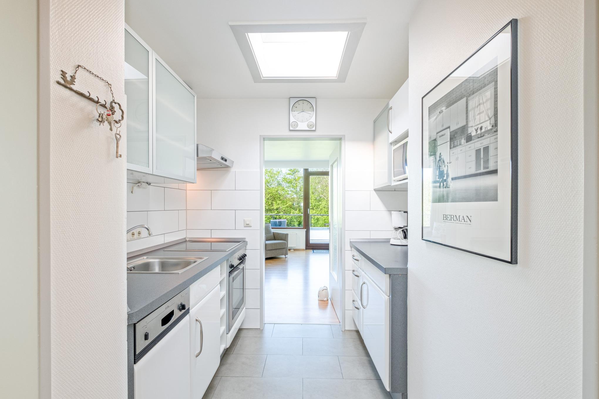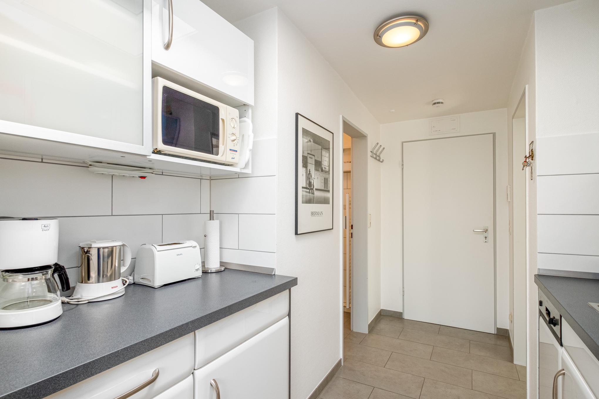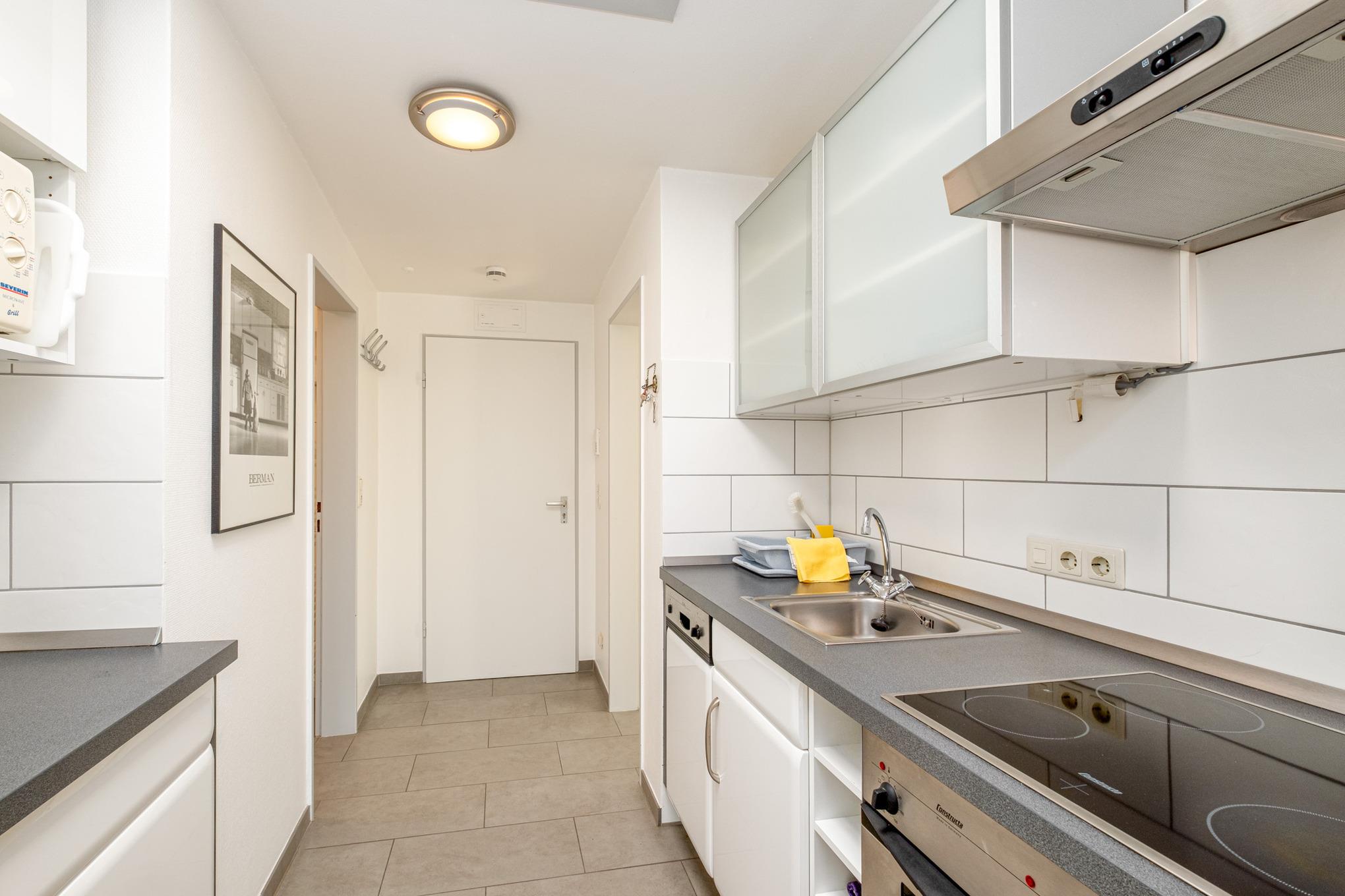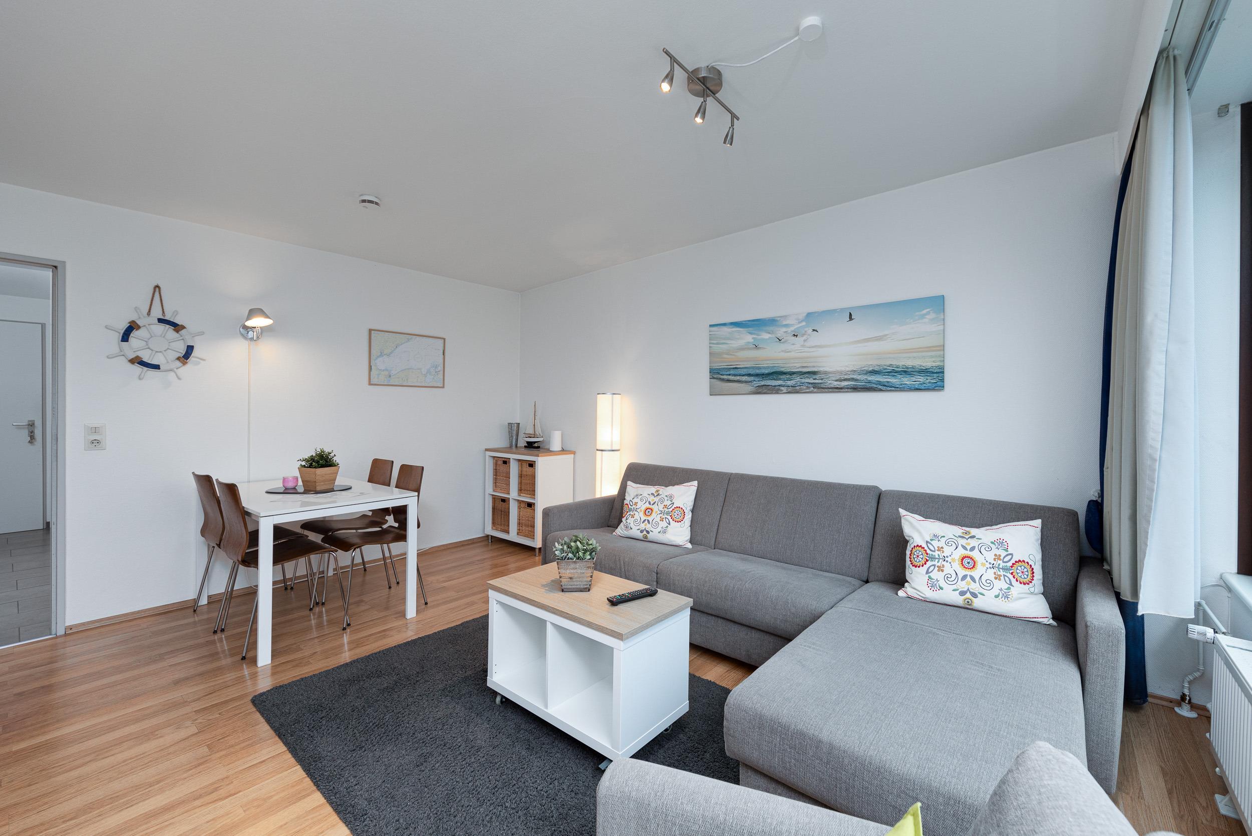Es erwartet Sie das helle und freundliche 2-Zimmer-Appartement Nr. 28 auf der 3. Etage für bis zu 4 Personen. Der Wohn-Essbereich der Scharbeutz Ferienwohnung ist mit einer komfortablen Couchgarnitur mit Schlaffunktion (1,80m x 2,00m), einem Flatscreen-TV und einem gemütlichen Essbereich ausgestattet. Die offene Küchenzeile in der Diele verfügt unter anderem über ein Cerankochfeld, einen Backofen, eine Filterkaffeemaschine und einen Wasserkocher.