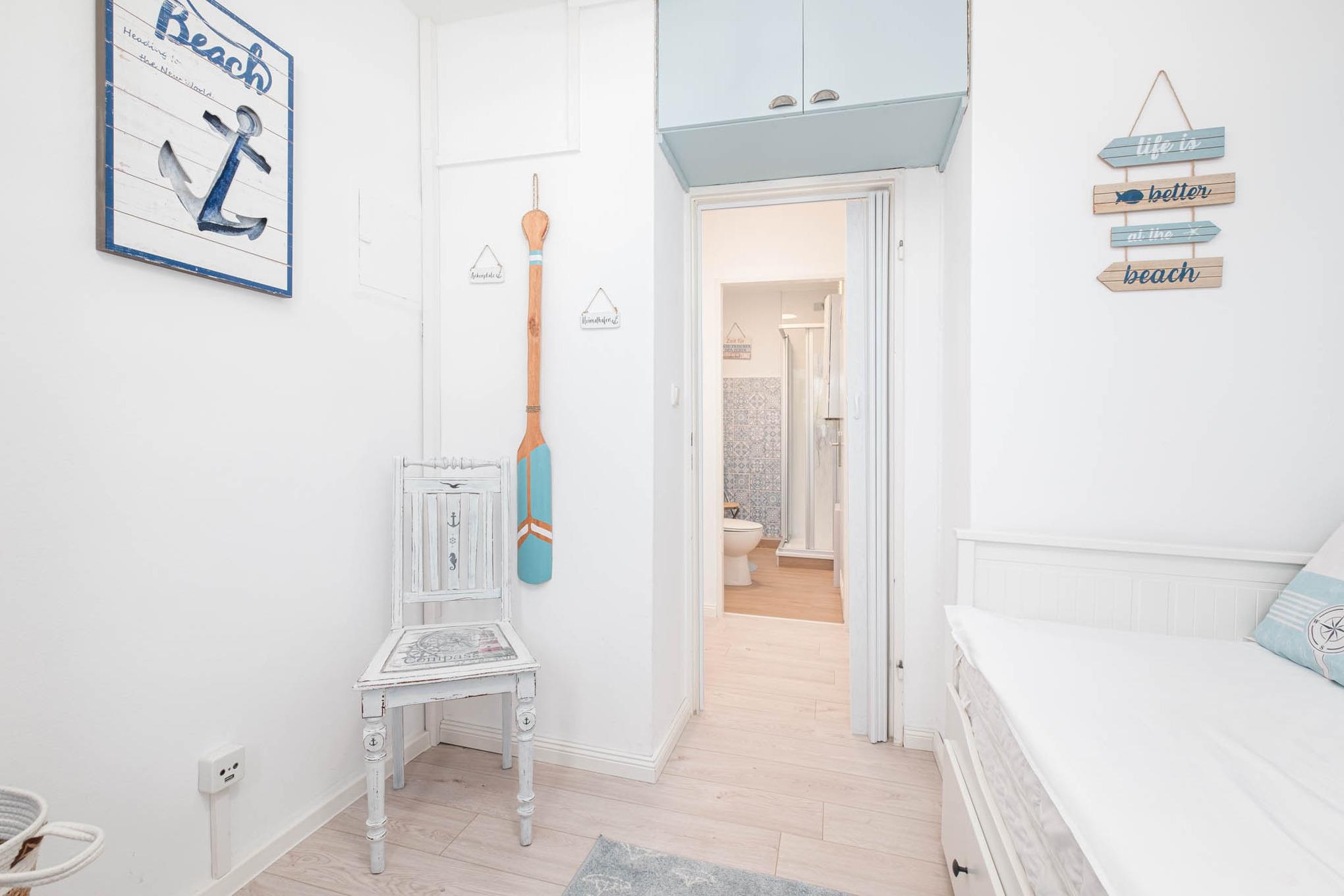 Auf der ersten Etage des Mehrfamilienhauses lädt Sie bereits die Diele in ein helles und maritimes Wohnflair ein, dass sich wie ein maritimer, blauer Faden durch das Gestaltungskonzept der mit viel Herz gestalteten Ferienunterkunft zieht.