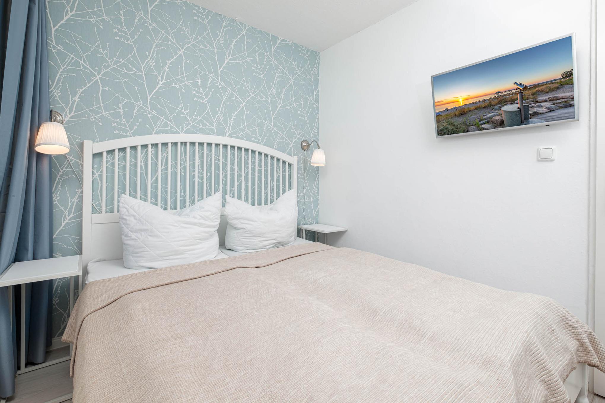 Das Schlafzimmer I ist mit einem Doppelbett (160x200cm), einem Einbauschrank sowie einem Flatscreen-TV ausgestattet.