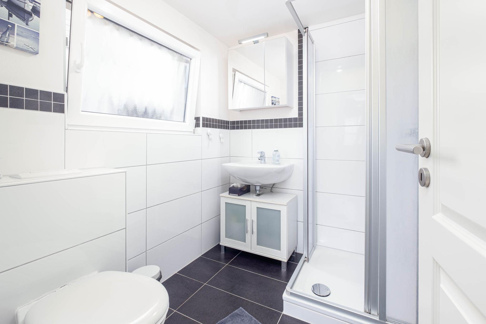 Vom Wohnbereich aus erreichen Sie das moderne Badezimmer mit WC und Dusche.