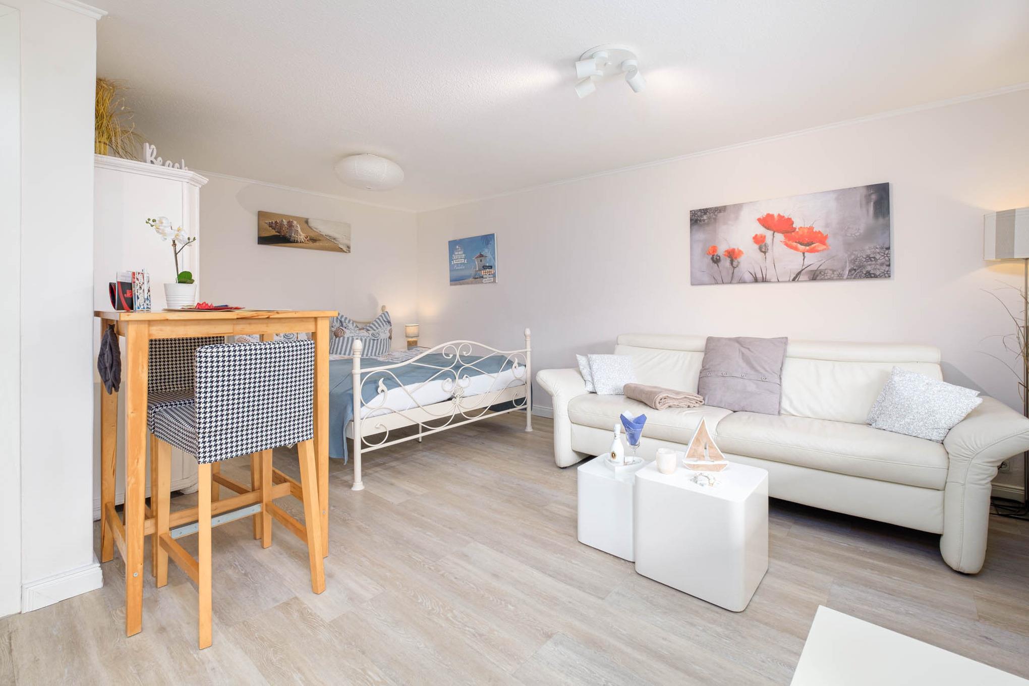 Die Scharbeutz Ferienwohnung Nr. 2 ist für maximal 2 Personen ausgelegt und befindet sich im Untergeschoss mit großzügiger Terrasse. Auf ca. 25qm erwartet Sie eine gemütlich und maritim eingerichtetes 1-Zimmer-Appartement.