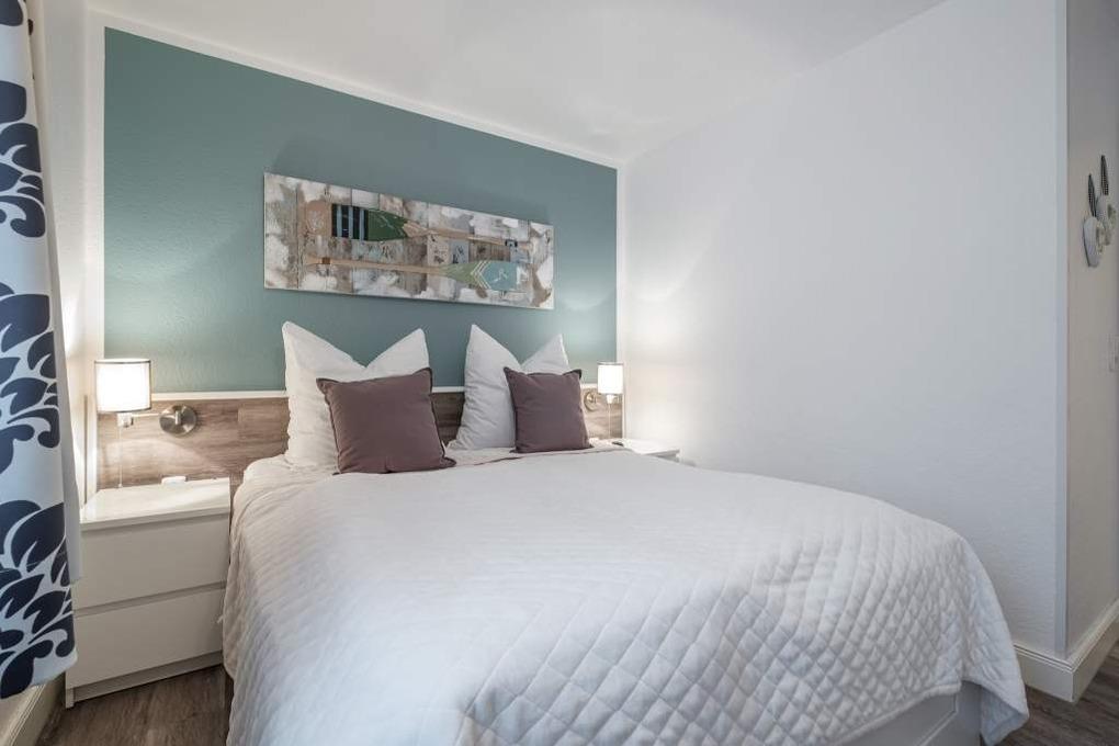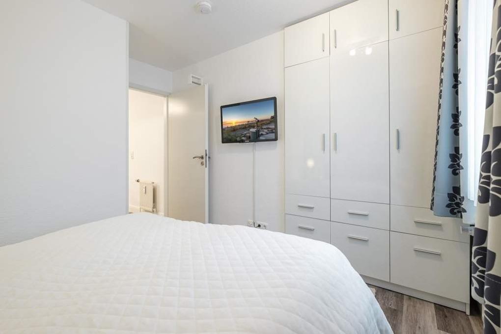 Das separate Schlafzimmer der Scharbeutz Ferienwohnung ist mit einem Doppelbett (160x200 cm, 2 einzelne Matratzen), einem 2. Flatscreen-TV und einem Kleiderschrank eingerichtet. Um Ihnen einen erholsamen Schlaf zu garantieren, lassen sich die Wohn- und Schlafräume der Ferienwohnung mittels Verdunkelungsgardinen abdunkeln.