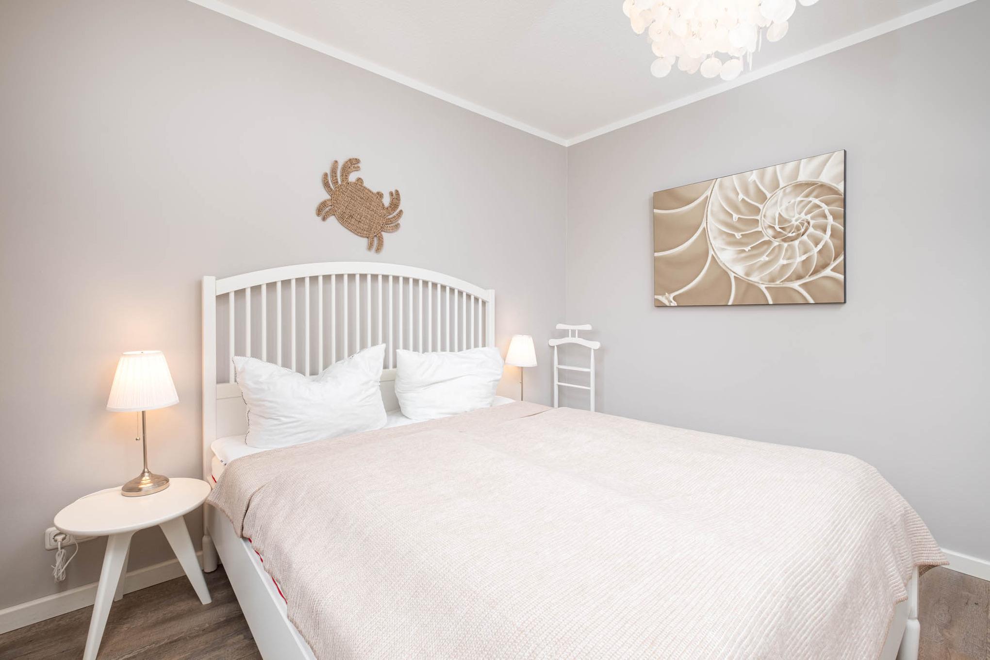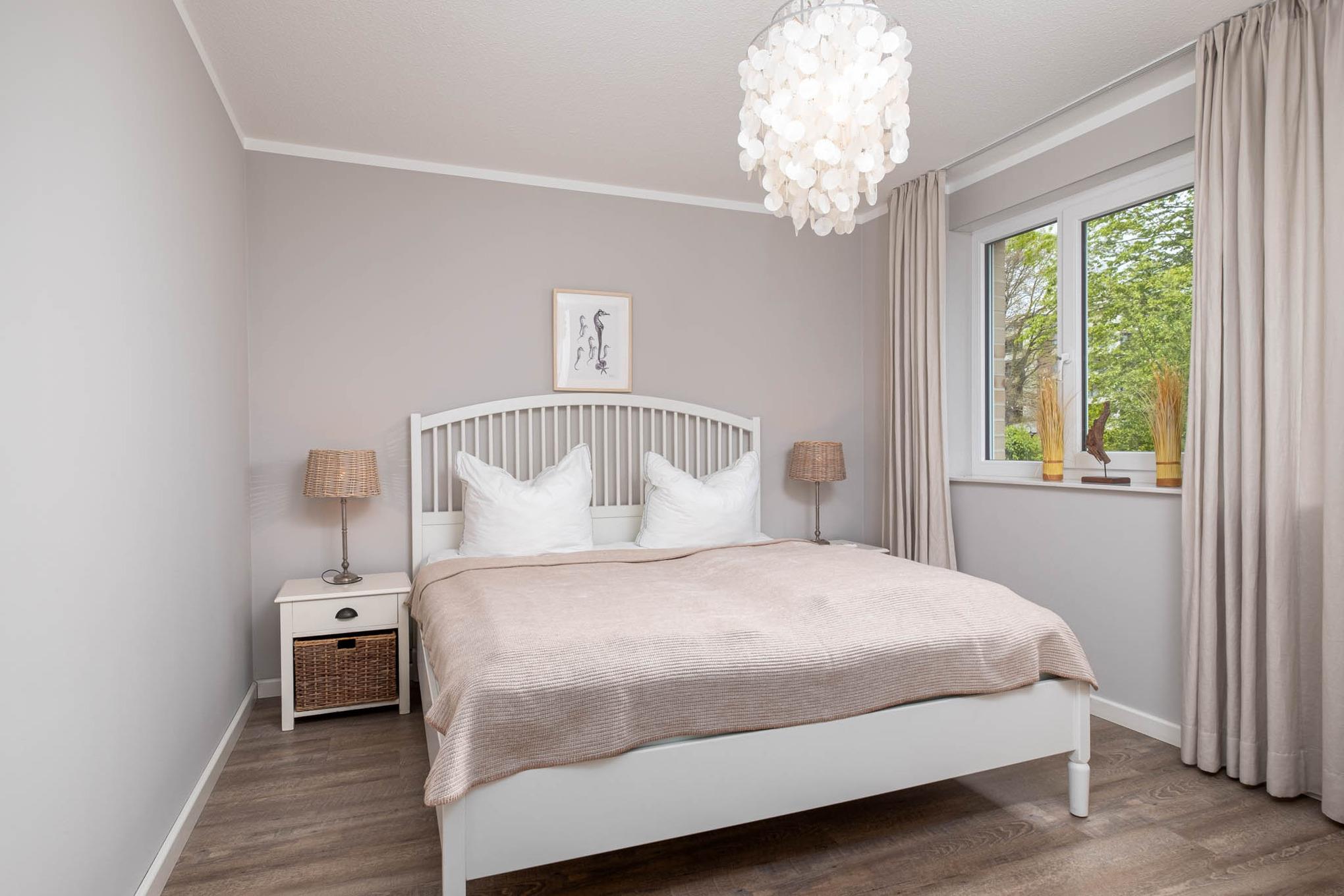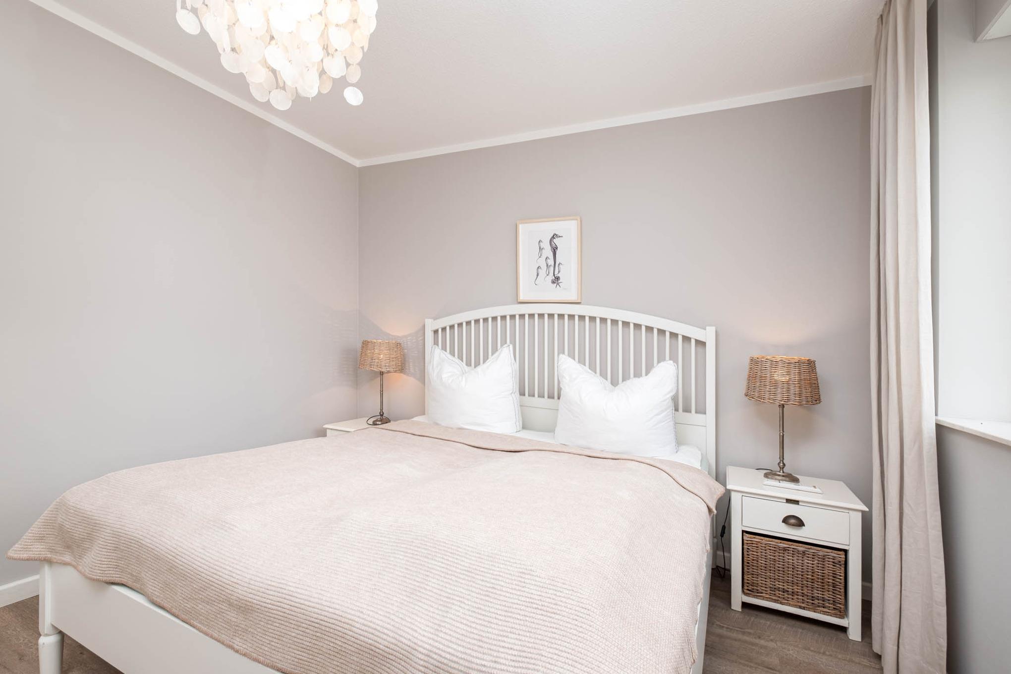 Zwei separate Schlafzimmer sind in dieser Scharbeutz Ferienwohnung vorhanden. Ein Schlafraum verfügt über ein Doppelbett (180x200cm), der zweite Schlafraum ist mit einem französischen Doppelbett (160x200cm) ausgestattet. Beide Schlafräume verfügen über einen zusätzlichen Flatscreen-TV und Kleiderschrank. Für die fünfte Person steht Ihnen ein mobiles Klappbett (90x180cm) zur Verfügung. Ein wunderschönes Bad mit bodengleicher Dusche und eine großzügige Diele mit großem Abstellraum runden dieses moderne Urlaubsdomizil in Scharbeutz ab. Zudem lässt sich die komplette Ferienwohnung durch Außenjalousinen abdunkeln.