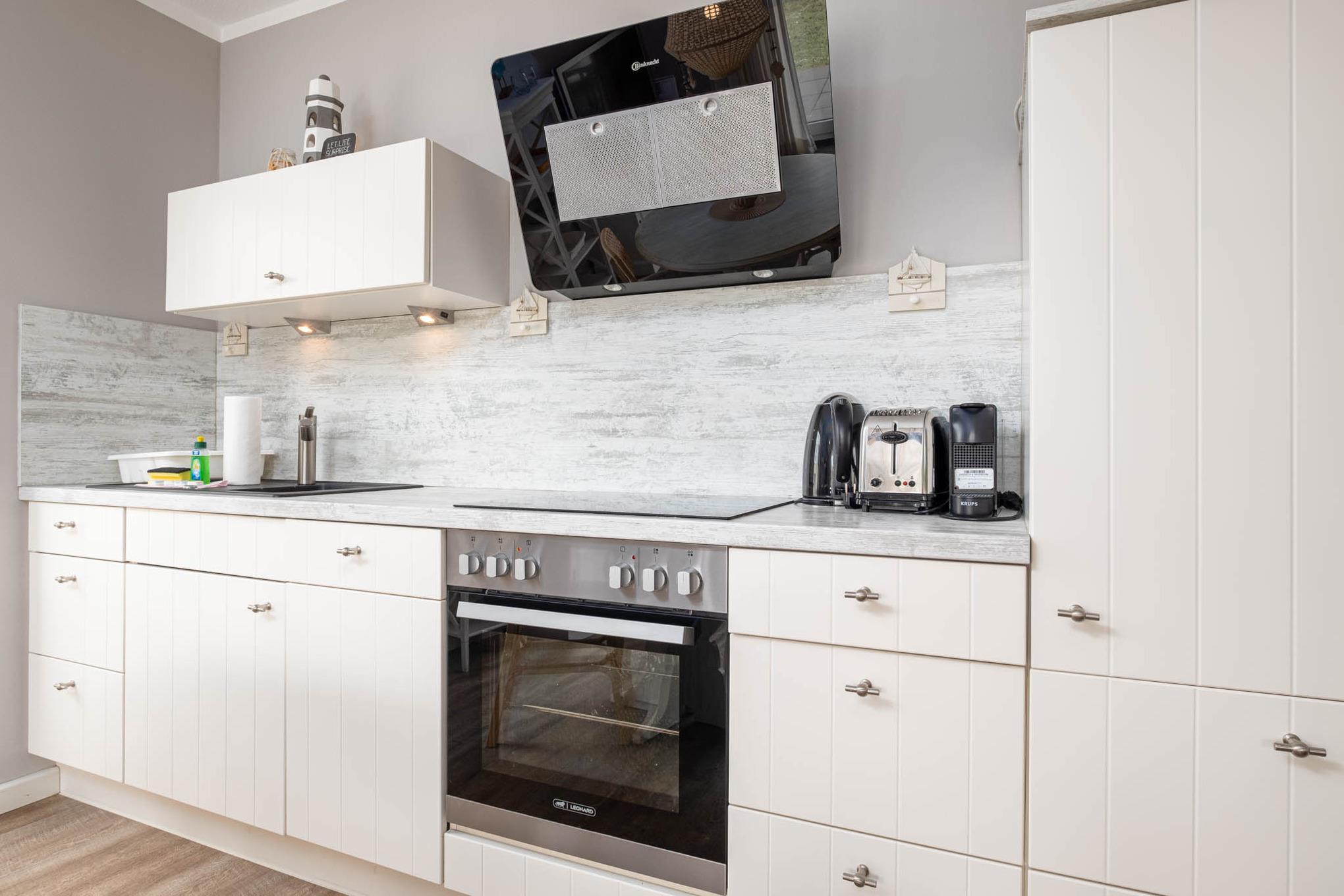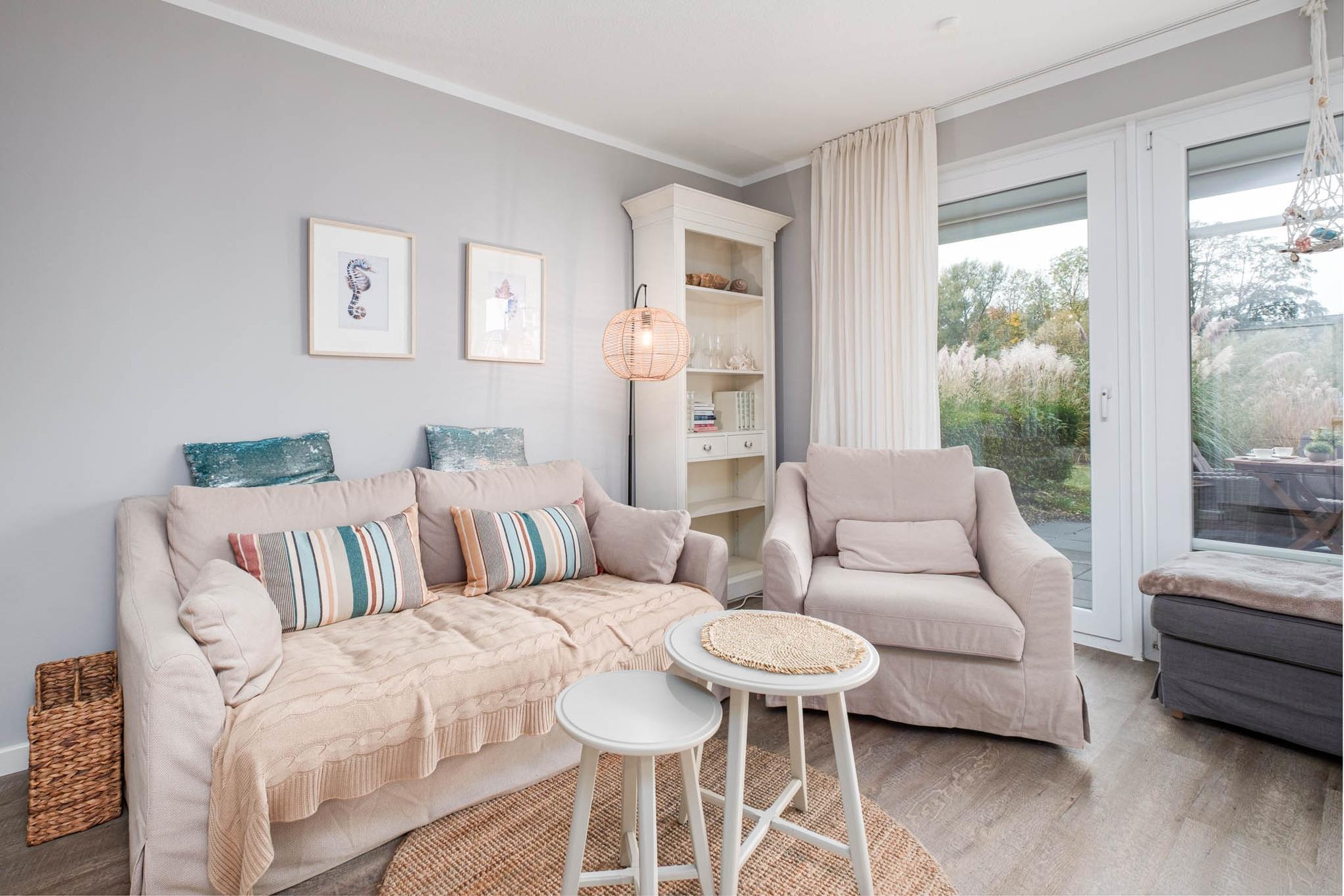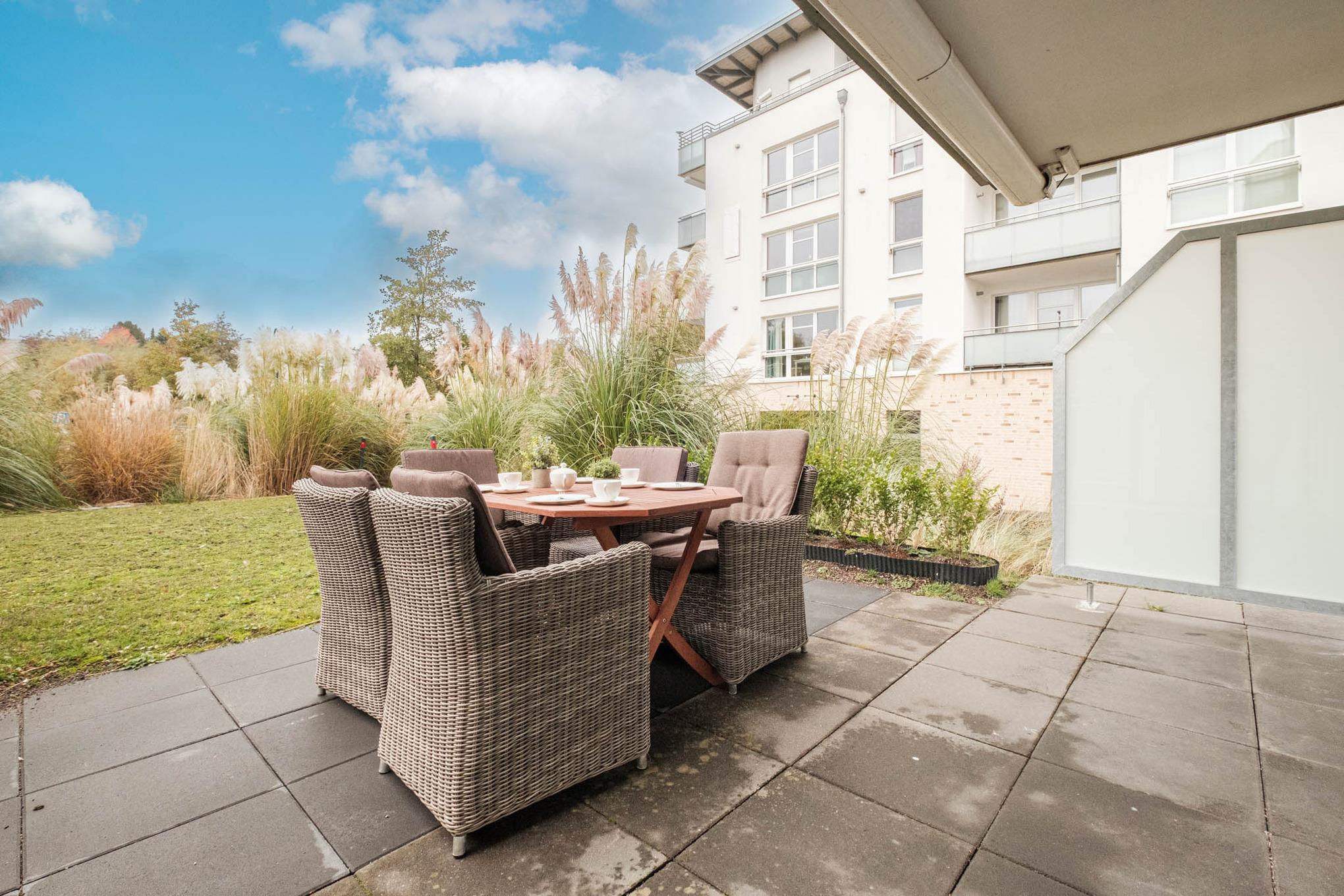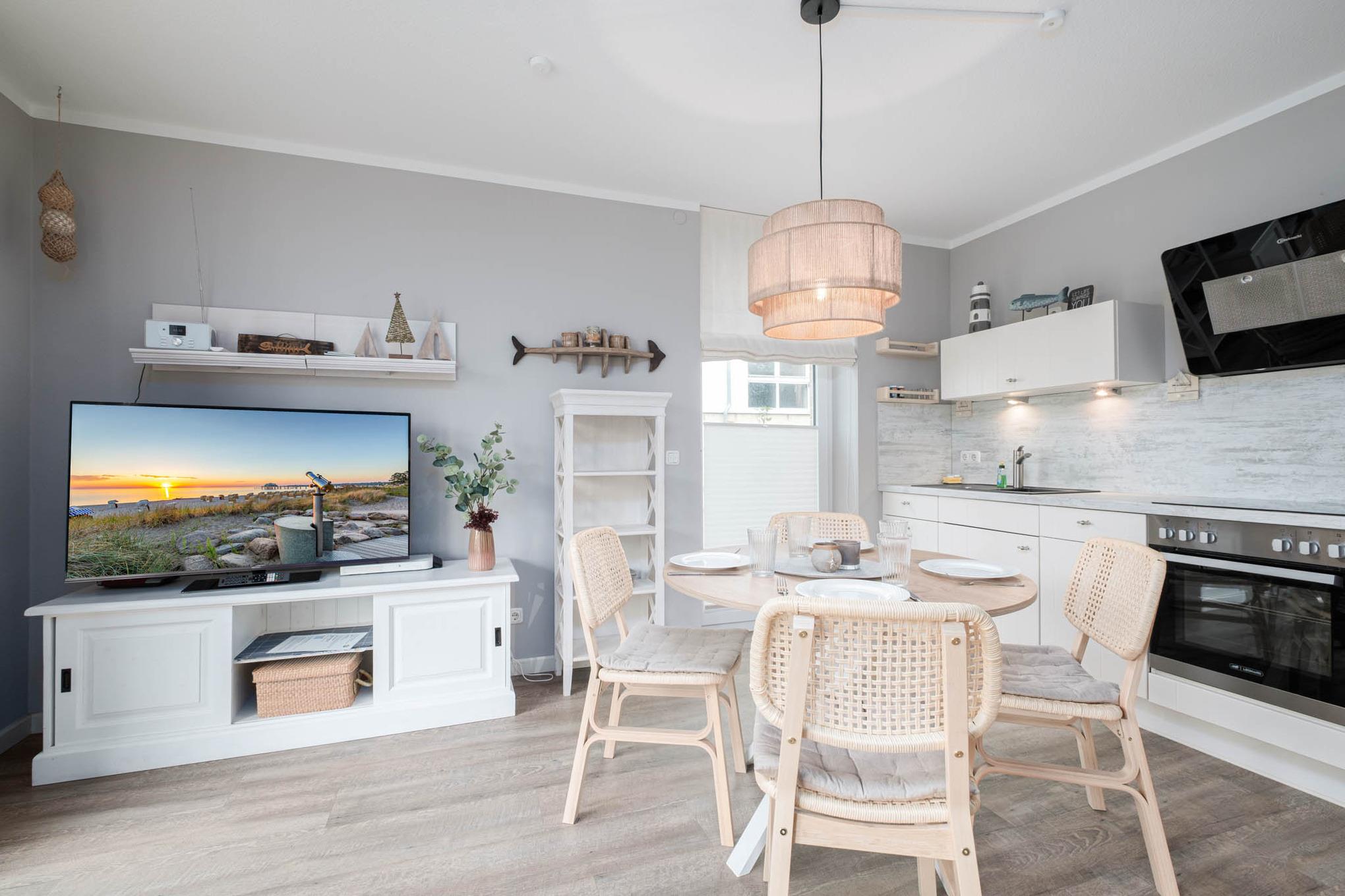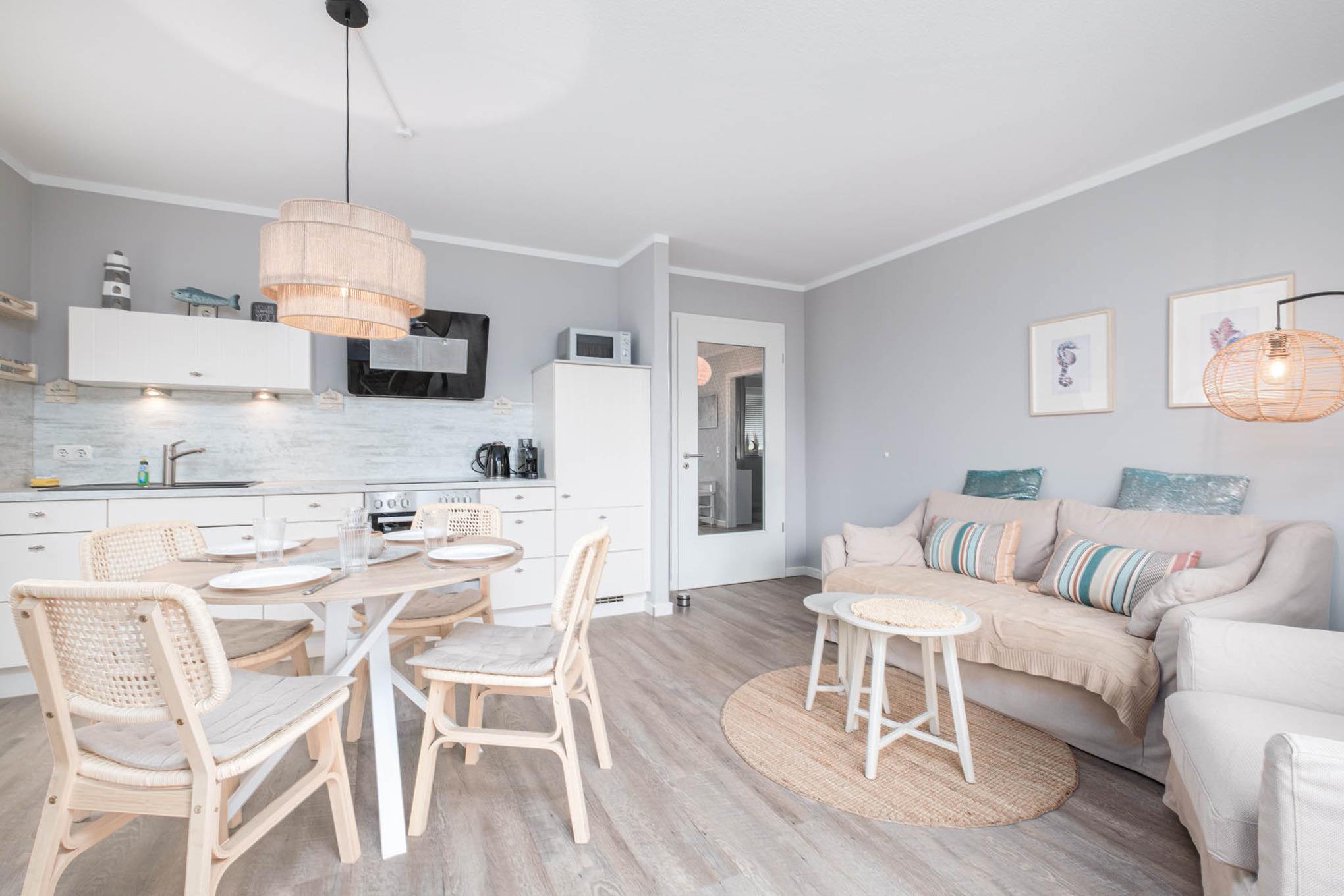 Das moderne 3-Zimmer-Appartement ist für 5 Personen geeignet. Die Ferienwohnung Scharbeutz befindet sich im Erdgeschoss mit möblierter Terrasse in Süd-West-Richtung mit Markise. Das Wohnzimmer ist mit einer Couchgarnitur, Flatscreen-TV, Stereo-Anlage und einer gemütlichen Essecke ausgestattet. Die offene Einbauküche schließt sich an die Essecke an und verfügt über Ceranfeld, Backofen, Mikrowelle, Nespresso Maschine und Geschirrspüler.