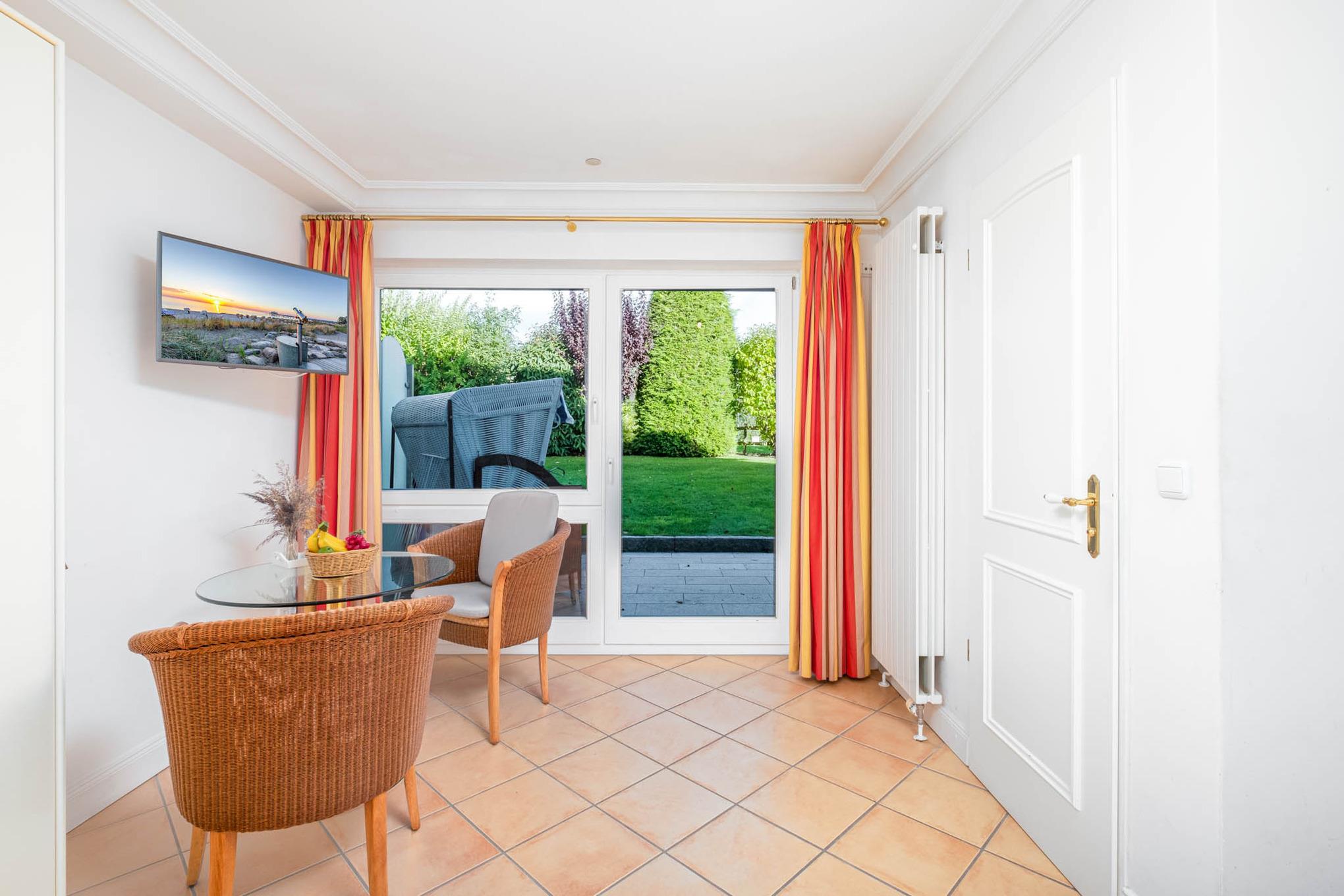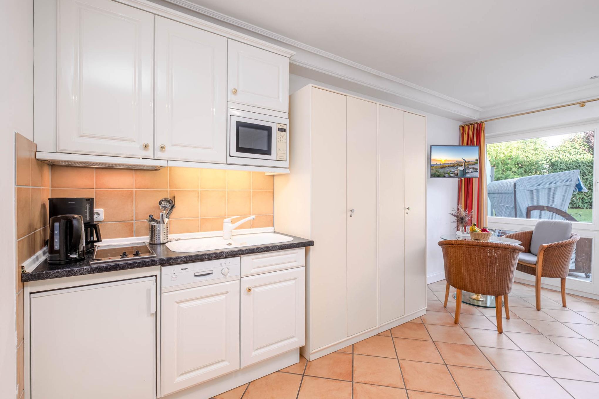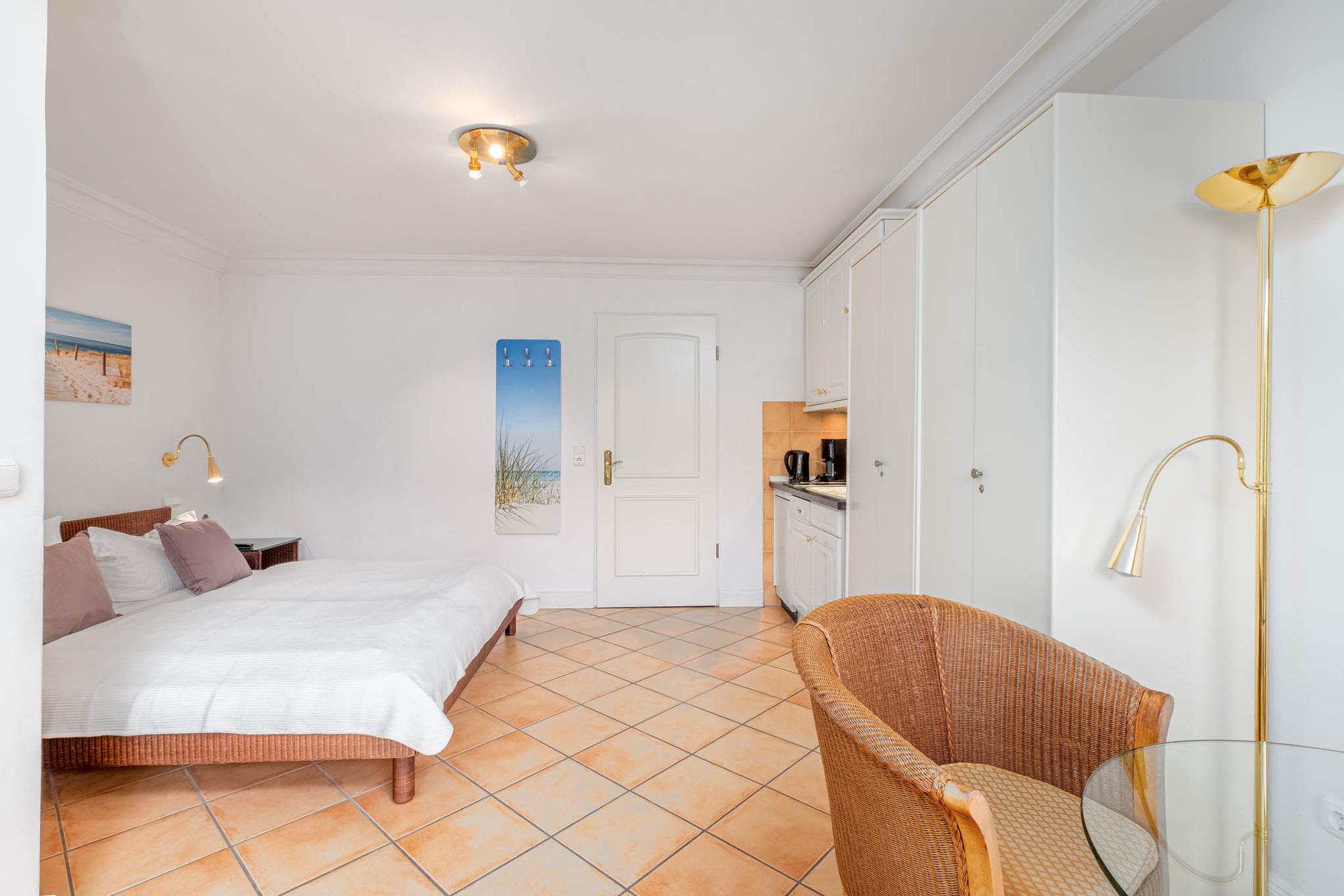 Im Appartement Nr. 2 erwartet Sie ein kombiniertes Wohn-/Schlafzimmer mit Doppelbett (180x200 cm), Flatscreen-TV und Essecke. Eine kleine Pantry Küche befindet sich im Wohnraum der Ferienwohnung Scharbeutz. Sie ist mit 2-Platten-Ceranfeld, Geschirrspüler und Mikrowelle ausgestattet. Das Badezimmer des Appartements verfügt über eine Dusche. Um Ihnen einen erholsamen Schlaf zu garantieren, lassen sich die Schlafräume der Ferienwohnung verdunkeln.