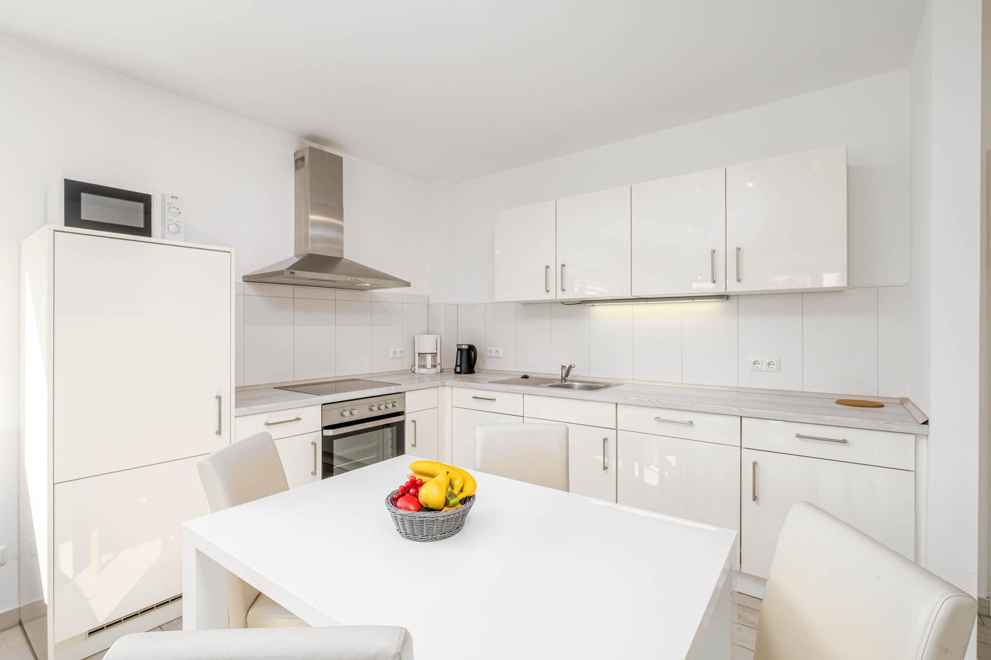 In der Strandzeit #3 begrüßt Sie eine komplett neue und sehr moderne 3-Zimmer-Ferienwohnung für maximal 4 Personen in der 1.Etage mit überdachtem Balkon in Süd-Ausrichtung. Das Wohnzimmer ist mit einer Couchgarnitur, einem Flatscreen-TV, einem großzügigen Essbereich sowie der Einbauküche eingerichtet. Die Küche ist mit einem Cerankochfeld, Backofen, Geschirrspüler, Mikrowelle, Toaster und einem Wasserkocher ausgestattet.