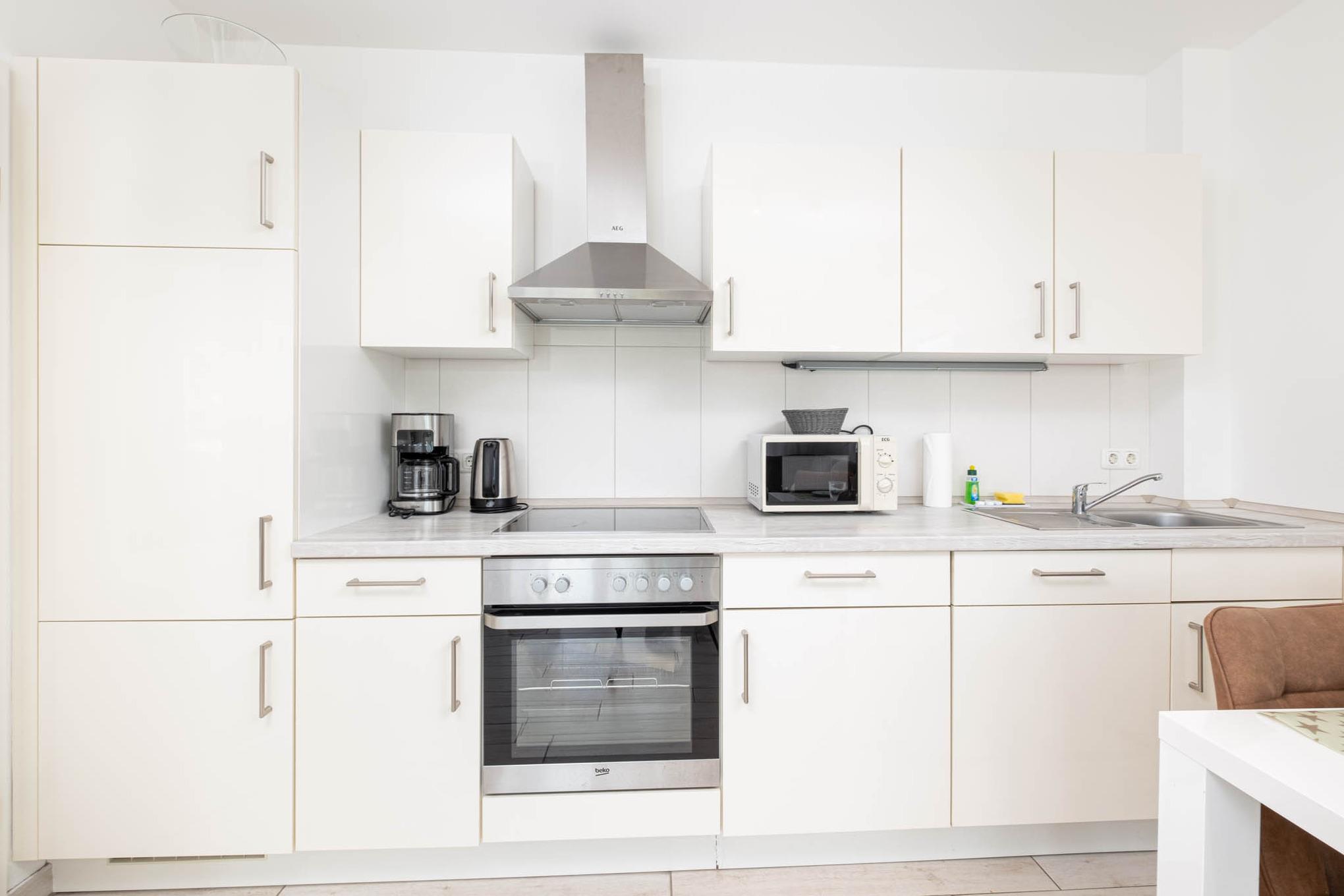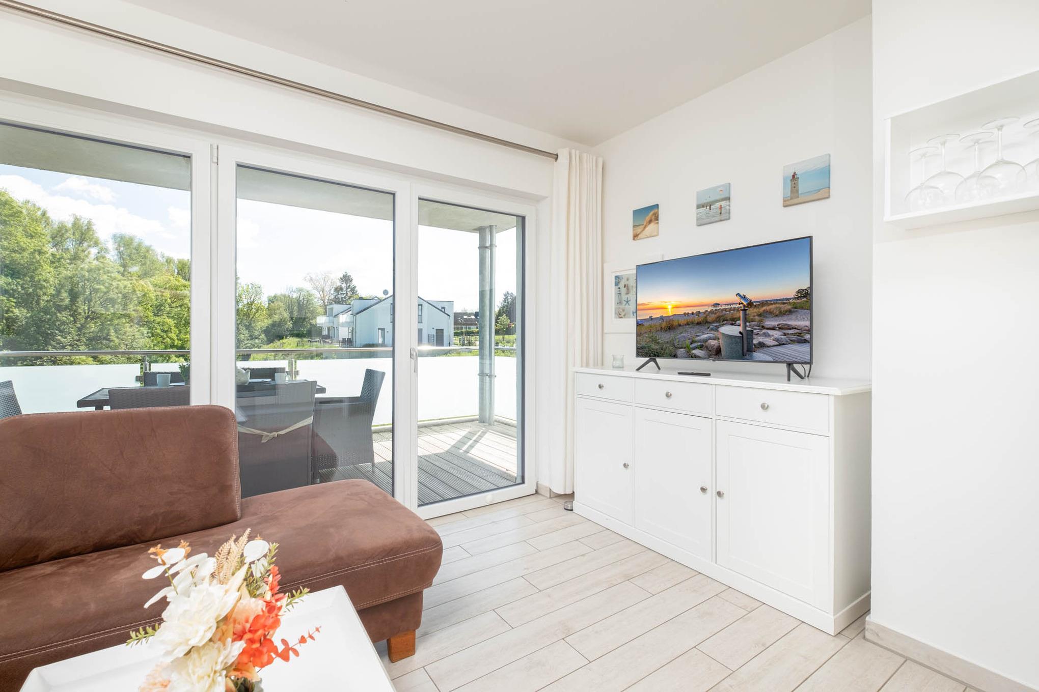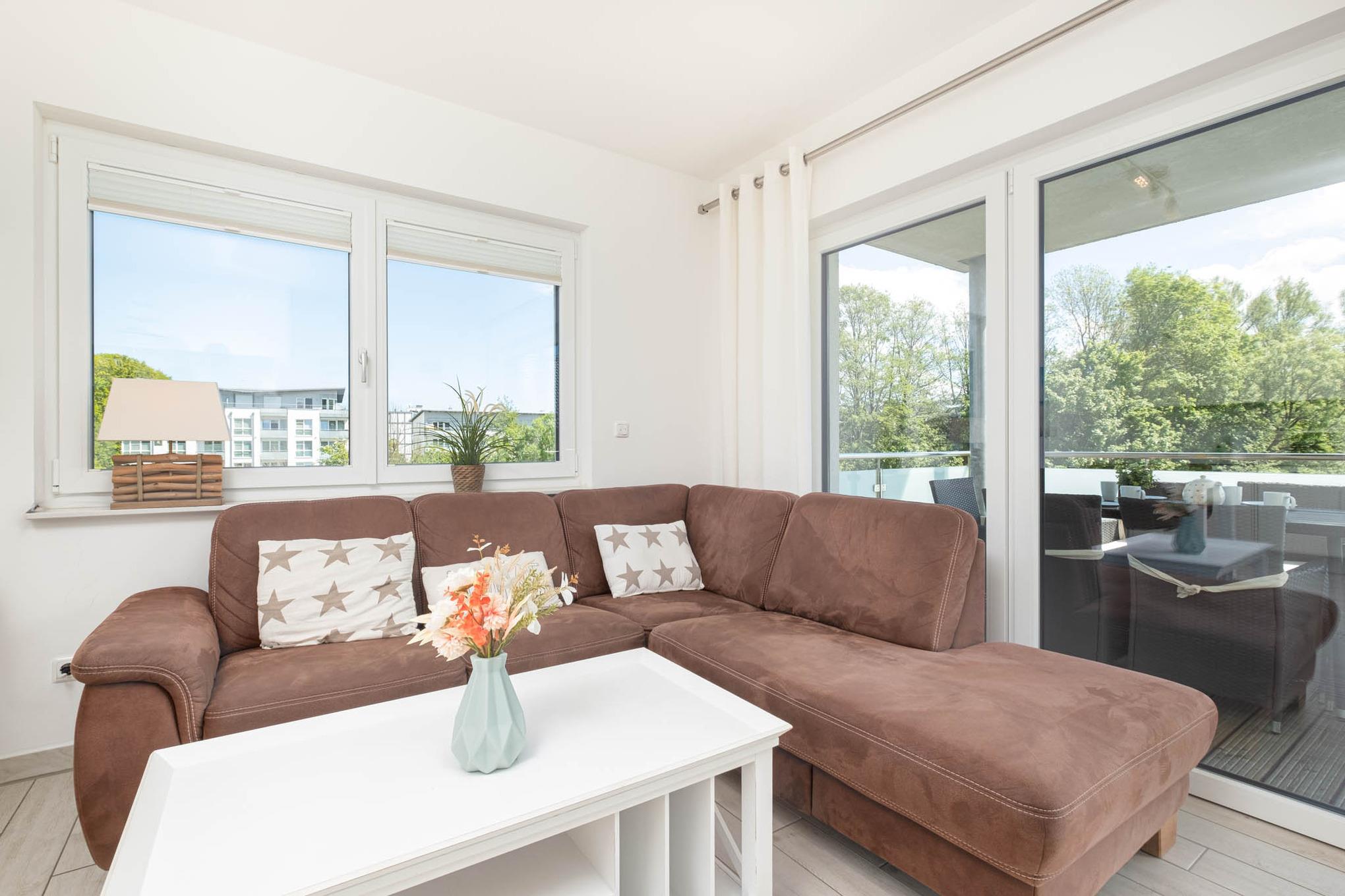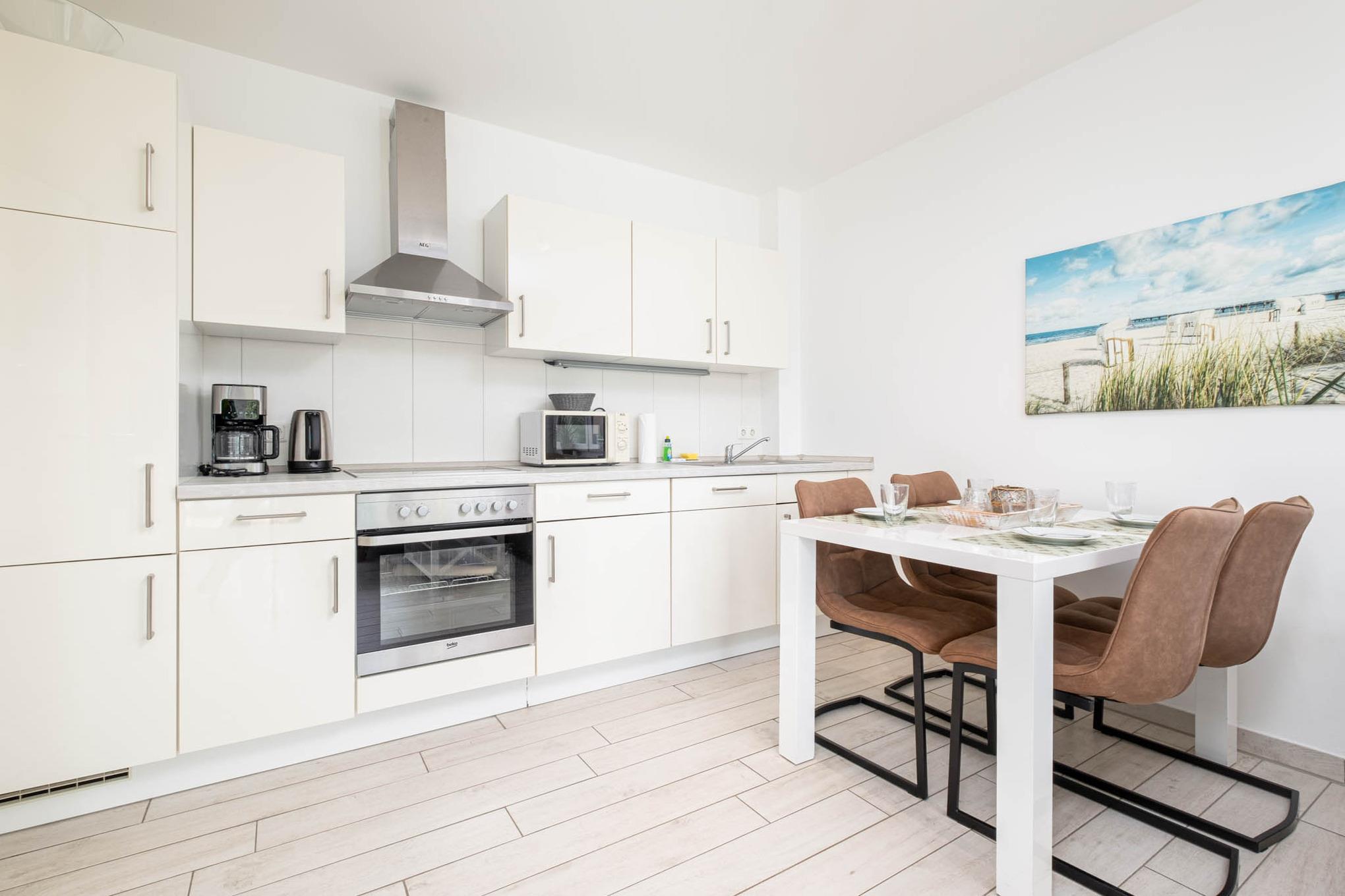Dieses wunderschöne und neue 3-Zimmer-Appartement Strandzeit #4 verfügt über 2 separate Schlafzimmer und bietet Platz für maximal 4 Personen. Das Wohnzimmer ist mit einem Flatscreen-TV, der gemütlichen Couchgarnitur, einem Essbereich sowie der Küche mit den modernsten Geräten, wie Backofen, Ceranfeld, Geschirrspüler und Mikrowelle ausgestattet.
