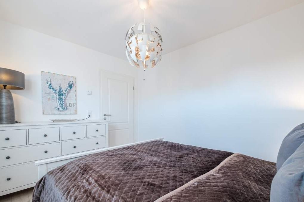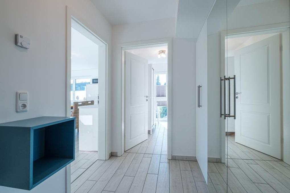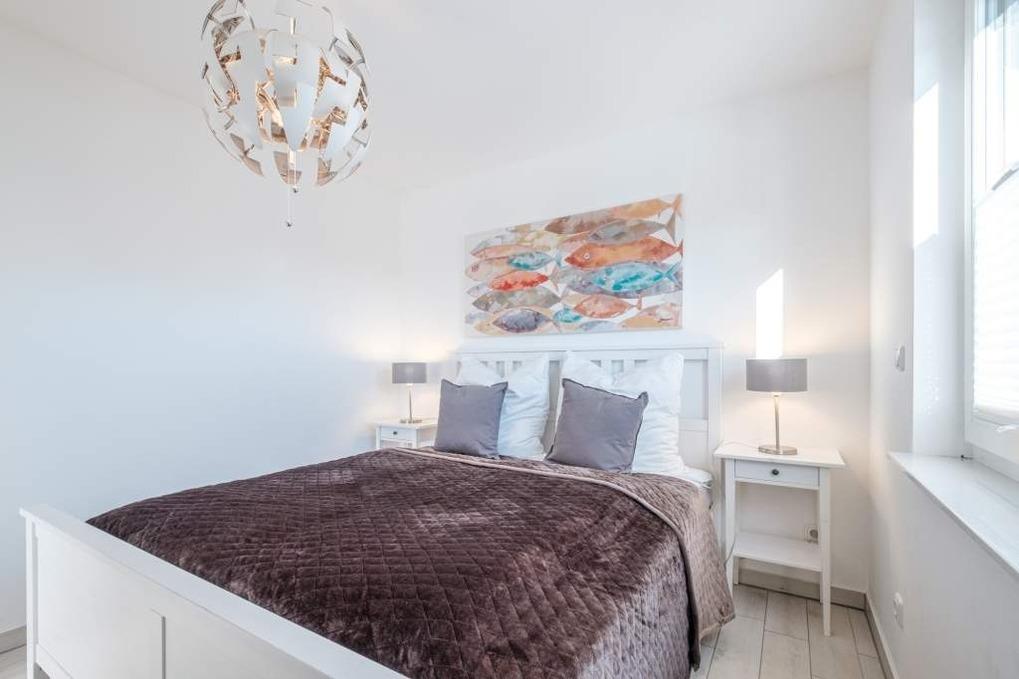 Die beiden separaten Schlafzimmer sind jeweils mit einem Doppelbett (160x200cm) und einem Kleiderschrank eingerichtet. Das Schlafzimmer I besitzt zusätzlich eine Sitzecke, die zur Entspannung einlädt und einen schönen Rückzugsort bietet. Im Flur befindet sich ein geräumiger Einbauschrank.