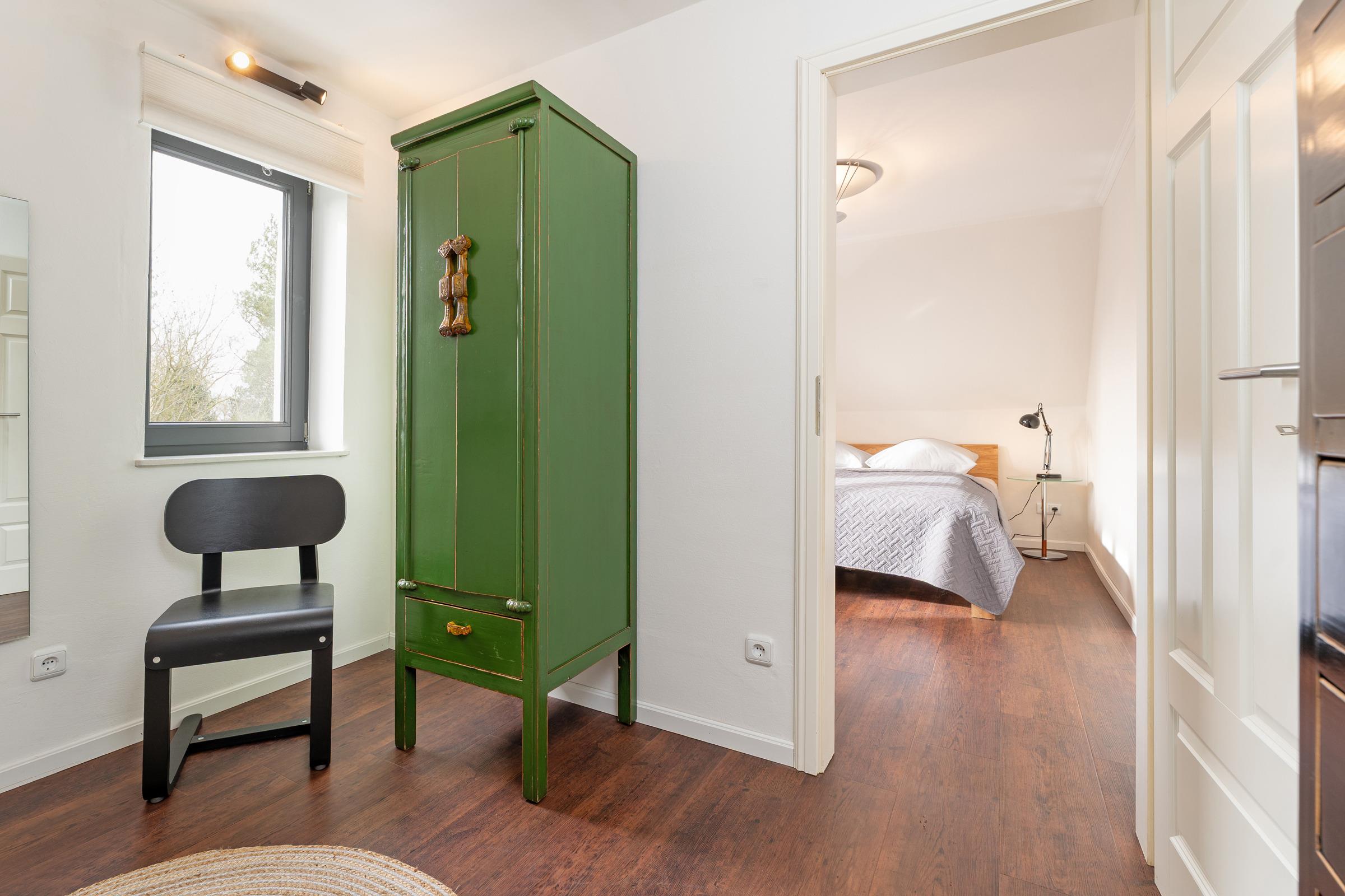 Schlafzimmer (1.OG): 1 Doppelbett (2x 80 x 200 cm), Kleiderschrank, TV, Verdunkelung: Jalousie & Vorhänge, Platz für ein Babybett vorhanden