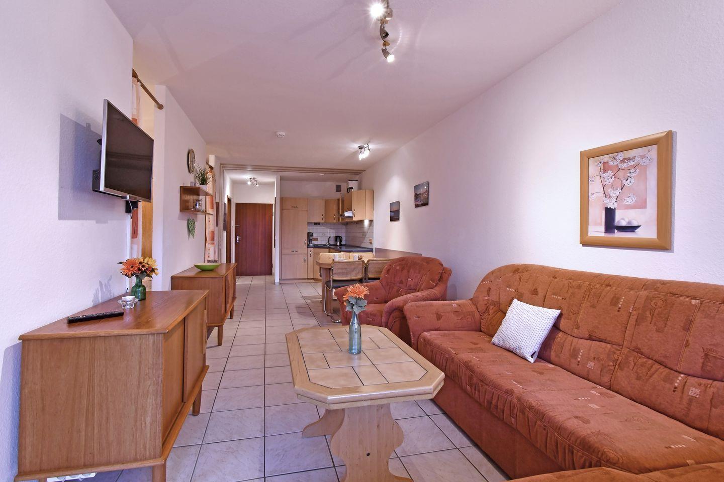 Das ca. 56 qm große 3-Zimmer-Appartement befindet sich im 3. OG und ist bequem mit dem Lift erreichbar. Das Appartement hat einen großen Teilseeblick-Balkon. Der Wohnraum ist mit einem Sofa sowie einem Couchtisch und LCD TV ausgestattet.