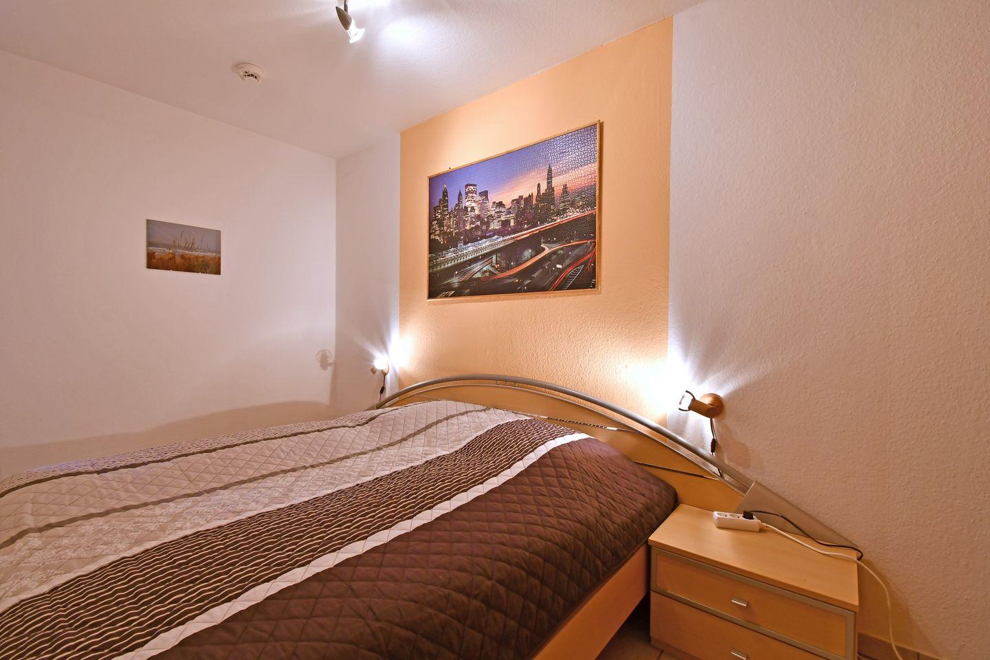 Im Schlafbereich gibt es ein Doppelbett (1.80x2m/Einzelmatratzen) mit Nachttischen und einen großen Kleiderschrank für Ihre Garderobe. Dieser Bereich ist ohne Tür und verfügt auch nicht über ein Fenster.