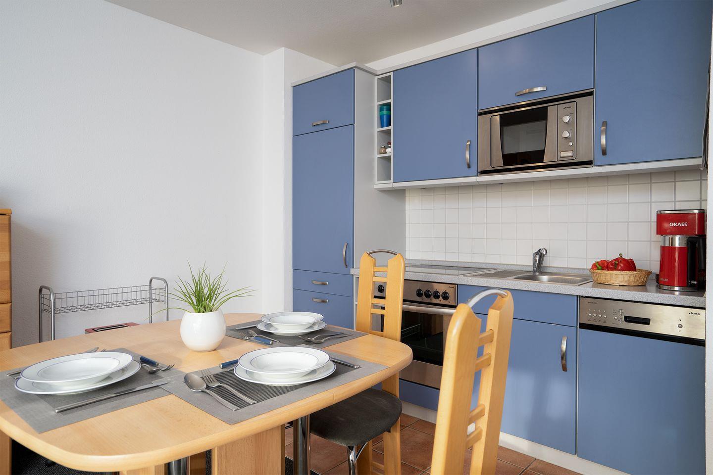Es gibt ein Polstersofa, welches auch als Schlafsofa umwandelbar ist, zwei Sessel, einen Couchtisch, sowie einen Flachbild-TV. Kostenfreie W-Lan-Nutzung auf eigene Verantwortung (bei Störung kein Ersatzanspruch). Die moderne, integrierte Einbauküche ist u.a. mit Geschirrspüler und Mikrowelle ausgestattet. Der Essplatz bietet ausreichend Platz für alle Personen.