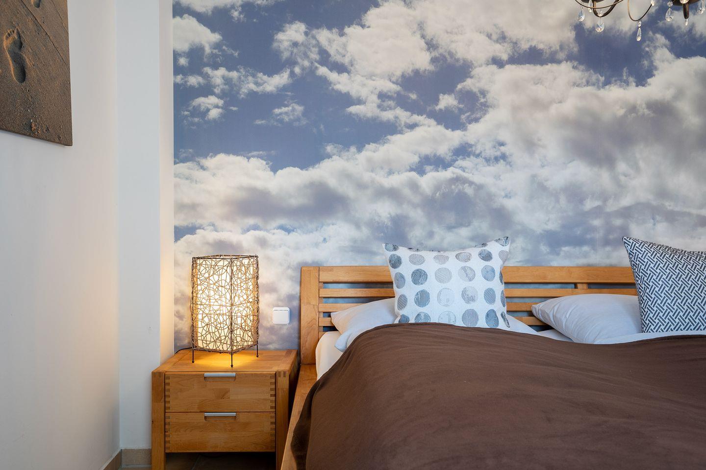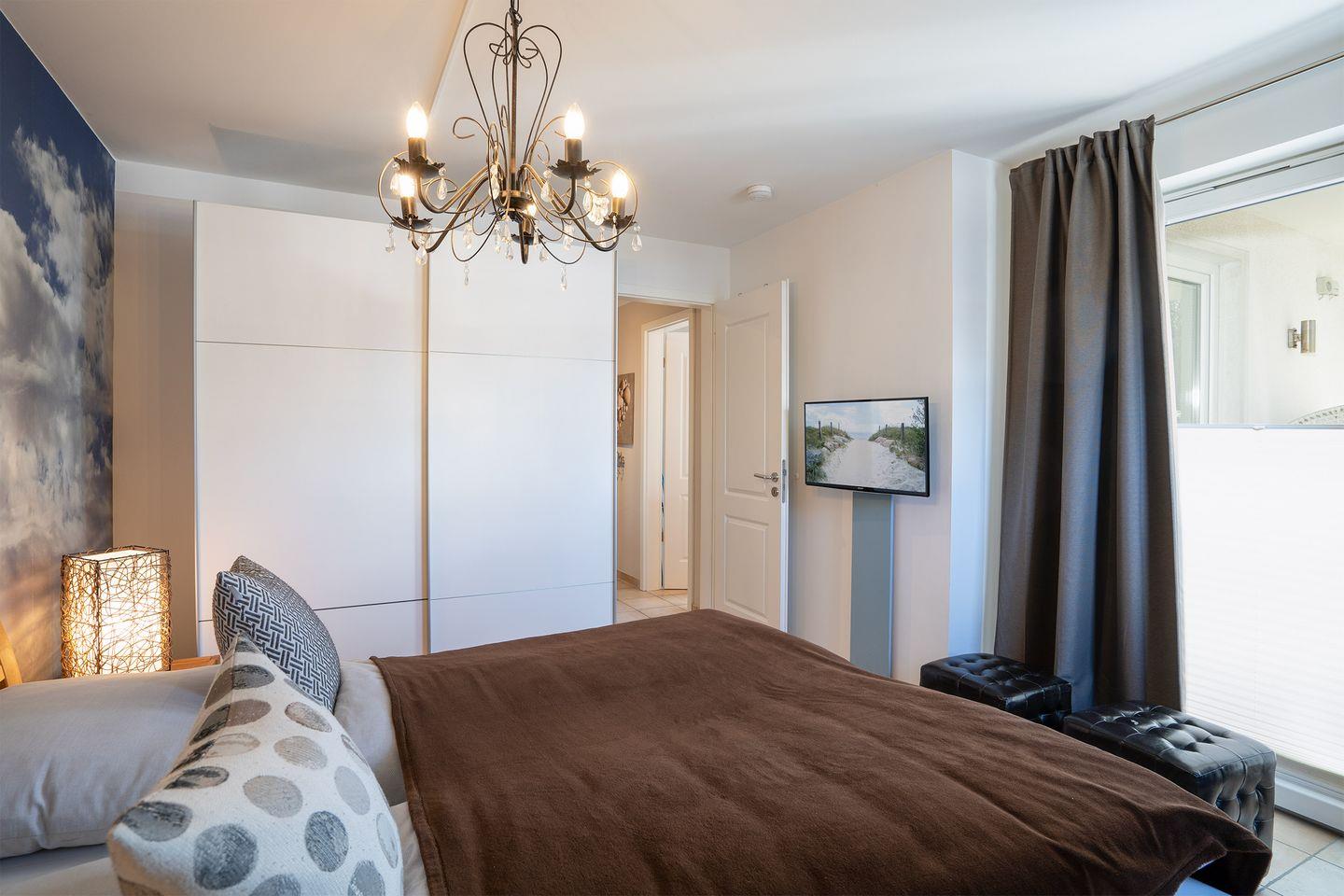 Von dem größeren Schlafraum gelangen Sie auf die große Sonnenterrasse, auf der Sie die herrliche Abendsonne genießen können. Hier steht auch ein Strandkorb zum Wohlfühlen für Sie bereit.