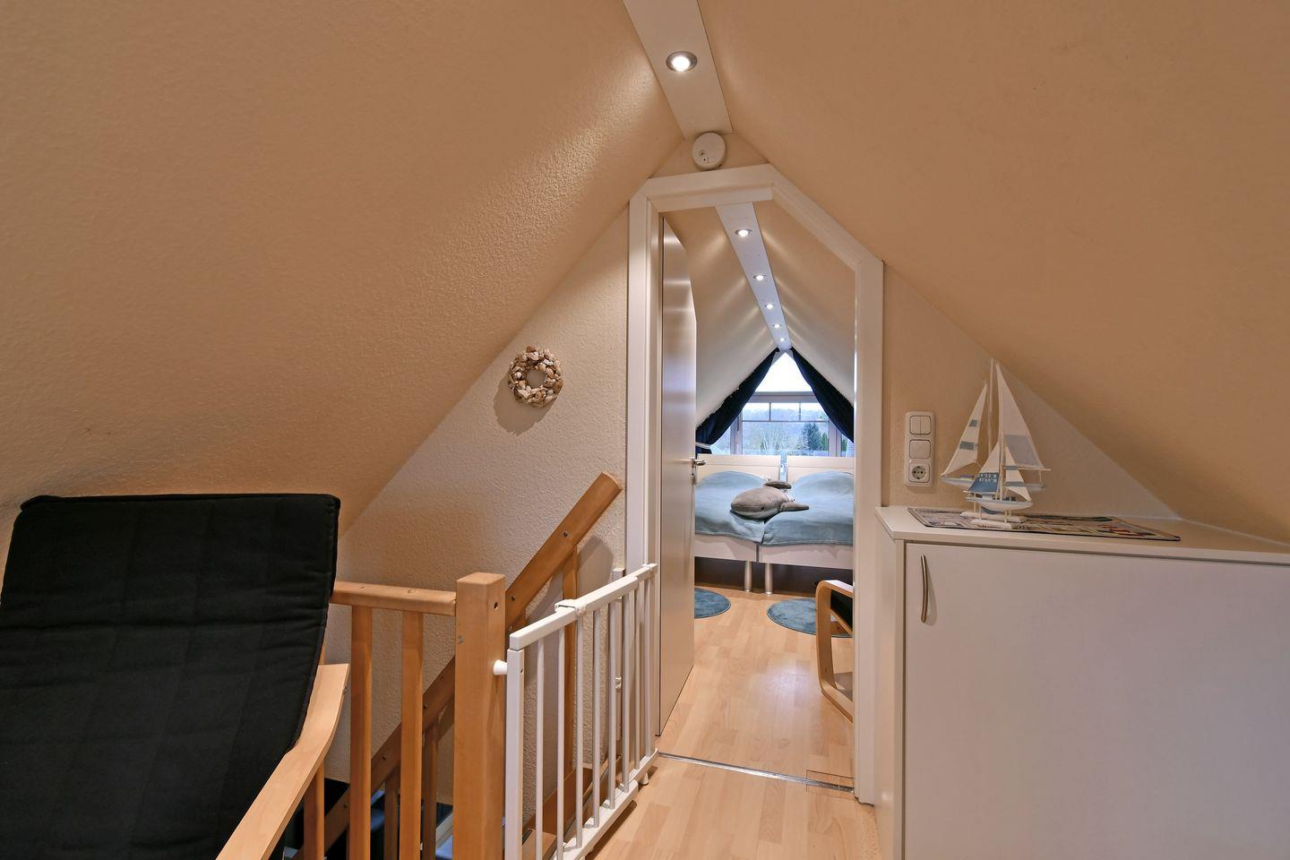 Vom Wohnraum aus gelangen Sie über eine Holztreppe in die 2. Wohnebene. Die Treppe führt direkt in das Doppelbettzimmer, welches durch eine Tür von dem Zimmer mit den zwei Einzelbetten und dem Fernseher getrennt ist.