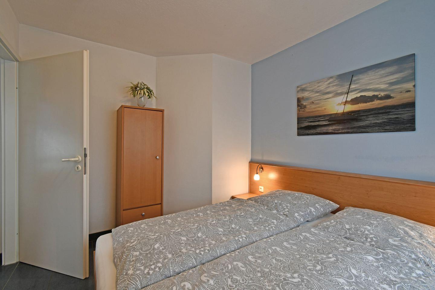 Diese Ferienwohnung liegt in luftiger Höhe im 3. OG, von der Straße abgewandt und ist für zwei Personen bestens geeignet. Der Fahrstuhl erleichtert den Ein- und Auszug und Ihr Auto ist in der Tiefgarage sicher abgestellt. Neben einem mit Fächern und Schubladen versehenen Schrank im Schlafzimmer gibt es im Eingangsbereich einen großen Wandschrank und die Garderobe. Im offenen Wohnzimmer befindet sich eine gemütliche Eck-Couch, ein Flach-TV und ein Sideboard. Der Essplatz ist mit vier Stühlen ausgestattet und die Küche bietet den nötigen Komfort. Das Doppelbett im Schlafzimmer besteht aus zwei getrennten Matratzen.