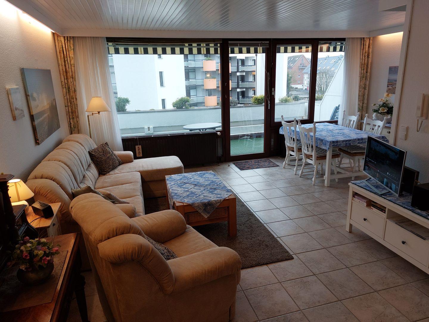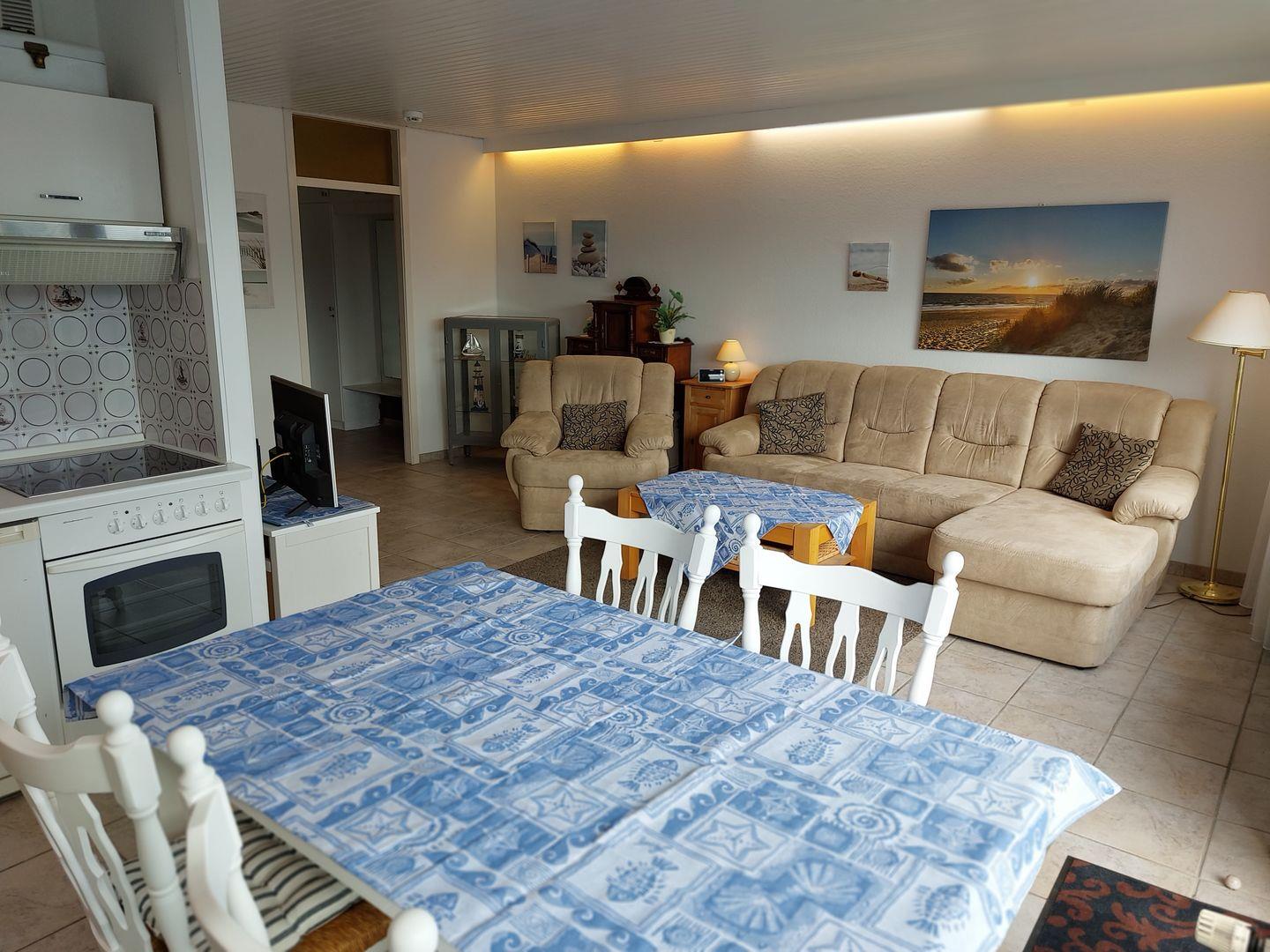 Das 58 qm große 2-Zimmer-Appartement liegt im 3.OG und ist mit dem Lift bequem zu erreichen. Im Wohnzimmer steht eine große Couchgarnitur, die zu einer weiteren Schlafmöglichkeit für eine weitere Person umgewandelt werden kann, nebst einem Sessel, Sekretär, Vitrine, Couchtisch, Flachbild-TV (Smart TV/Internetfähig) und Radio. Die große Sonnenterrasse hat eine Markise, liegt in Südwestlage und bietet einen seitlichen Blick aufs Meer. Der separate Schlafraum hat kein Fenster und ist mit zwei Einzelbetten ausgestattet. In der integrierten Einbauküche finden Sie E-Herd, Spülmaschine und Mikrowelle nebst Essplatz. Das Badezimmer verfügt über eine Runddusche, Waschtisch und WC. Das Rauchen und die Tierhaltung sind nicht erlaubt, wir bitten um Beachtung. Der PKW-Außenstellplatz ist inklusive. Waschmaschine und Trockner im Haus sind gegen Gebühr nutzbar.