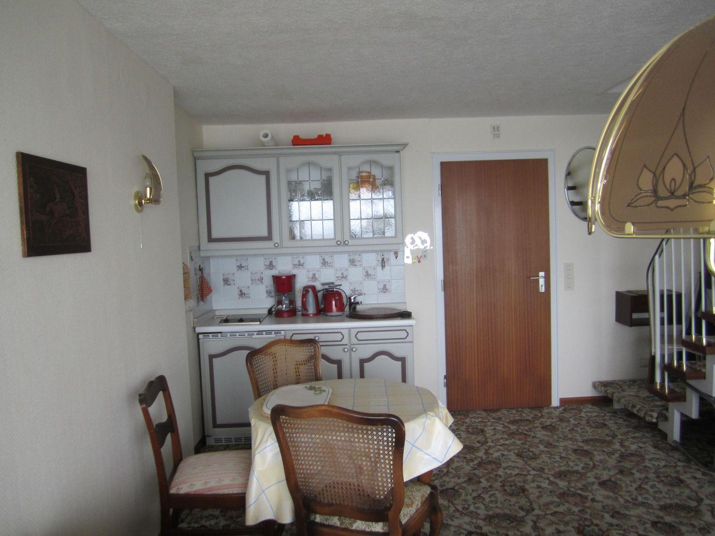 Das ca. 55 m² große 2-Zimmer-Maisonette-Appartement geht über die 3. und 4.Etage (kleiner Lift vorhanden). Auf der ersten Wohnebene befinden sich das Wohnzimmer mit einem Polstersofa, welches zum Schlafsofa für 1 Person umwandelbar ist, nebst 2 Sessel, Couchtisch, Flachbild-TV, Radio mit CD-Player und eine Vitrine. Die offene Pantryküche ist gut ausgestattet und der Essplatz bietet Platz für 3 Personen. Sie haben einen tollen Meerblickbalkon mit Balkonmöbeln und einer Markise.