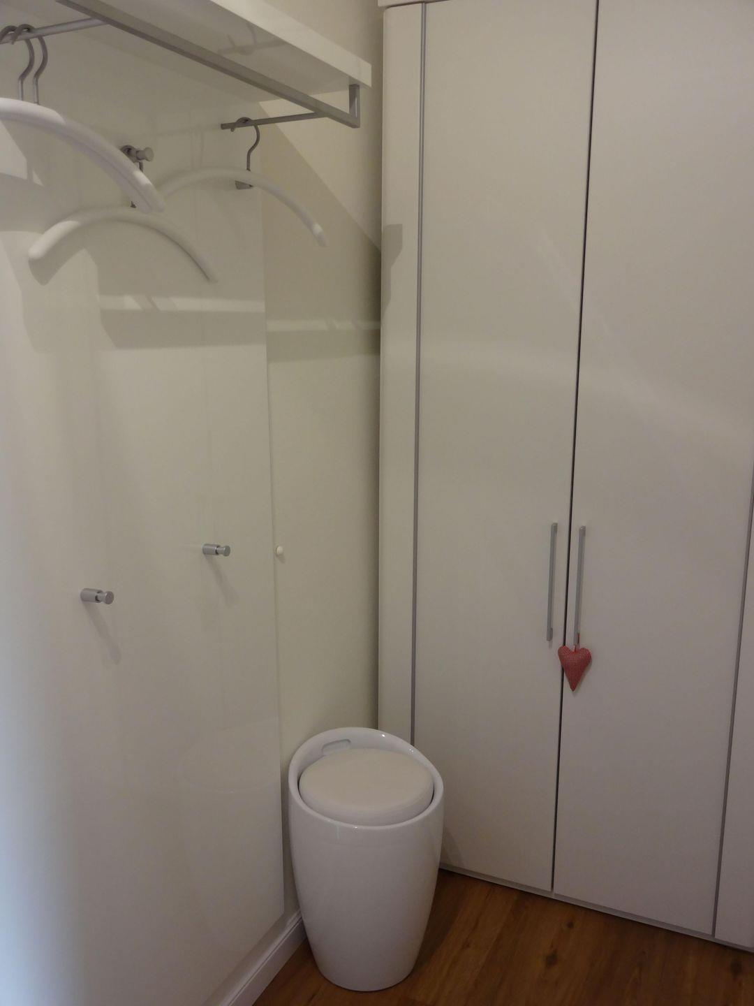 Im Flurbereich befindet sich neben der Garderobe ein weißer Dielenschrank.