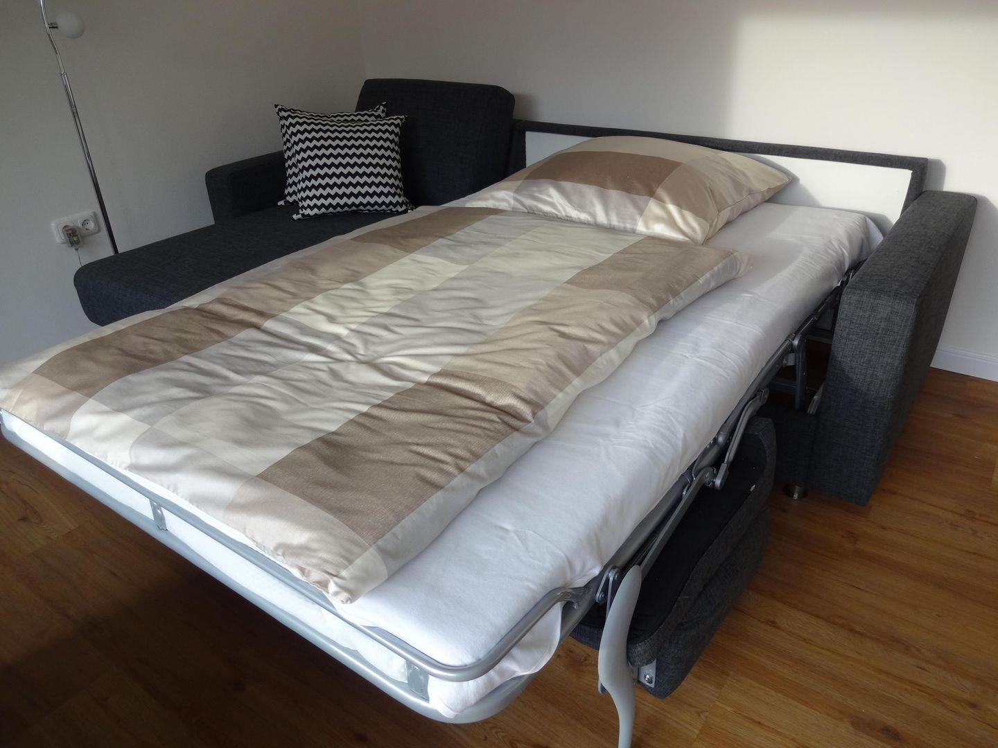 Die Couch im Wohnbereich hat ein langes Fußteil, welches sich mit wenigen Handgriffen zu einer Schlaffläche mit durchgehender Matratze (120 cm x 200 cm) ausziehen lässt. Neben den Rollos kann das Wohnzimmer auch mit einer Gardine verdunkelt werden. Die Ferienwohnung hat einen Flachbildschirm-Fernseher und eine Musikanlage mit CD- und MP3-Player.