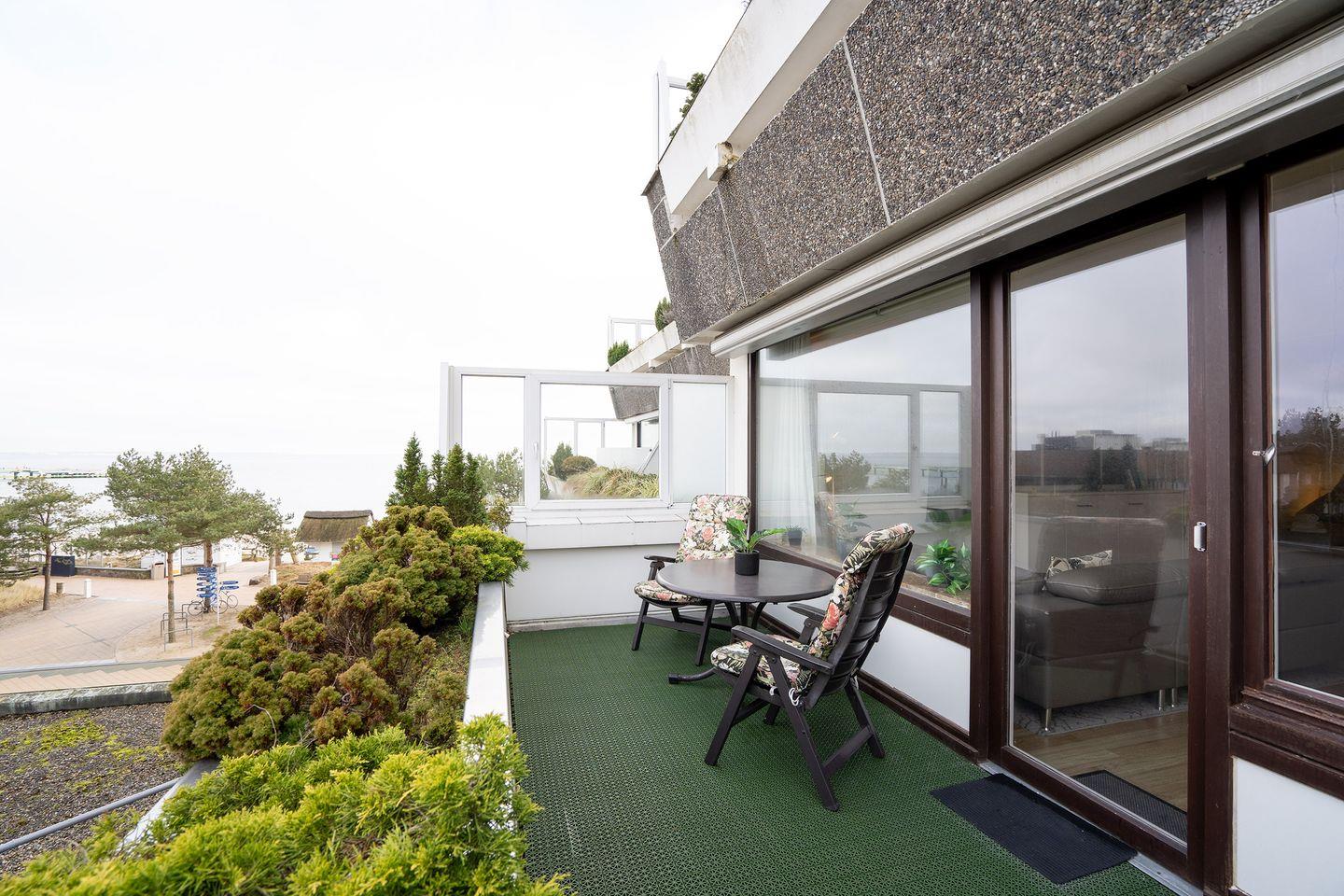 Das ca. 58 qm große Appartement liegt im 2. OG und ist bequem mit dem Lift erreichbar. Die große Sonnenterrasse bietet einen schönen Blick auf das Meer und ist mit einer Markise und Balkonmöbeln ausgestattet.
