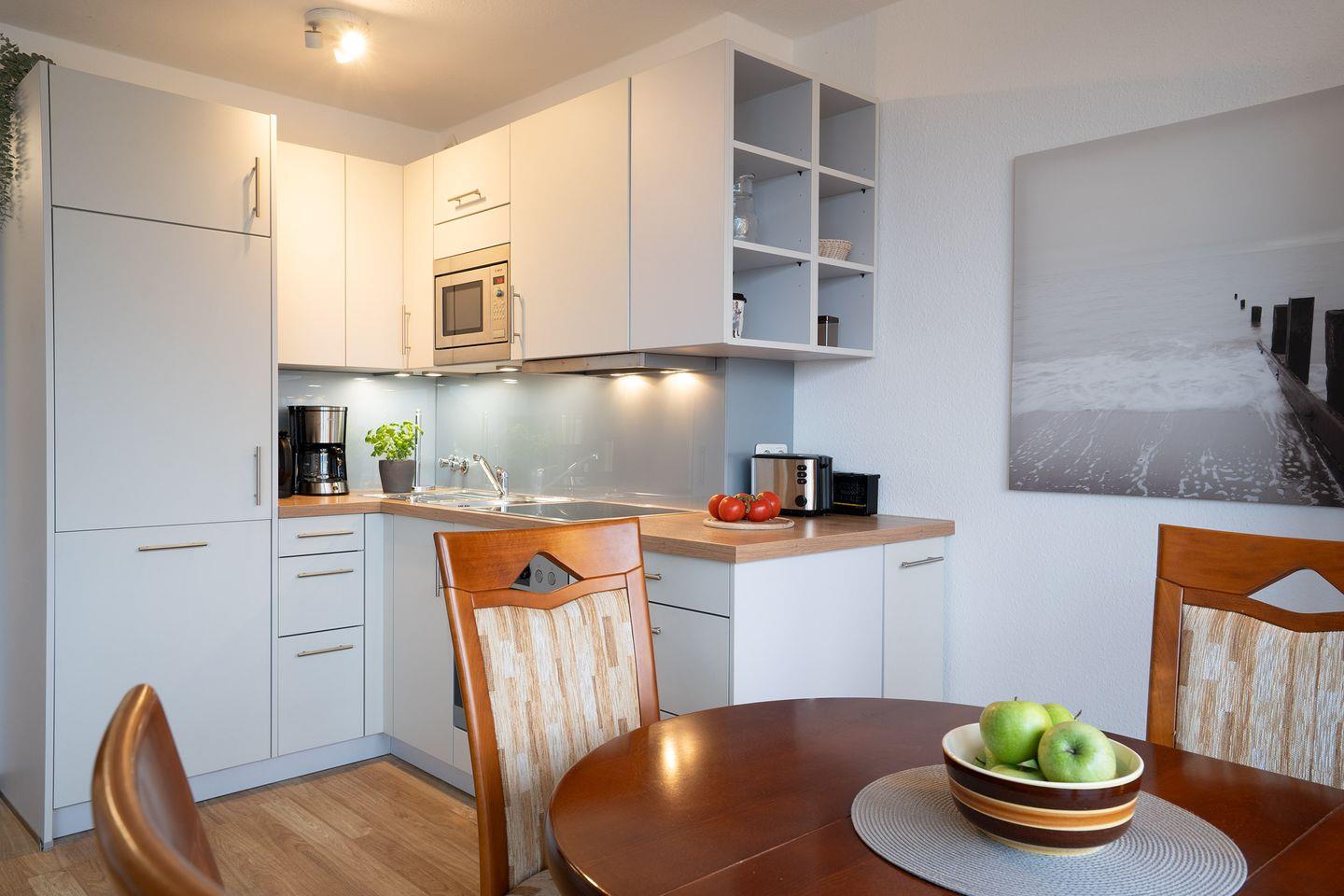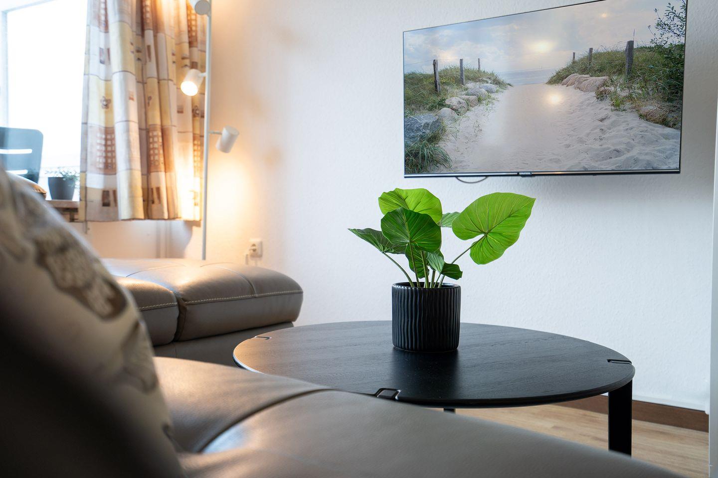 Der Wohnraum ist mit einem Designbodenbelag in Holzoptik ausgelegt. Es gibt eine Ledergarnitur mit einem Sessel, Couchtisch, Flachbild-TV, sowie ein Schrankbett. Die WLAN-Nutzung ist inkl. (bei Störung kein Ersatzanspruch). In der Einbauküche befindet sich ein Geschirrspüler, eine Mikrowelle, sowie einen Ofen. Am Essplatz ist Platz für drei Personen.