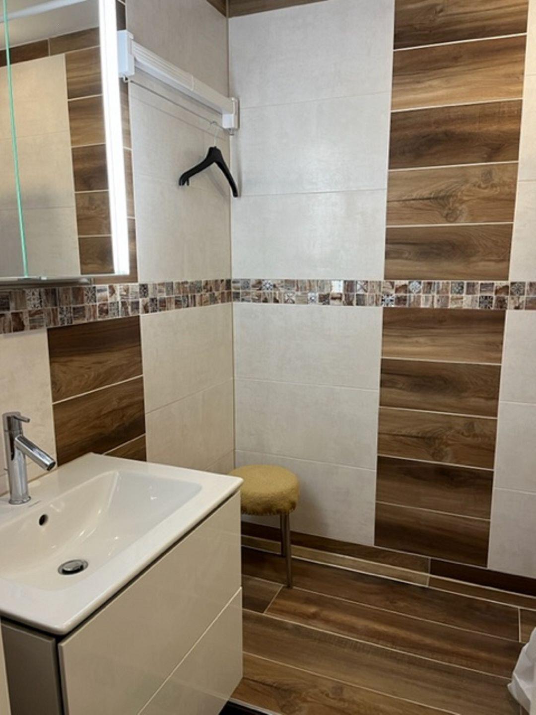 Das renovierte Badezimmer verfügt über eine Dusche, Waschtisch, WC und Handtuchwärmer. Abgerundet wird das Bad durch die neue Fußbodenheizung.