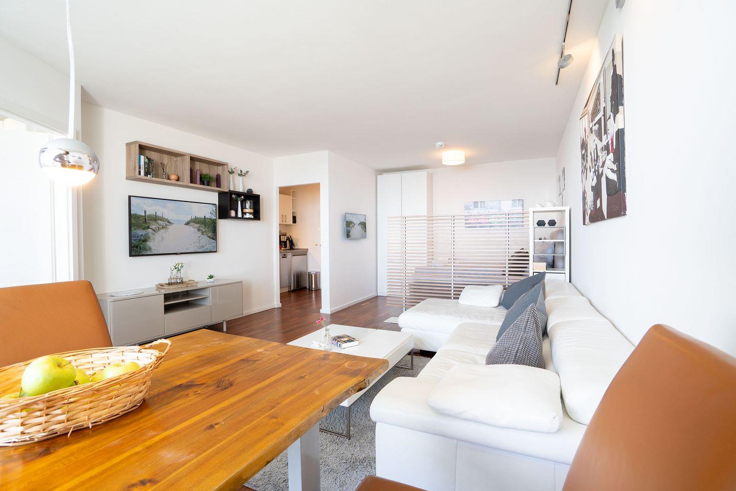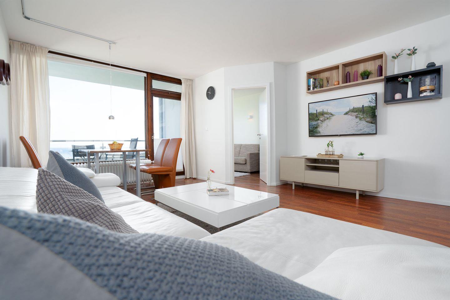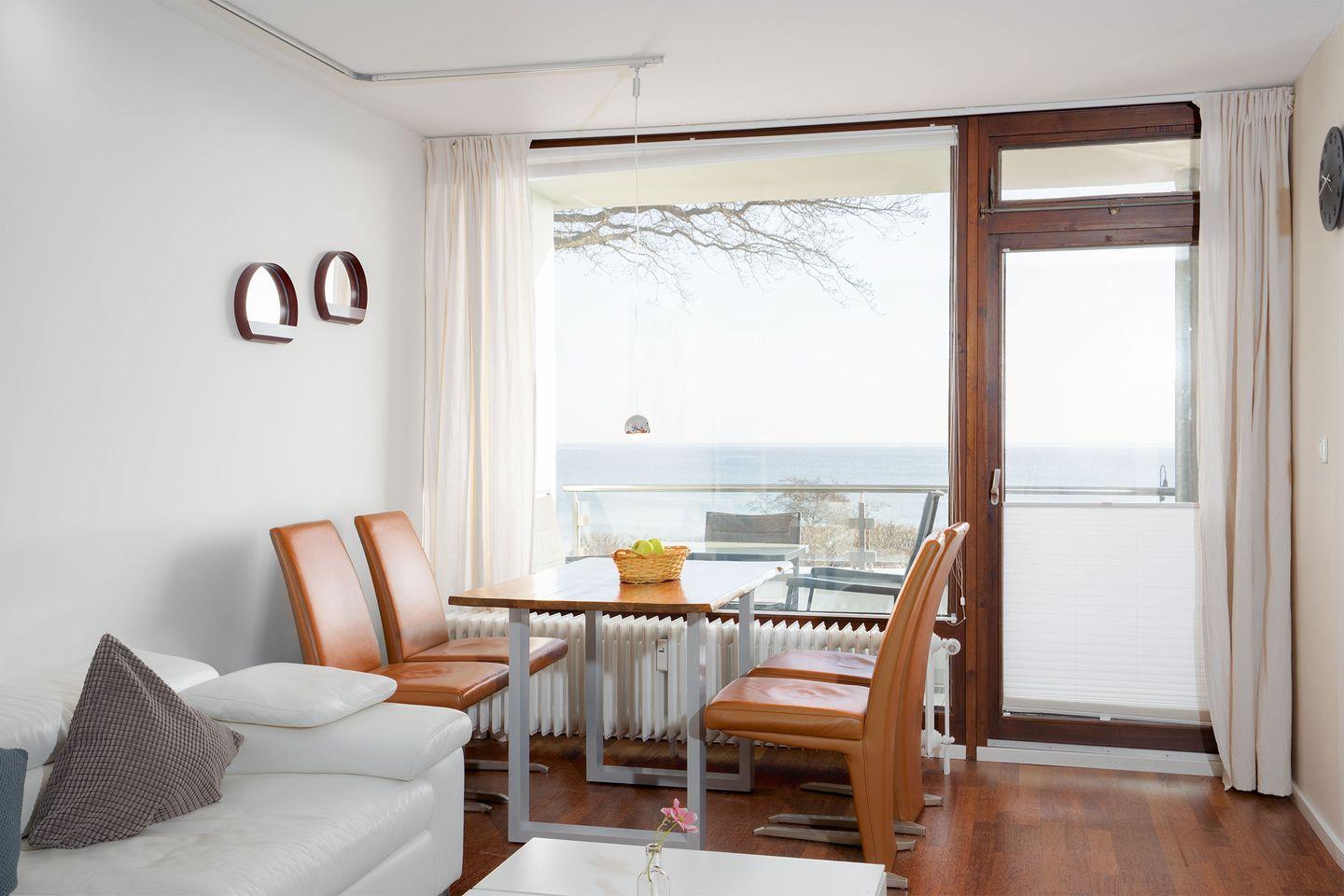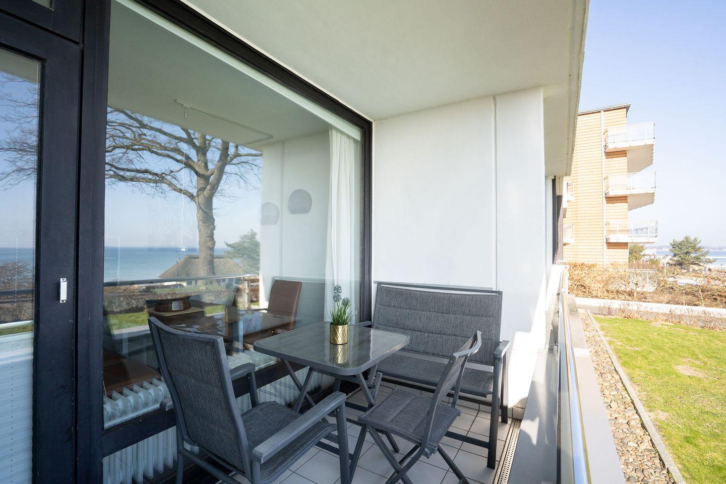 Das Appartement bietet 100 % Meerblick von der Wohnung und vom Balkon. Die Wohnung ist nach Osten gerichtet, somit hat man bis zum Mittag die Sonne auf dem Balkon. Die Meerblick-Appartements sind sehr beliebt und schnell belegt. Das Appartement verfügt über: